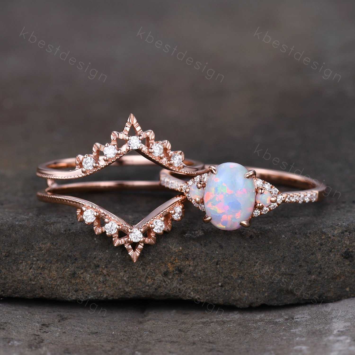 This is a beautiful lab created white fire Opal engagement ring set in rose gold. Oval Opal Engagement Ring Set, Rose Gold Rings for Women, Art Deco Moissanite Stacking Band, Unique Curved Wedding Band, Bridal Promise Ring.