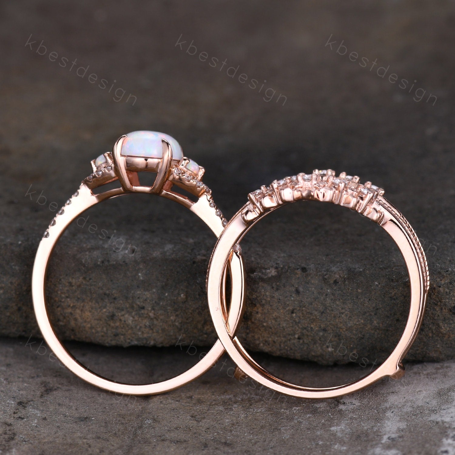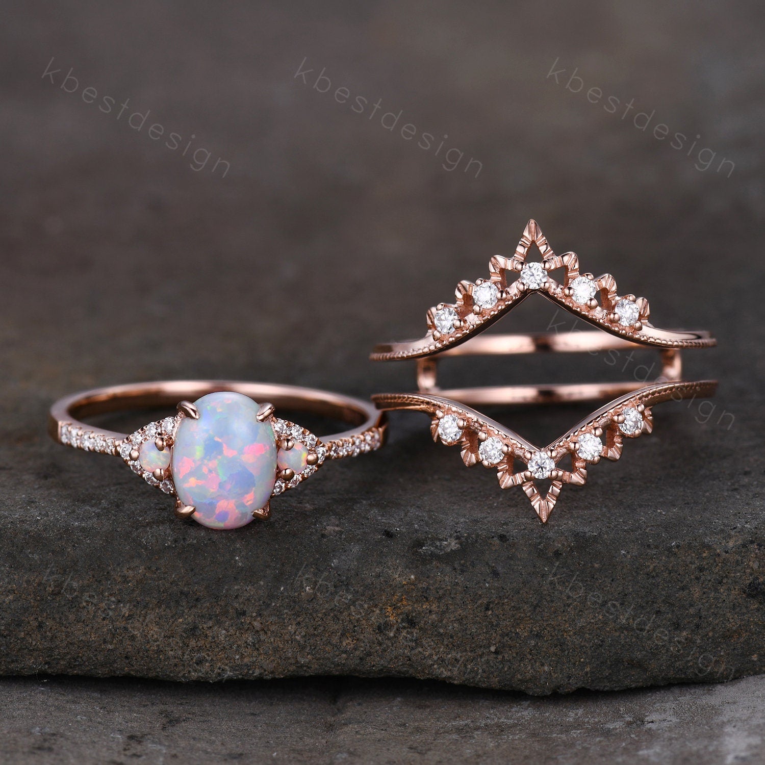 Oval Opal Engagement Ring Set, Rose Gold Rings for Women, Art Deco Stacking Band, Unique Double Curved Wedding Band, Bridal Promise Ring