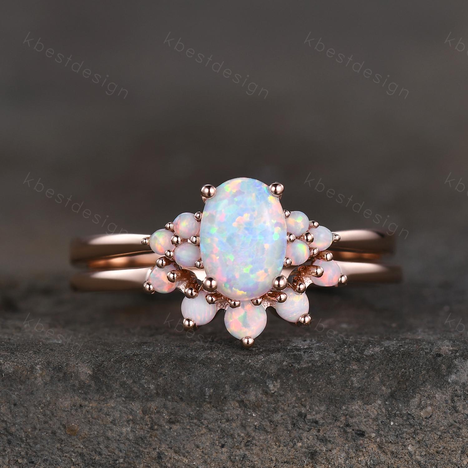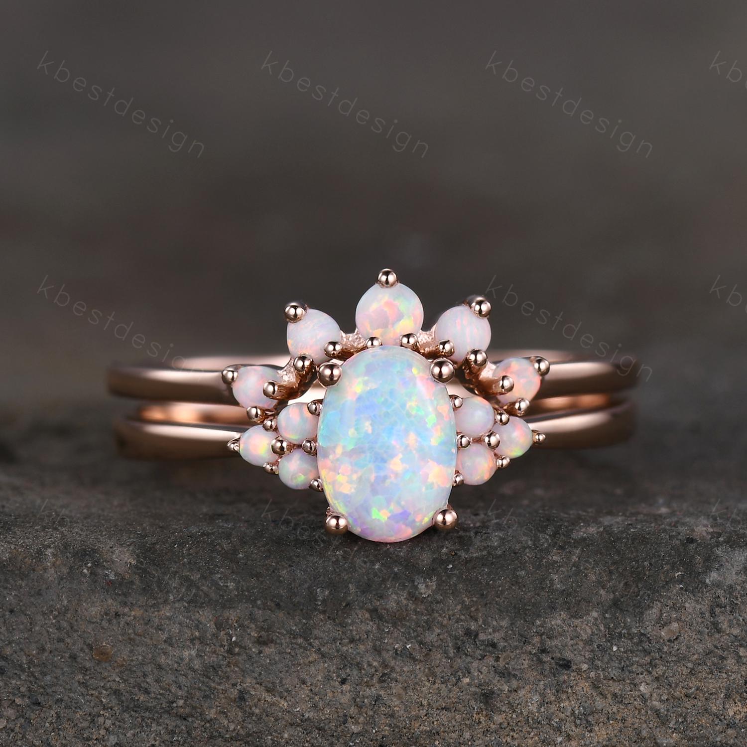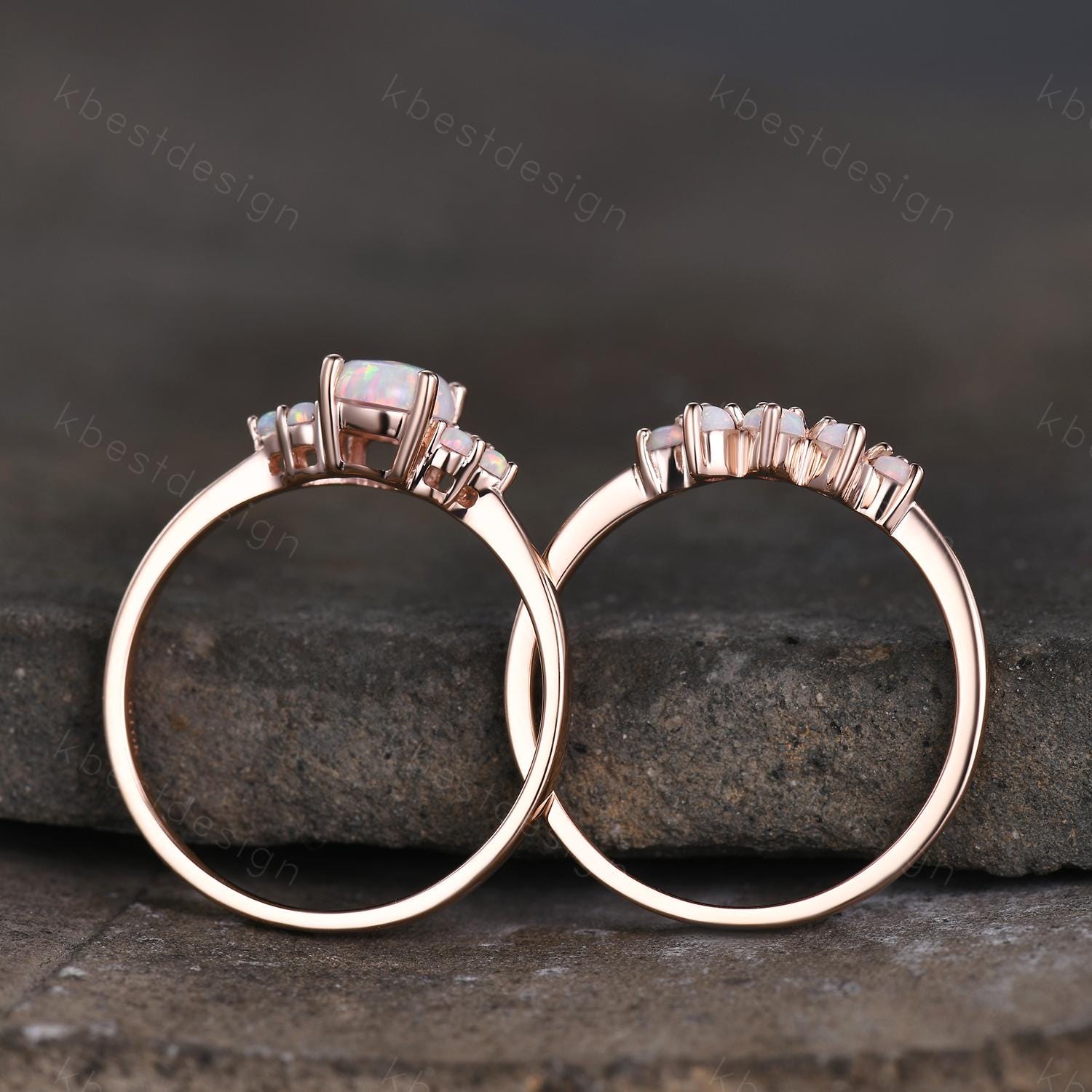 This is a beautiful Oval shaped Opal engagement ring set rose gold opal ring vintage curved wedding ring October birthstone ring unique bridal wedding set.