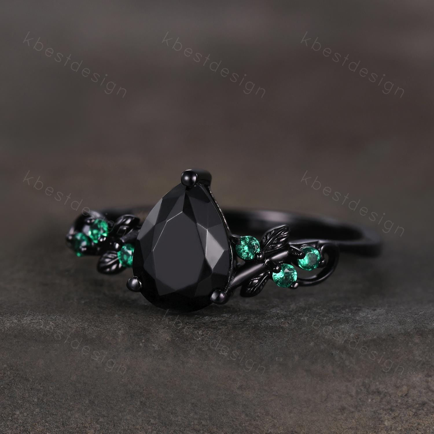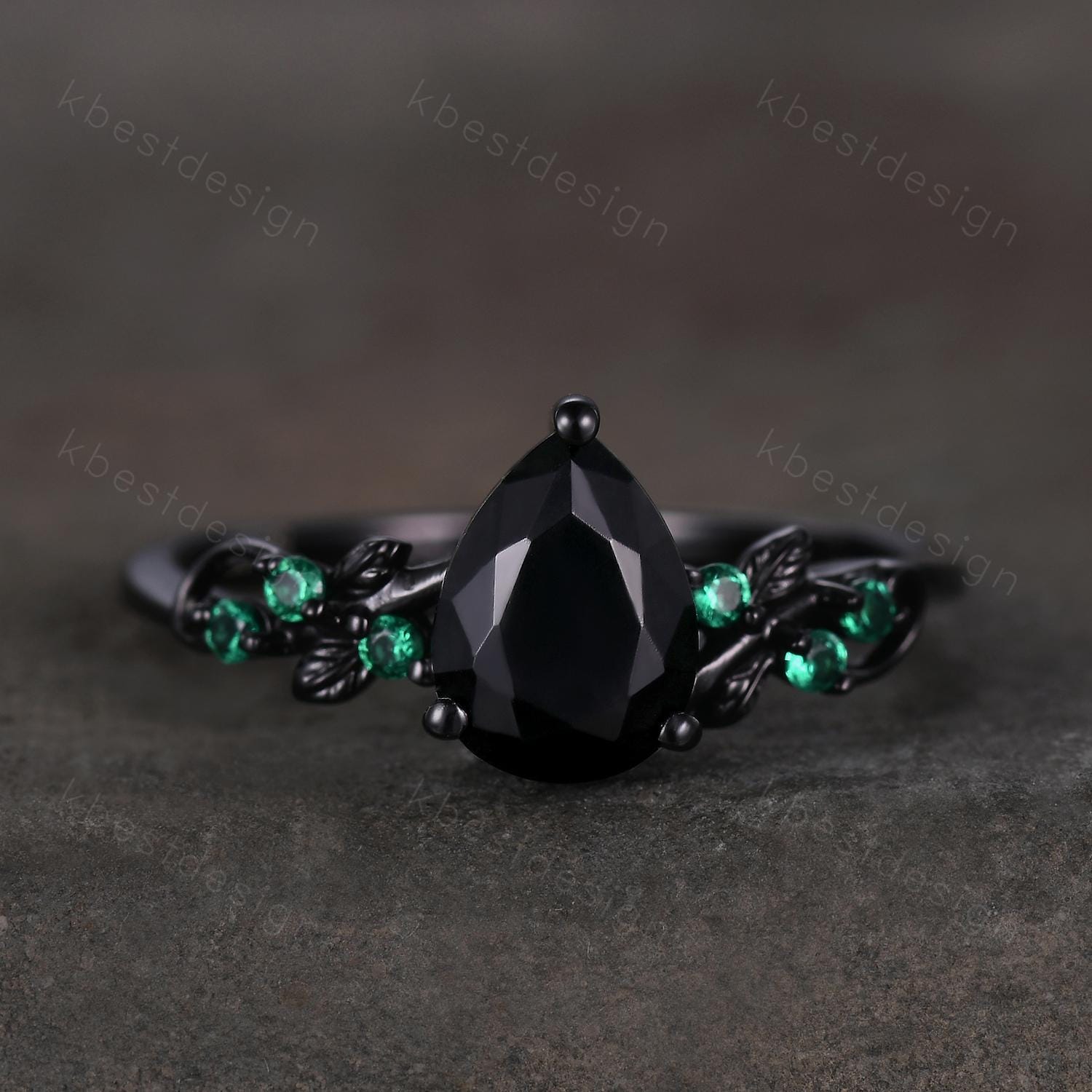 Pear cut black onyx engagement ring Black gold ring Art deco leaf design emerald wedding ring nature inspired ring bridal promise ring.
