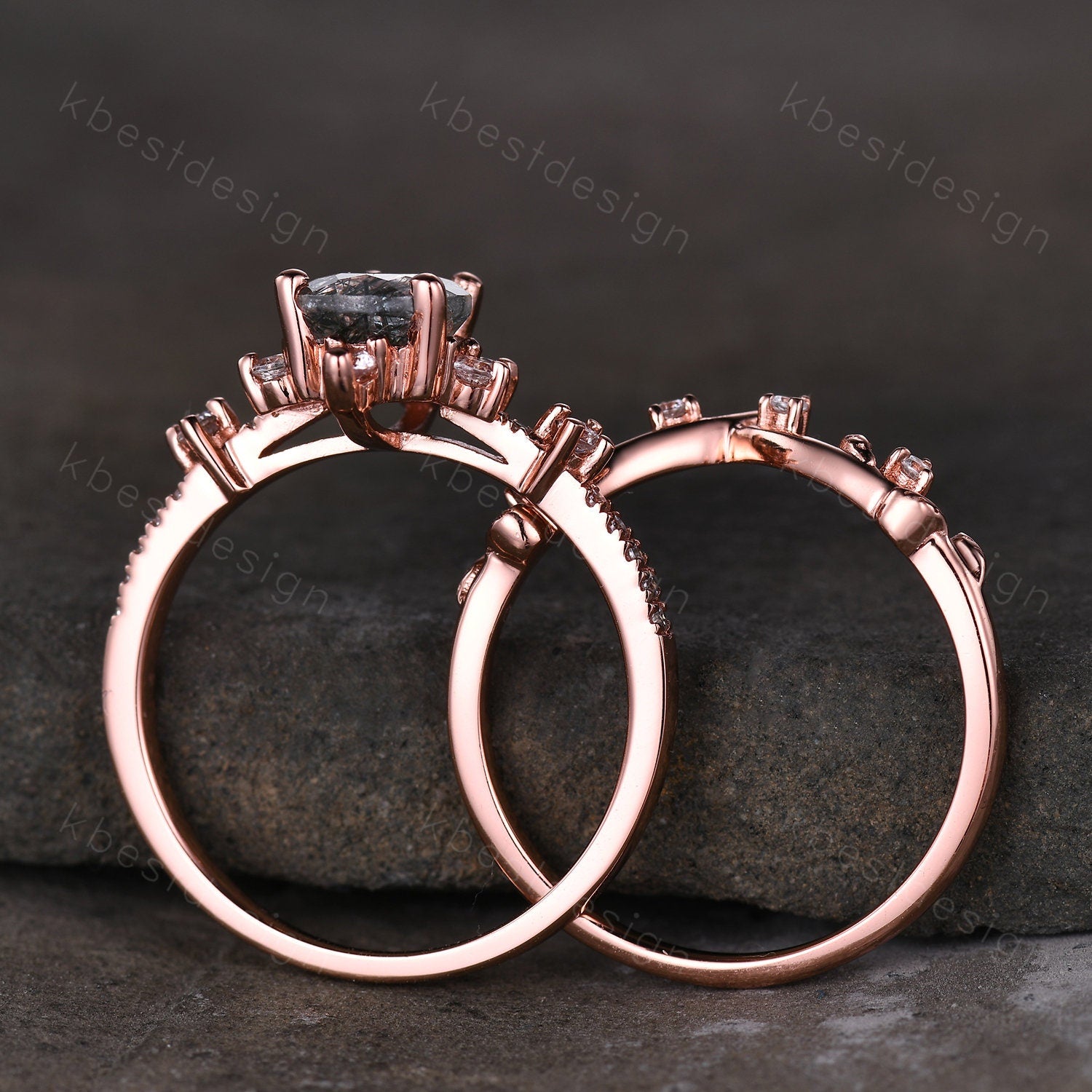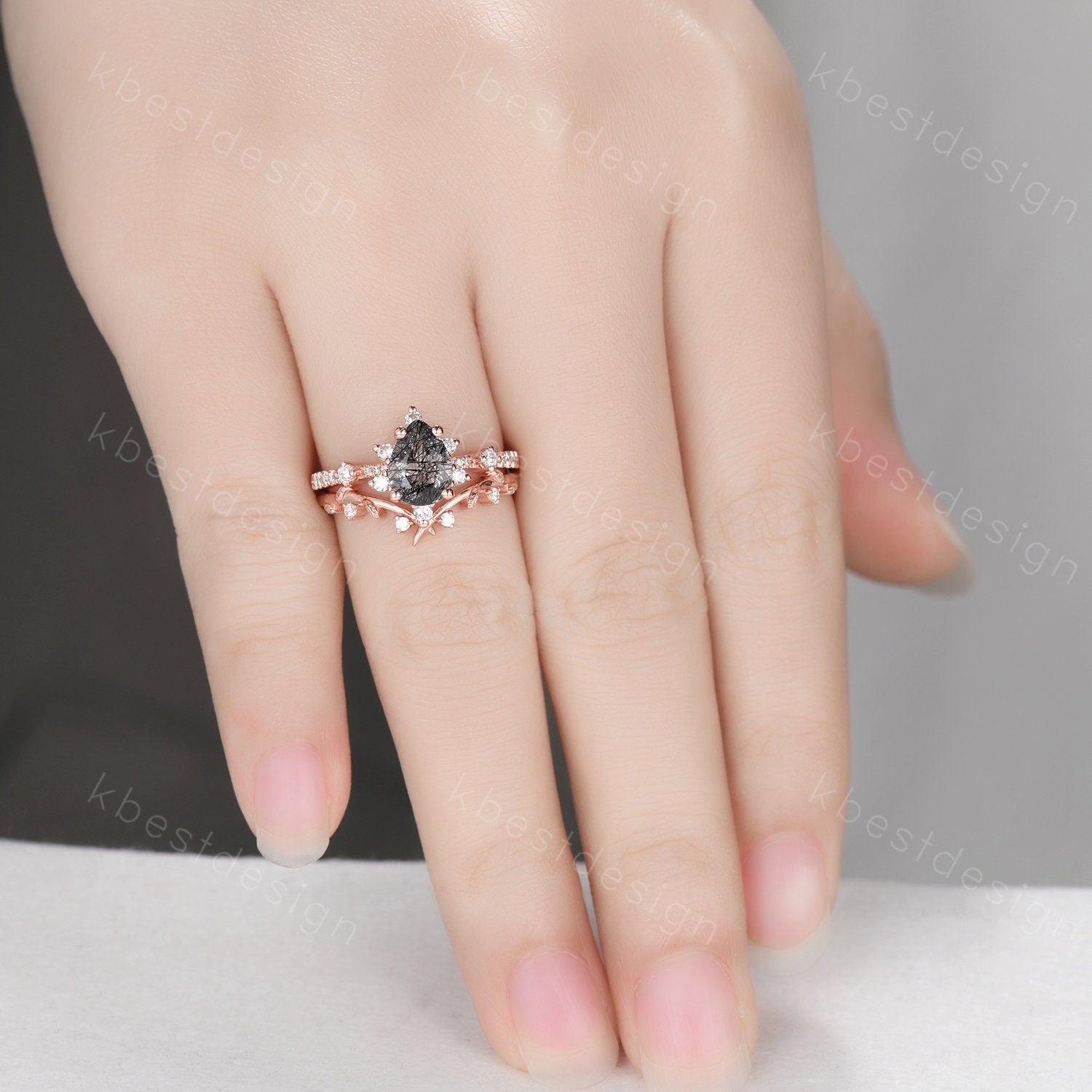 Pear cut black rutilated quartz engagement ring rose gold ring art deco twig leaf stacking band branch ring unique moissanite wedding set