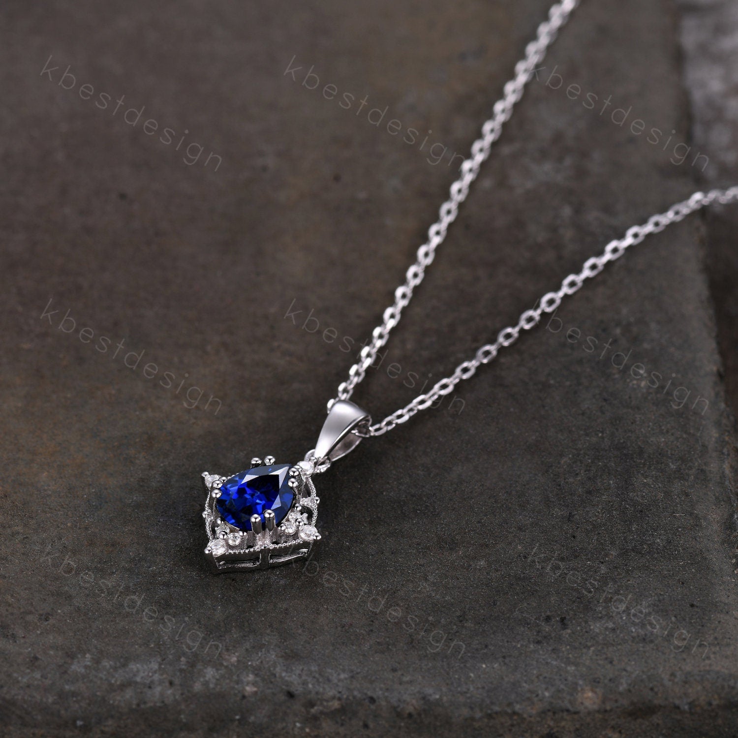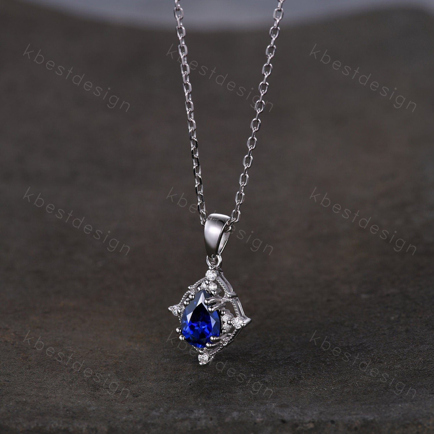 Pear cut Blue Sapphire Necklace Antique Art Deco Moissanite Pendant Necklace 14K White Gold Necklace for Women September Birthstone Jewelry