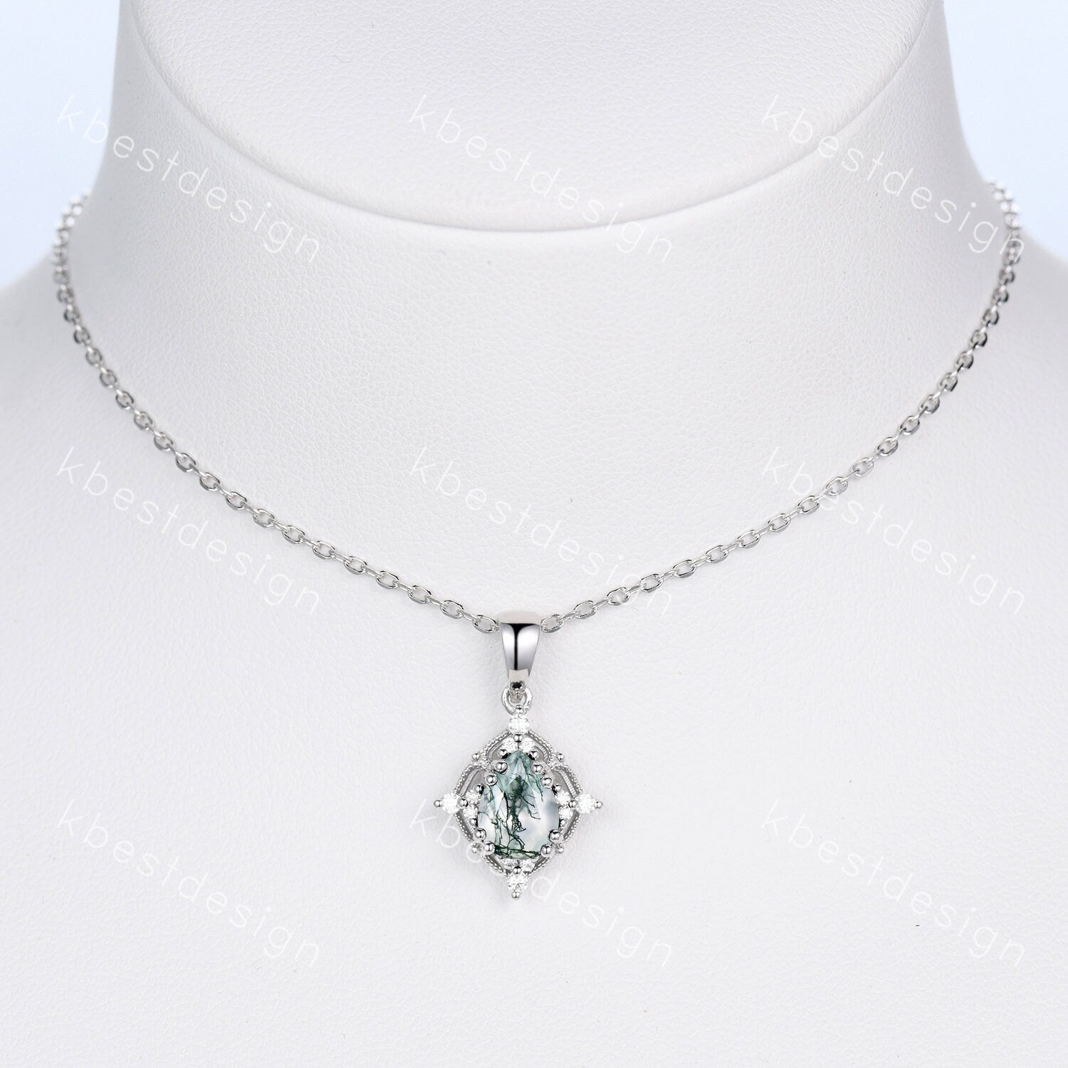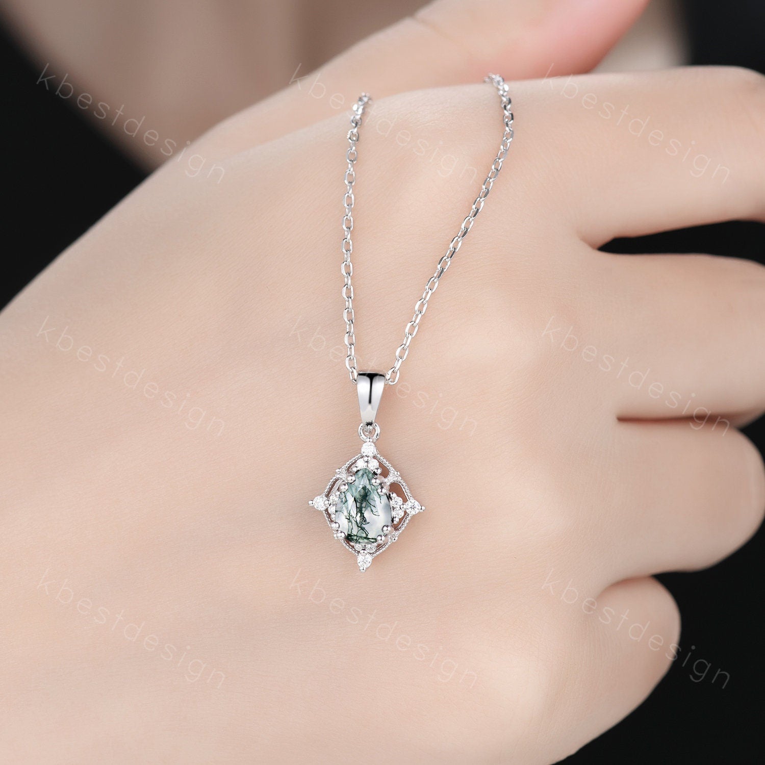 Pear cut natural moss agate necklace women sterling silver necklace pear cut green agate pendant unique art deco bridal promise gift