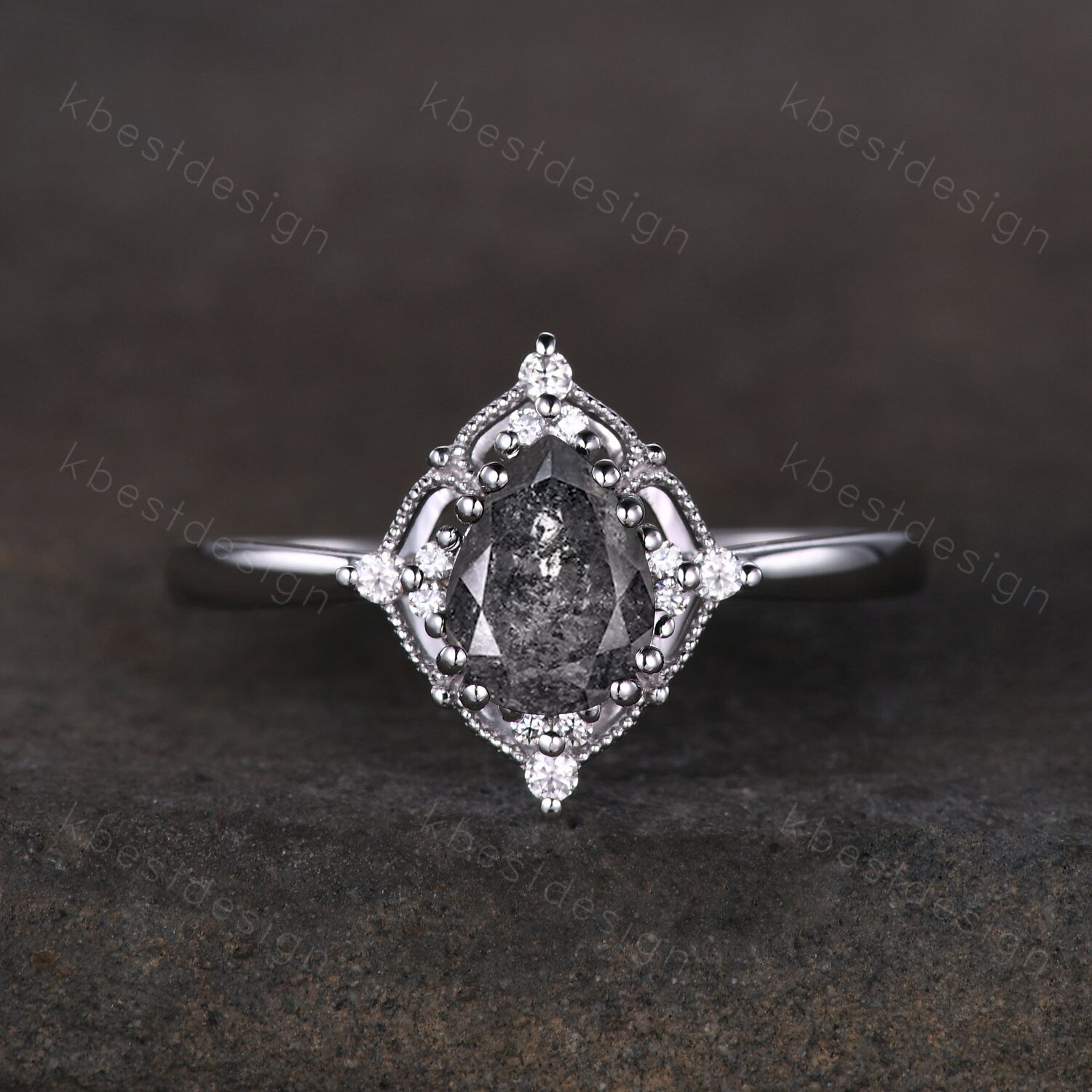 This is a Pear Cut Salt and Pepper Diamond Engagement Ring Unique Art Deco Moissanite Ring 14K White Gold Ring Black Gemstone ring Bridal Promise Ring.