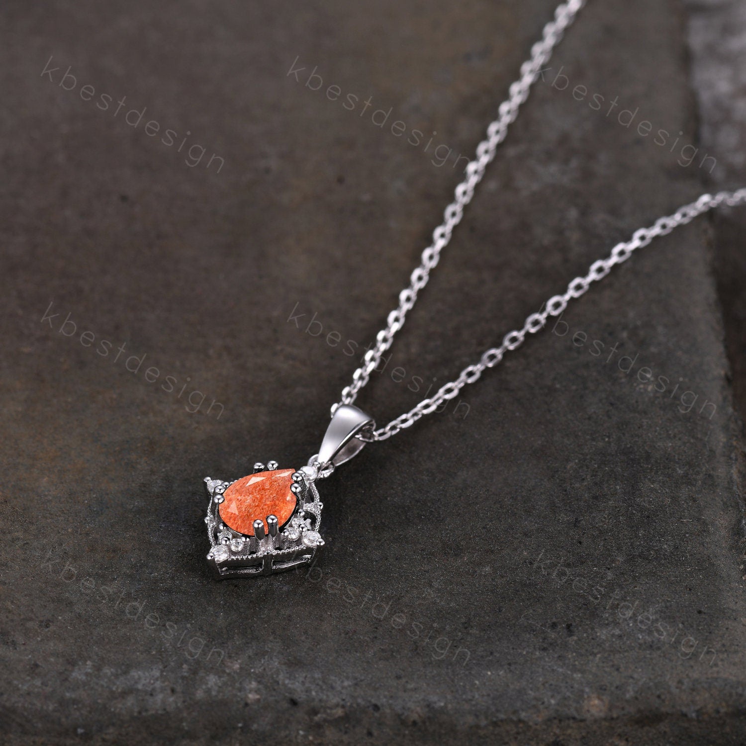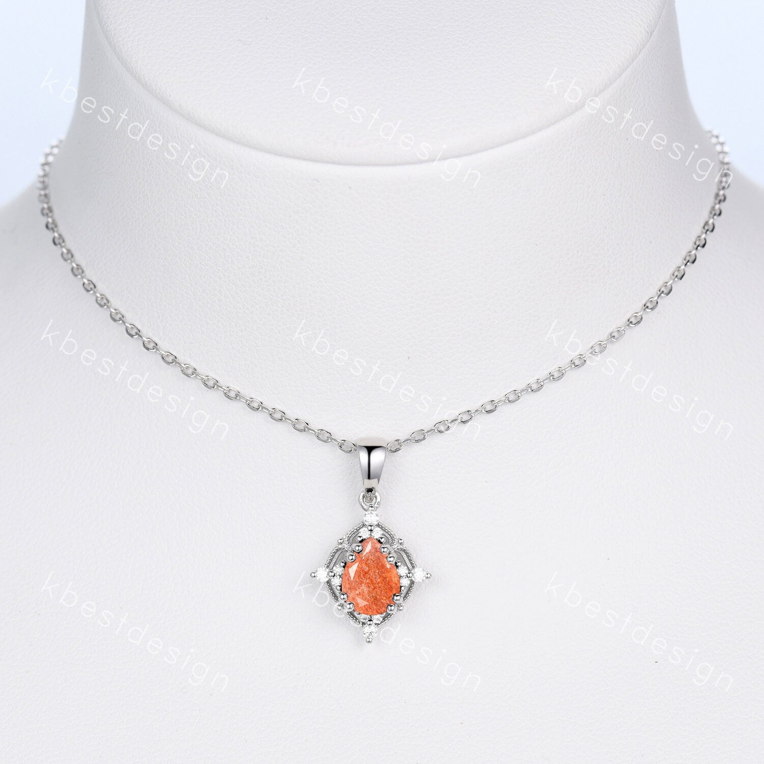 This is a Pear cut Sunstone Necklace Antique Art Deco Moissanite Pendant Necklace 14K White Gold Necklace for Women Birthday/Promise Gift for Her. For those who are looking for orange gemstone jewelry which is handcrafted in details, this unique sunstone necklace would be a perfect choice for you. Whether it be a Birthday gift for her, an anniversary gift her, or a celebration of yourself, this sunstone jewelry is the perfect gift from the heart.