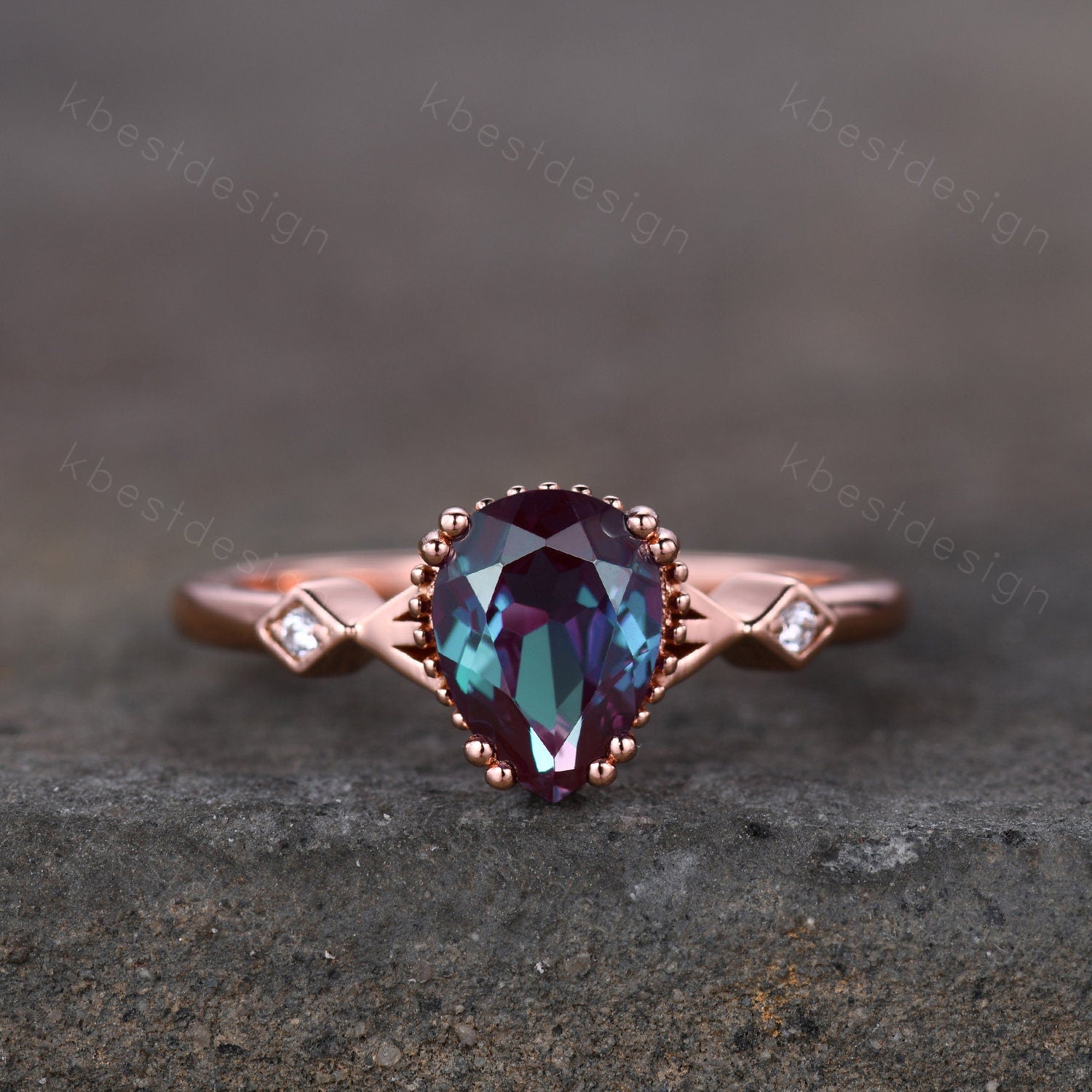 Pear shaped Alexandrite engagement ring vintage unique Alexandrite ring rose gold ring art deco milgrain bridal wedding ring June Birthstone