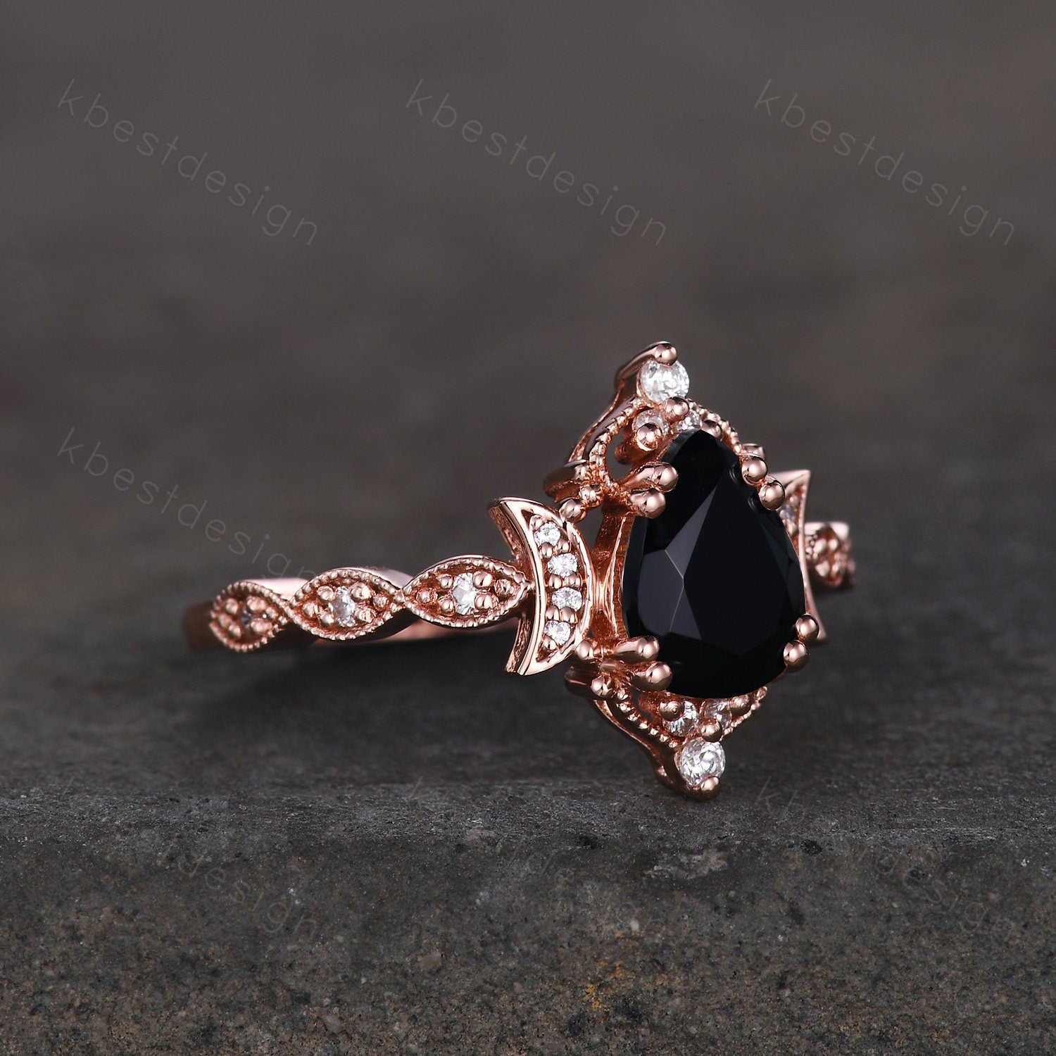 Pear shaped black onyx engagement ring unique moon style ring vintage art deco moissanite wedding ring Antique bridal Promise ring for her.