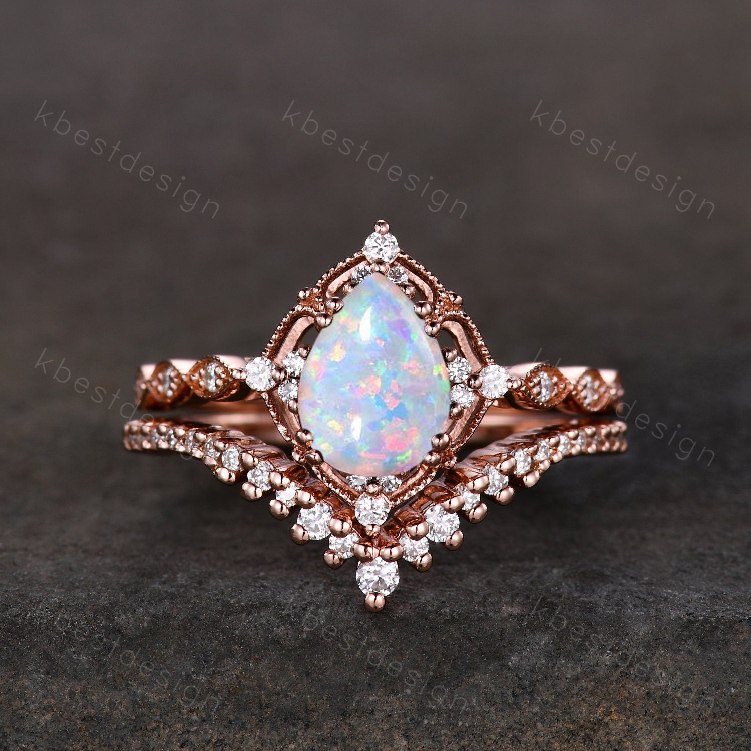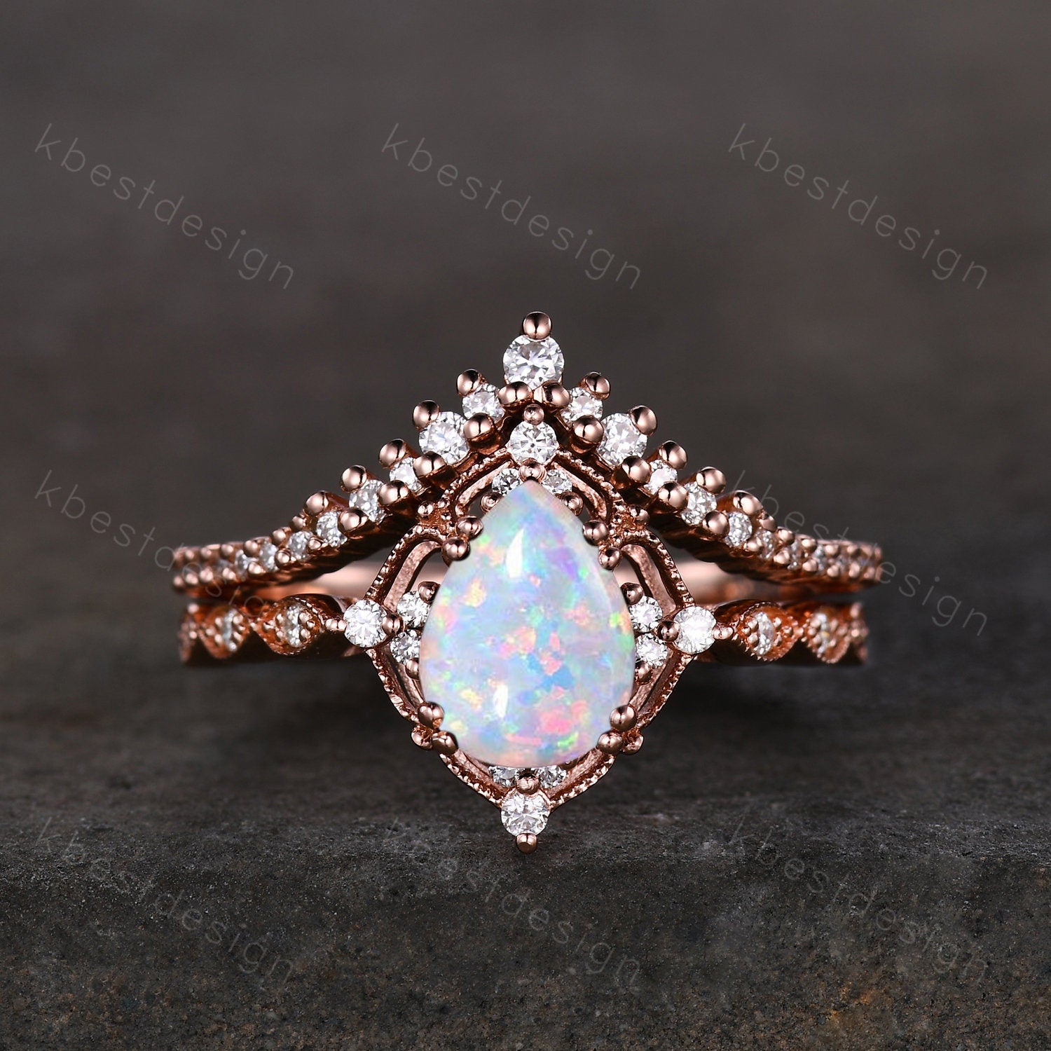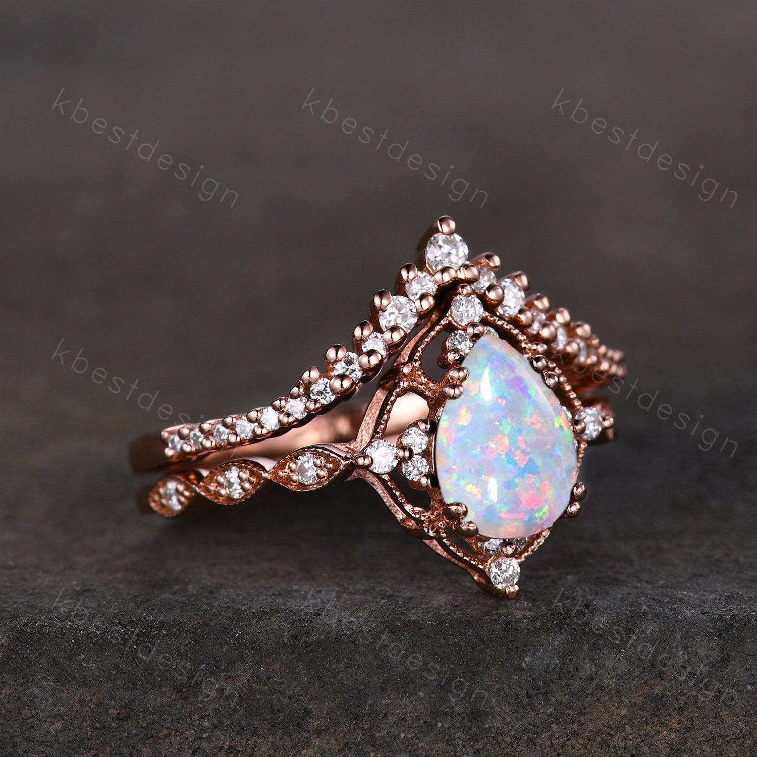 This is a beautiful Pear shaped Opal engagement ring set rose gold opal ring vintage moissanite wedding ring October birthstone ring unique bridal wedding set.