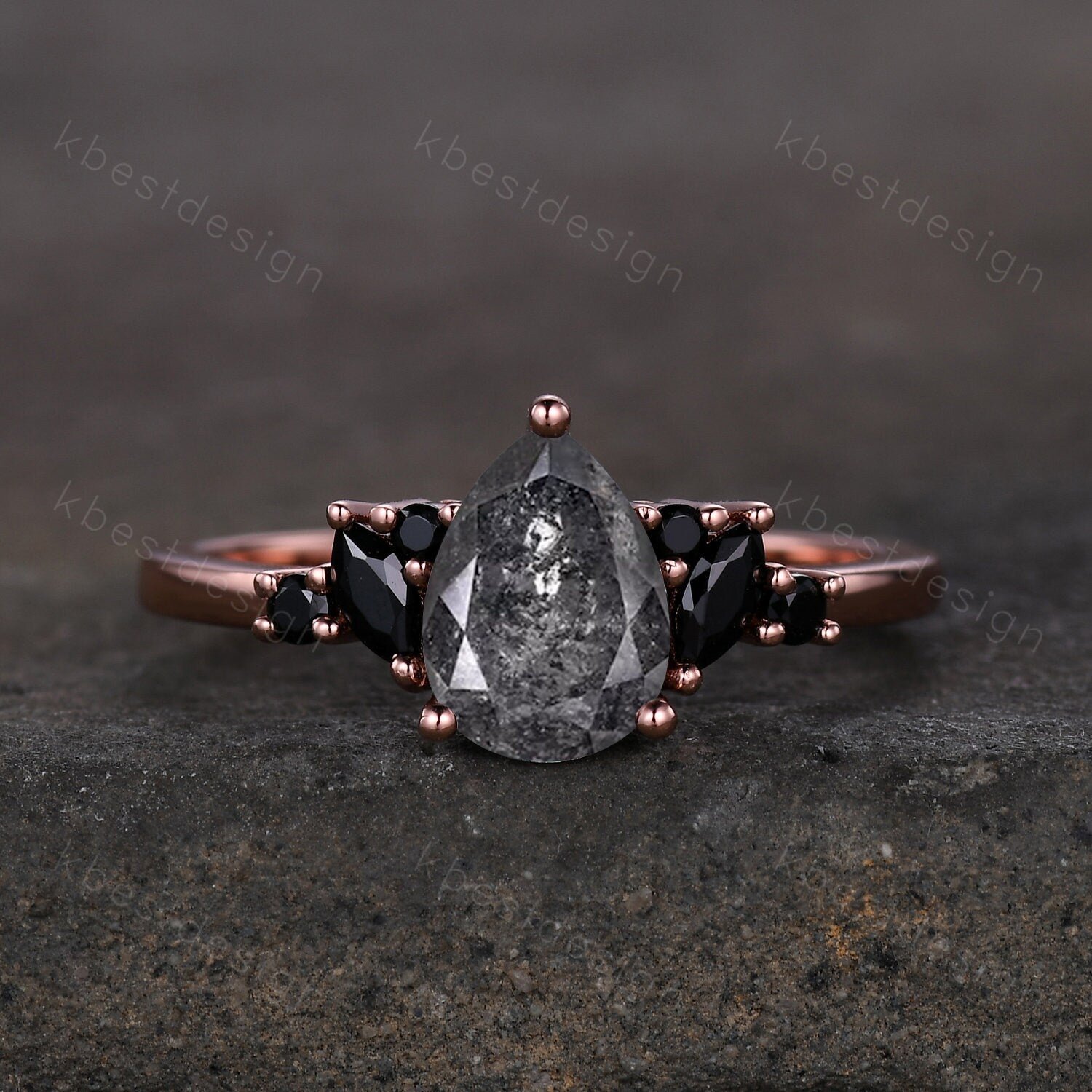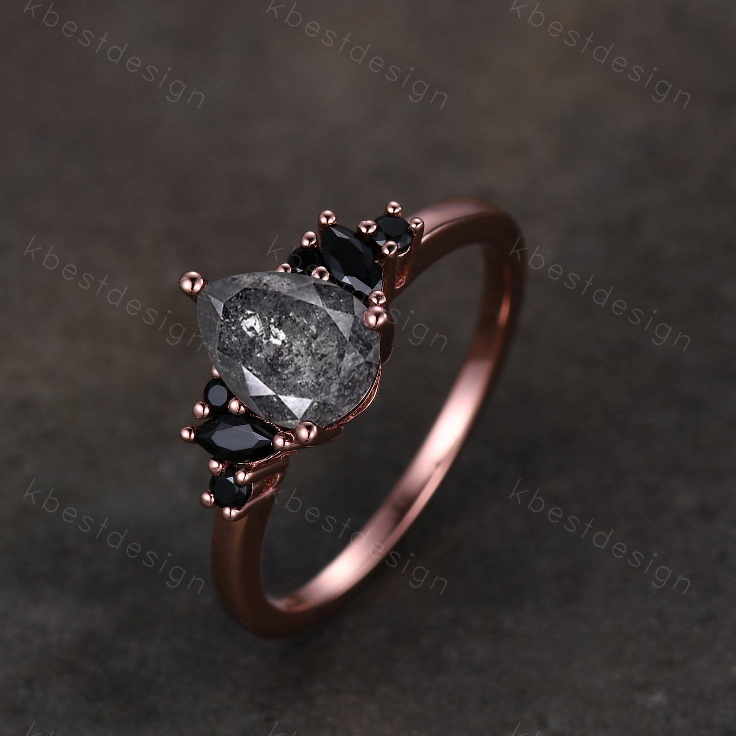 This is a Pear Shaped Salt and Pepper Diamond Engagement Ring Unique Black Spinel Cluster Ring Rose Gold Marquise cut Ring Black Stone Promise Ring.