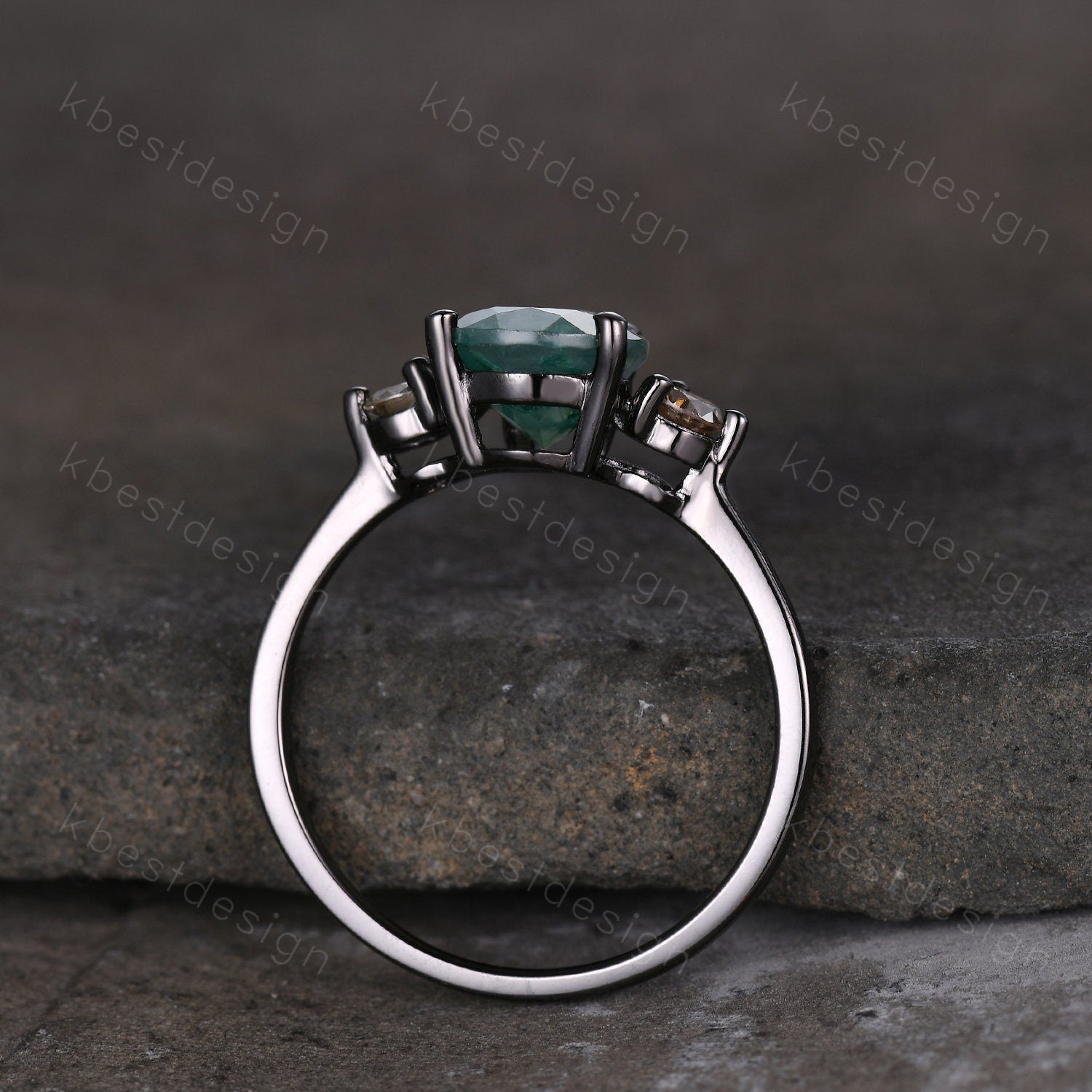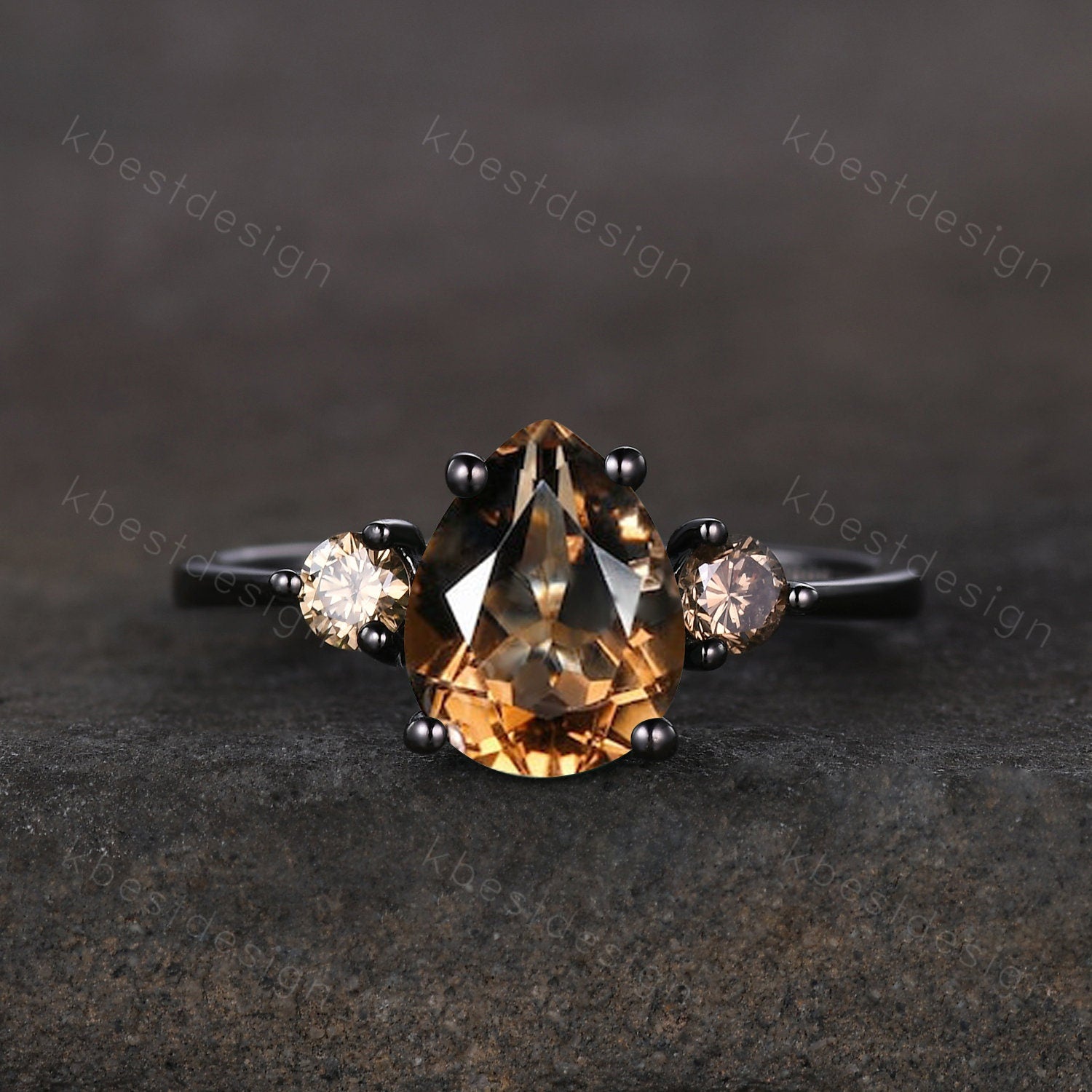Pear shaped smoky quartz Engagement Ring Black Gold three stone engagement ring Vintage champagne Diamond Wedding ring Bridal promise ring