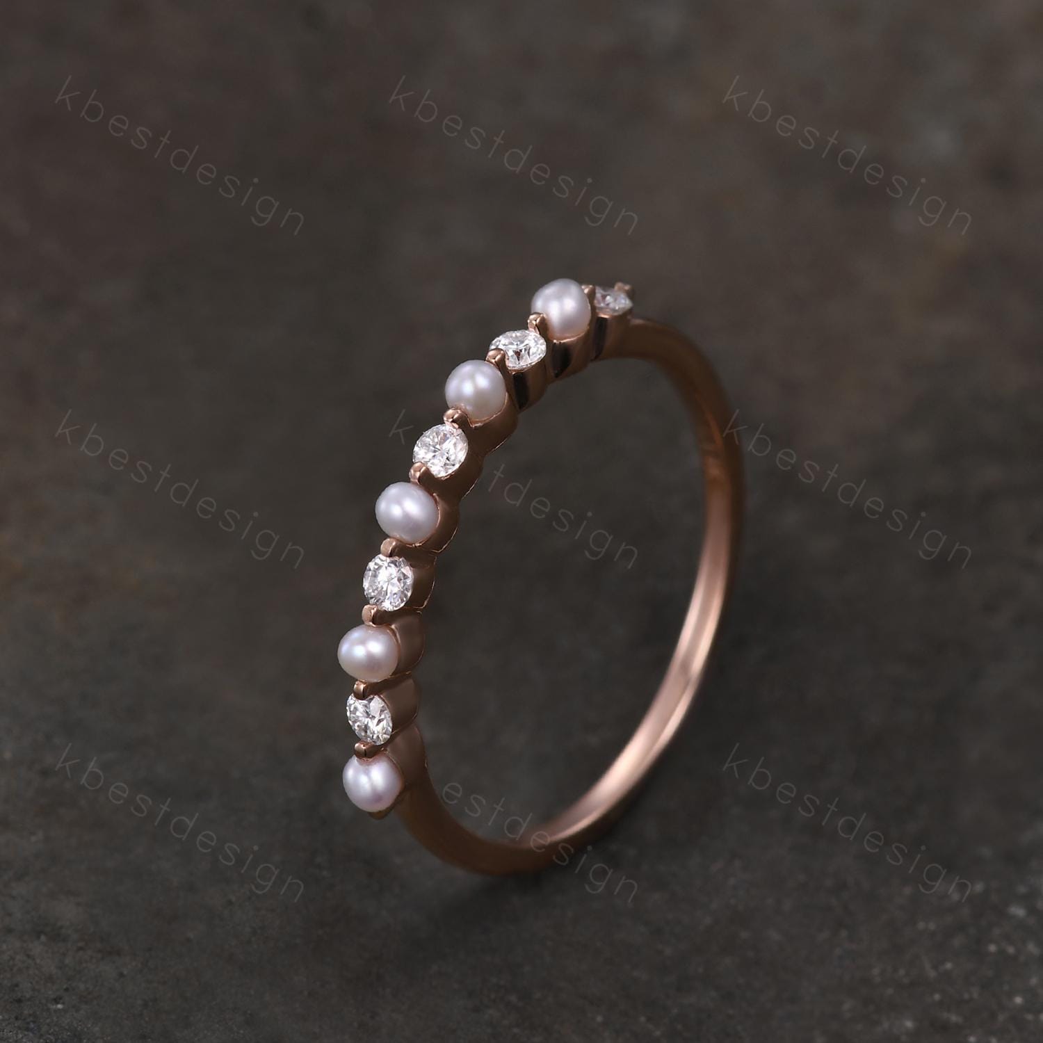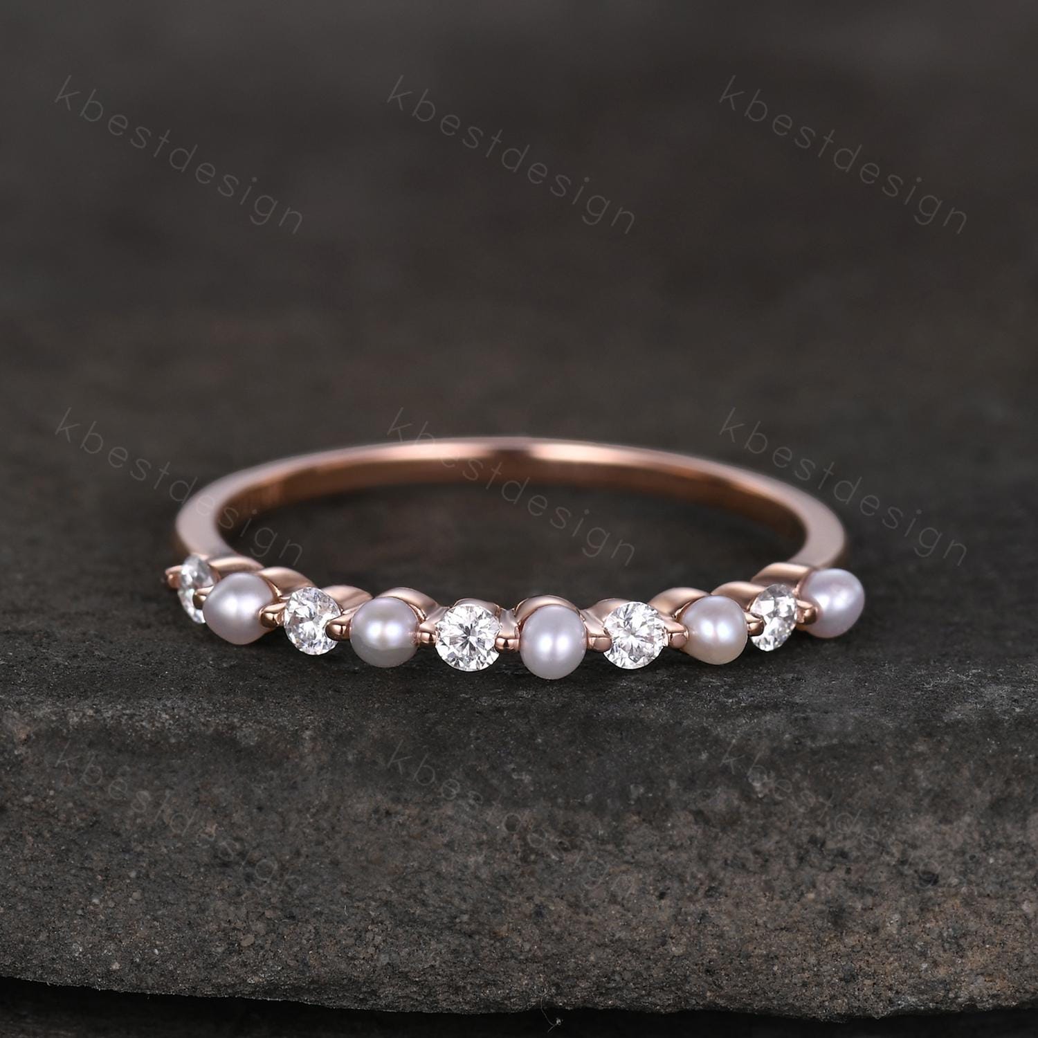 Pearl Moissanite wedding band Unique half eternity wedding band Vintage Moissanite ring rose gold ring Anniversary gift for Her