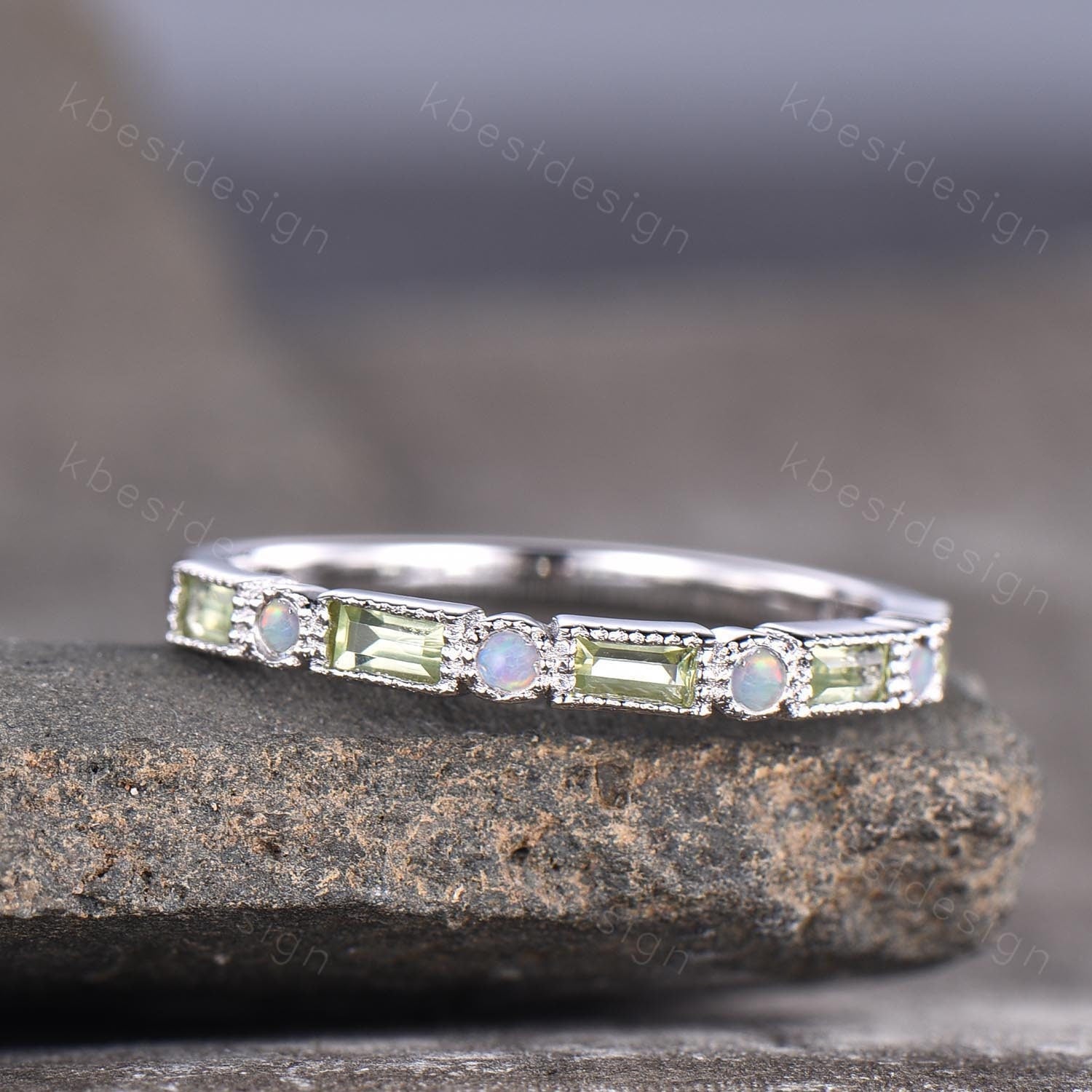 Peridot Opal Wedding Band Women Silver Stacking Band Half Eternity Baguette Band Unique Stacking Ring Matching Band Anniversary Ring Gift