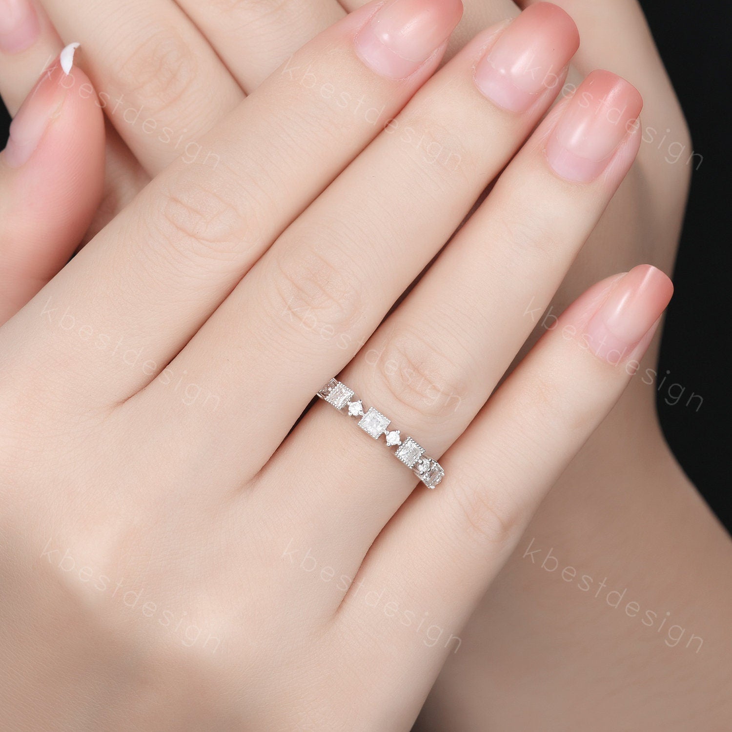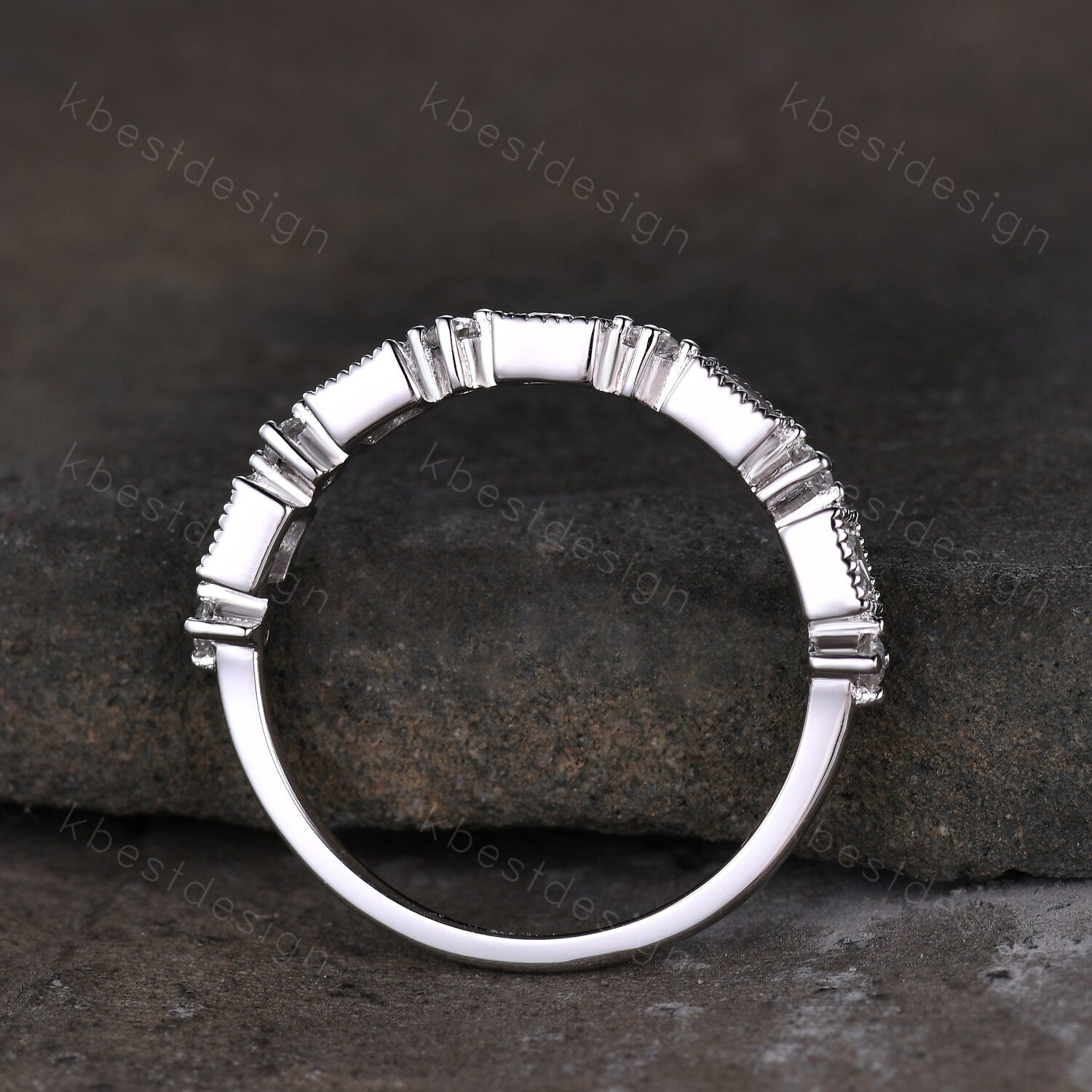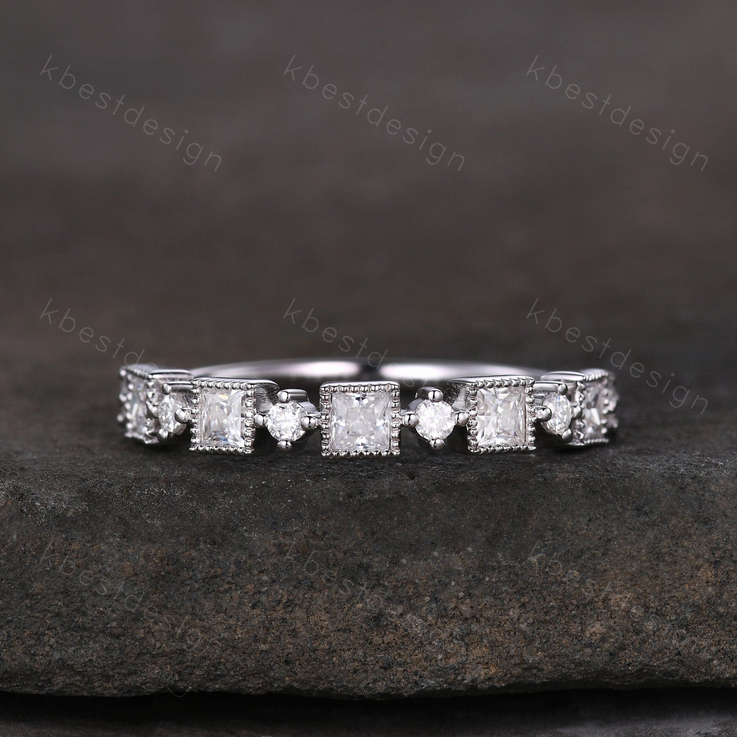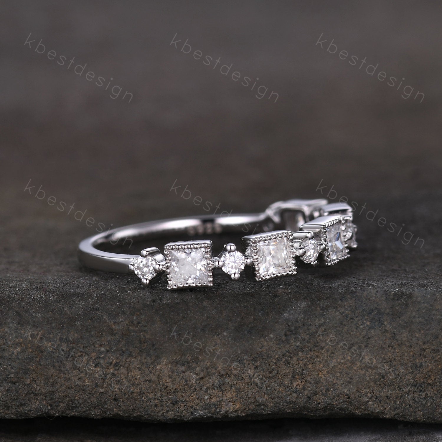 Princess cut Moissanite Wedding Band Unique Half Eternity Stacking Band Silver Moissanite Ring Women Matching Band Promise Anniversary Ring