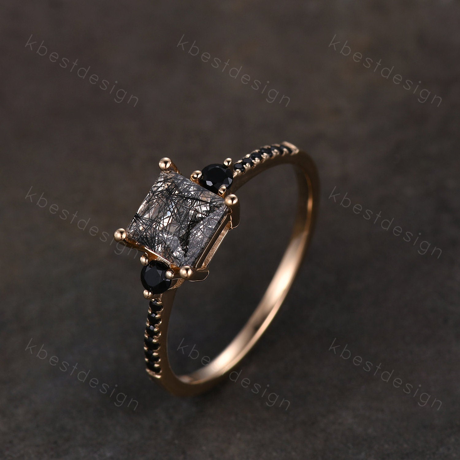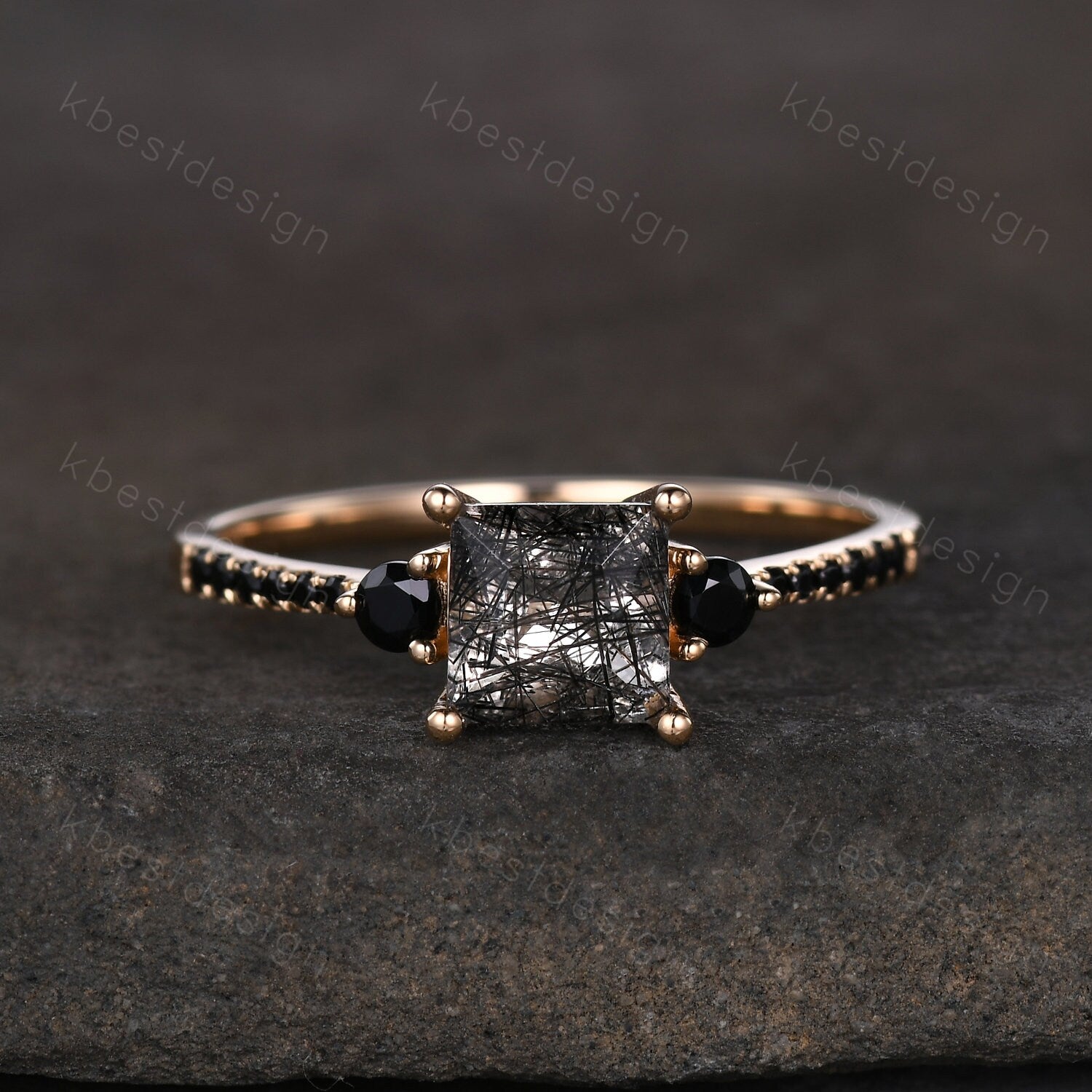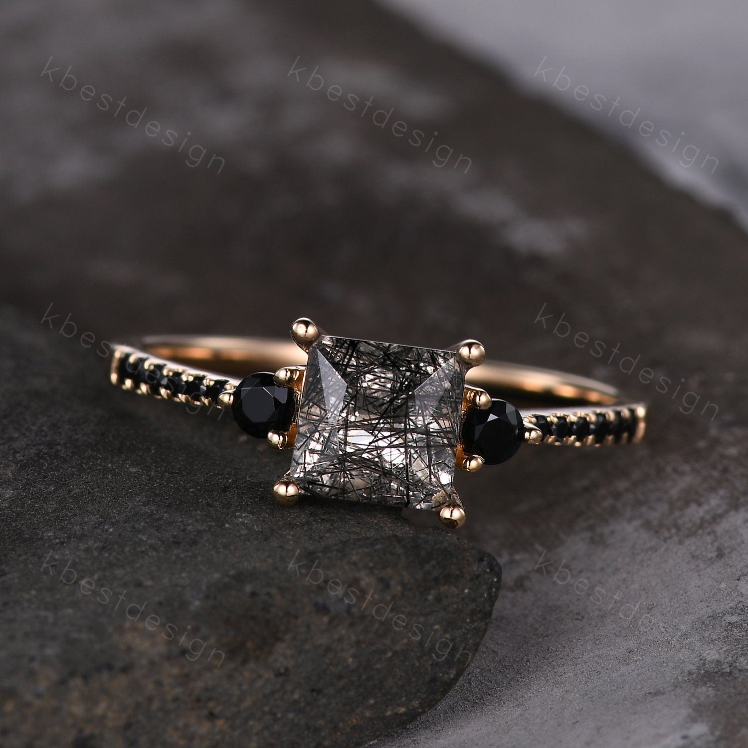 Princess Cut Natural Black Rutilated Quartz Engagement Ring Unique Black Spinel Ring Solid 14K Yellow Ring Three stone ring Promise Ring