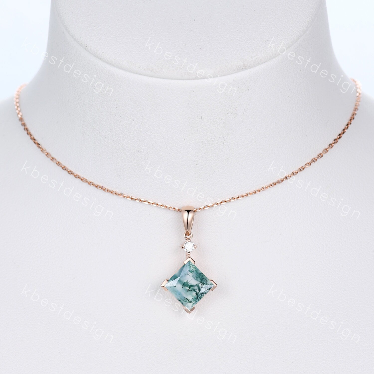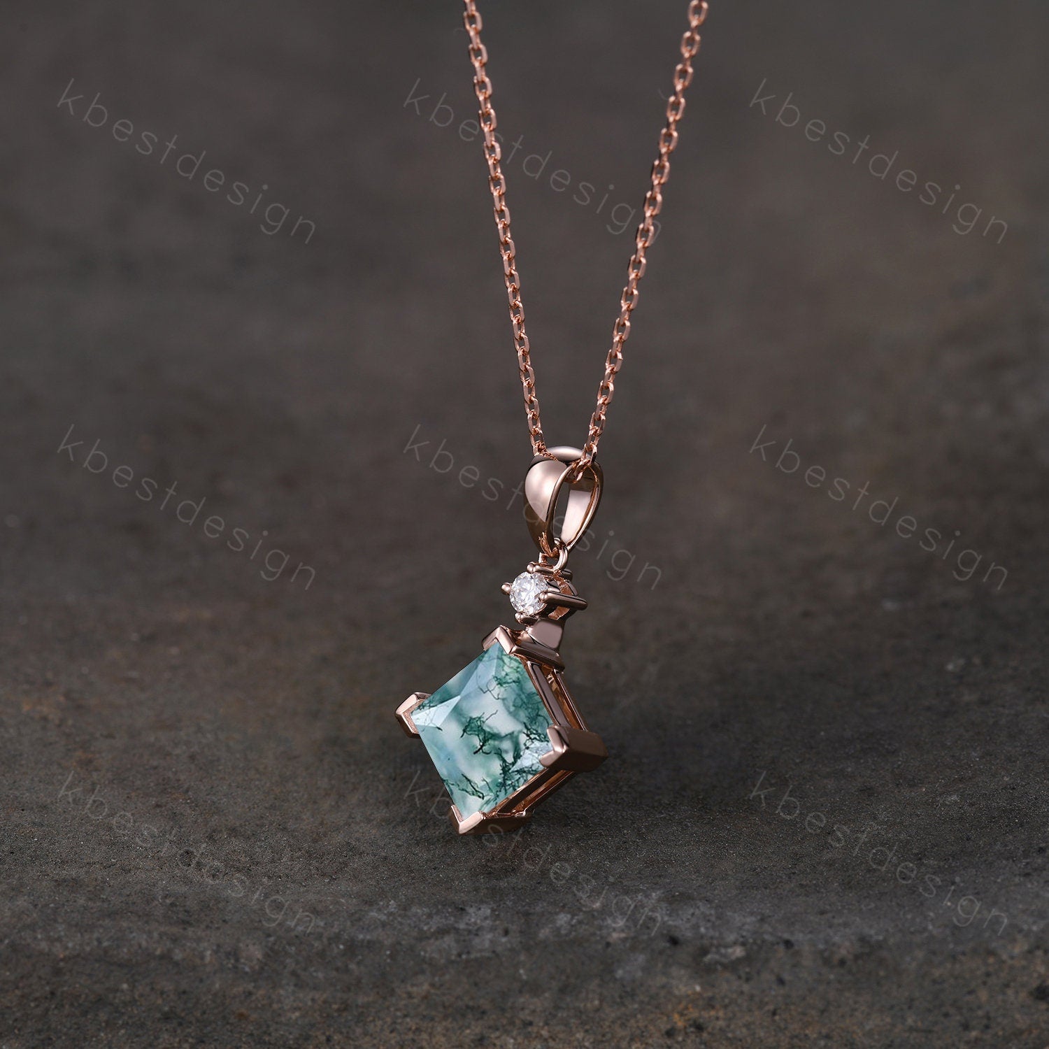 Princess cut natural moss agate necklace solid 14k rose gold vintage unique green gemstone pendant for women anniversary bridal gift