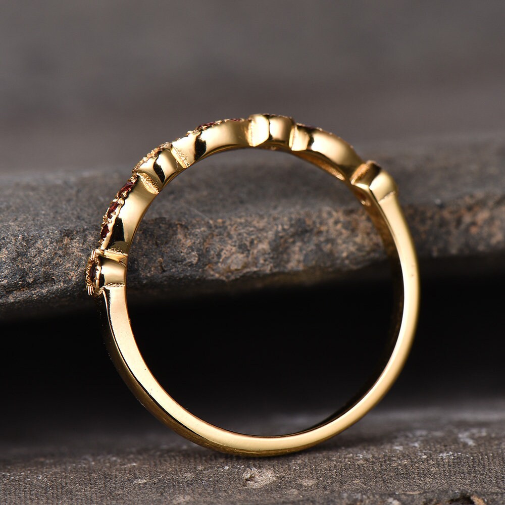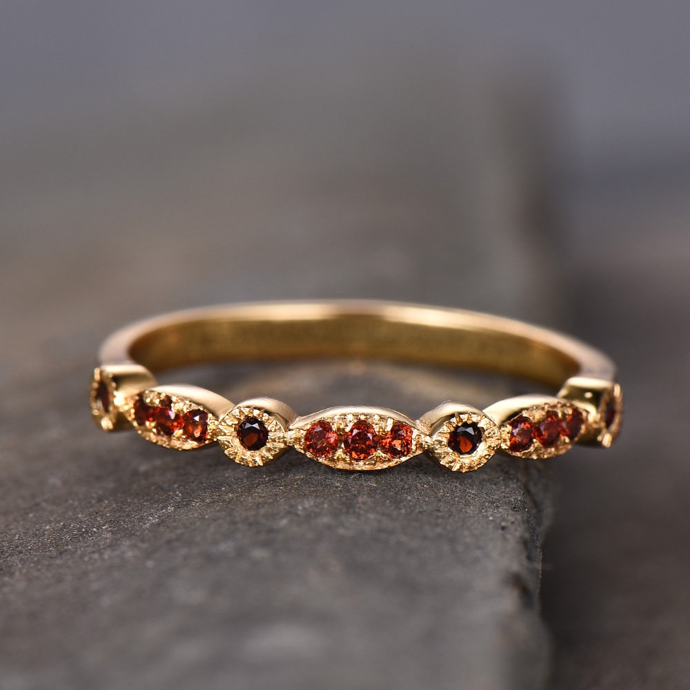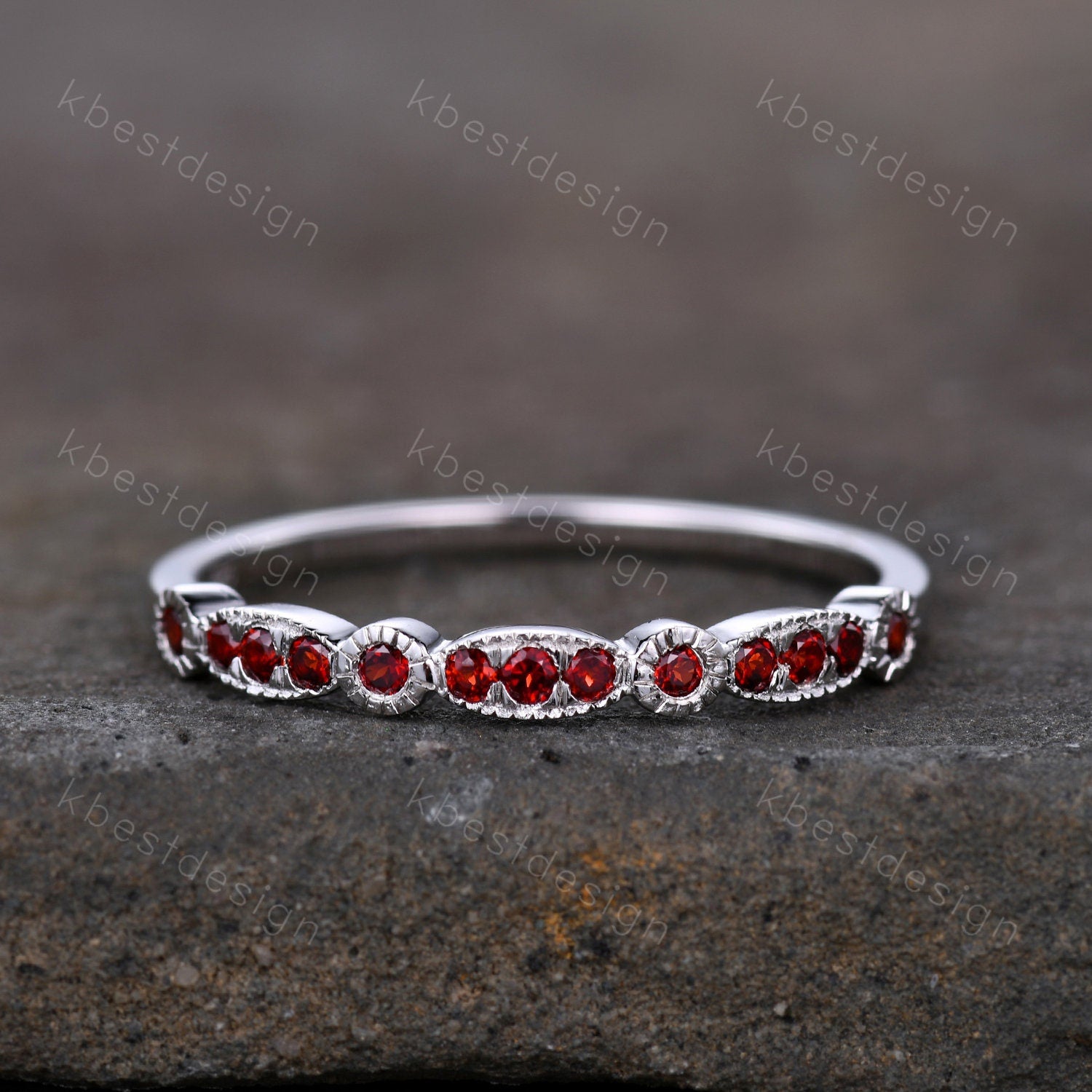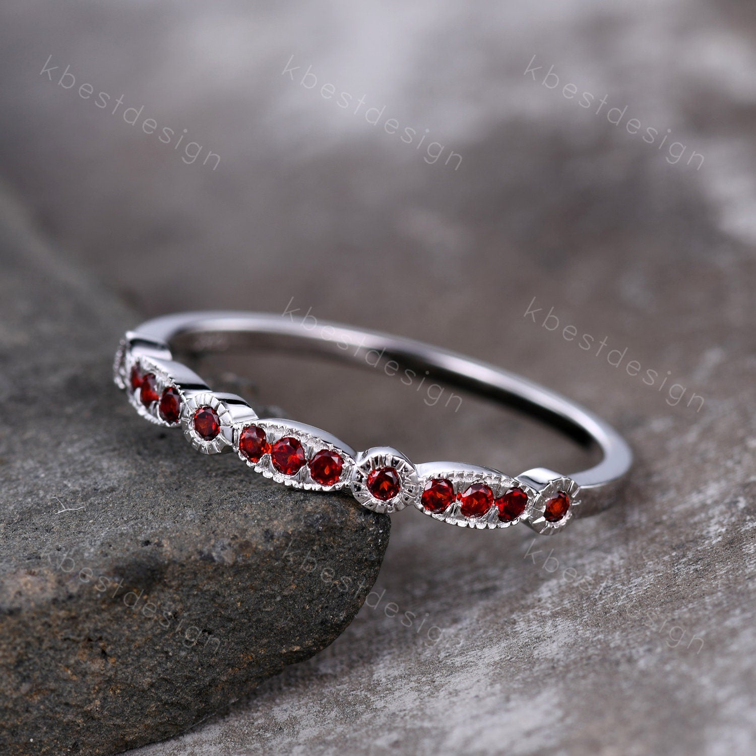 Red Garnet Wedding Band Art Deco Half Eternity Ring Sterling Silver Vintage Matching Band Milgrain Anniversary Gift