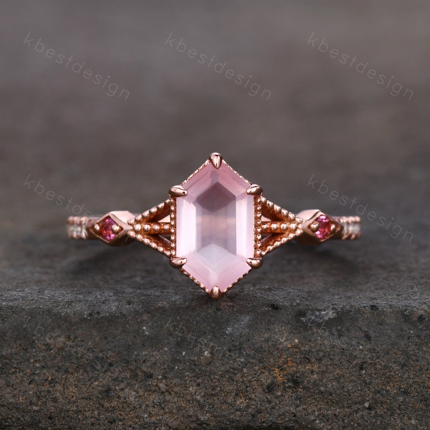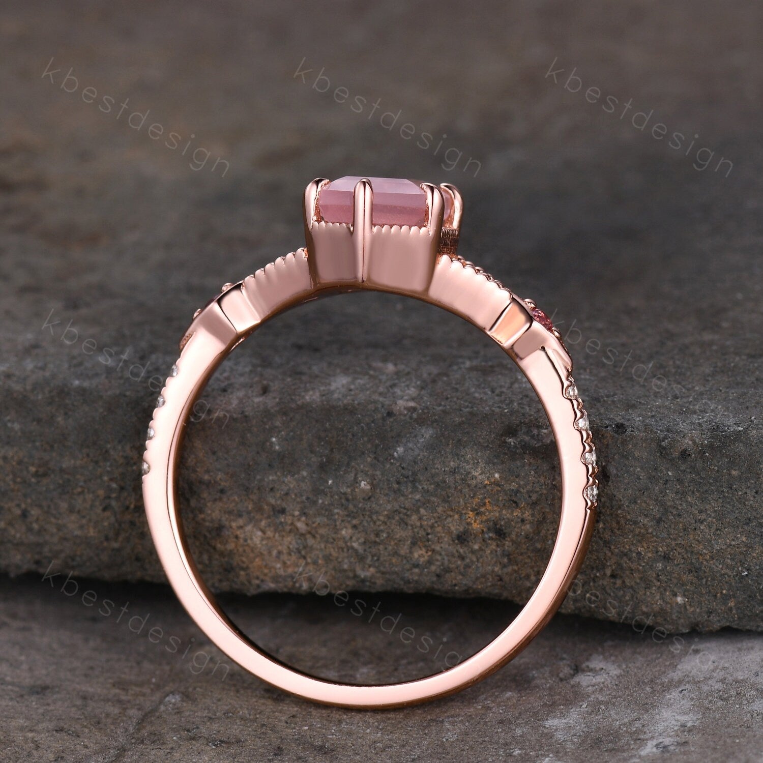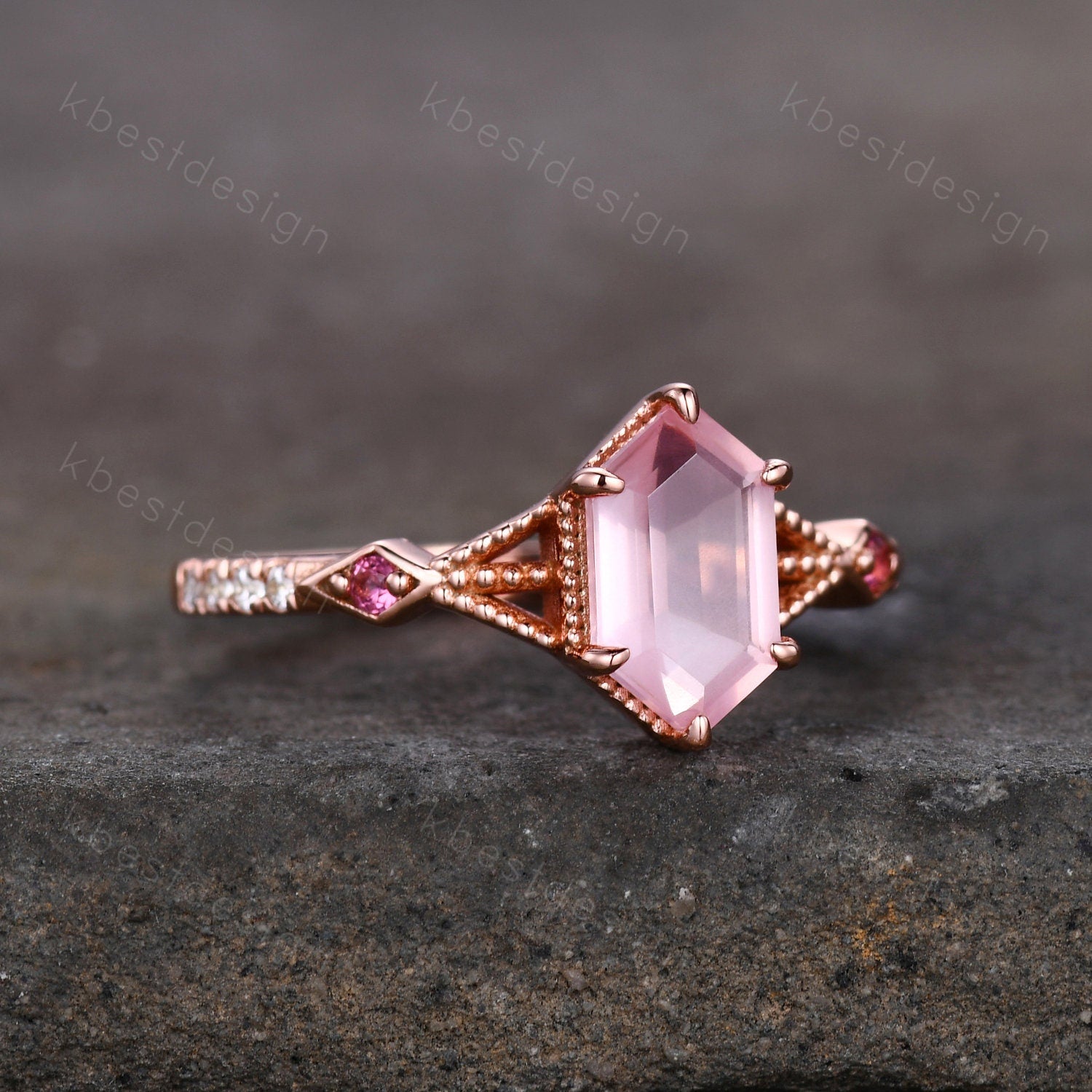 Retro Long hexagon Rose Quartz Ring Vintage Rose Gold Engagement Ring Unique Art Deco Pink Tourmaline Ring Antique Bridal Wedding Ring