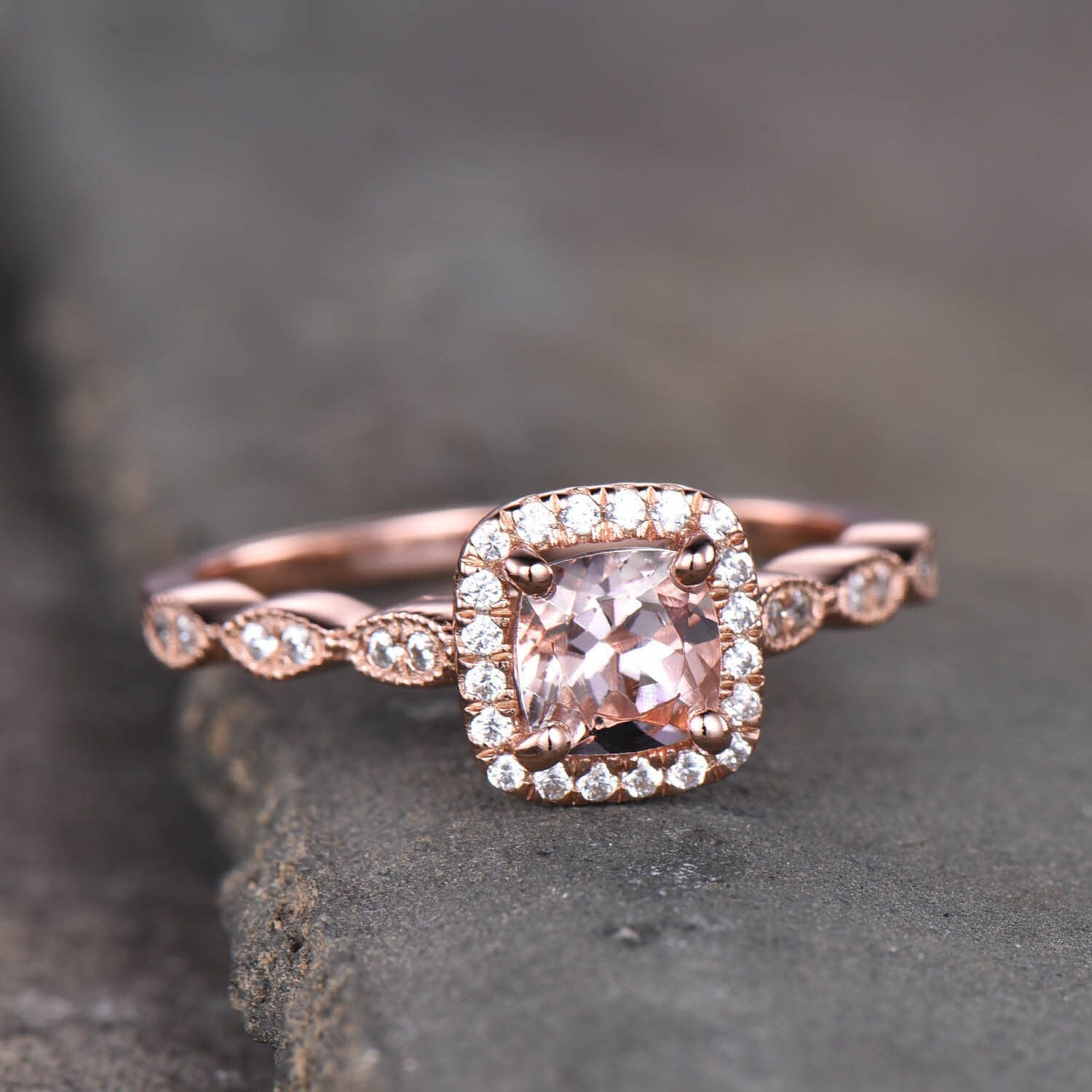 Rose Gold Morganite Ring, Cushion Morganite Engagement Ring, Halo Ring, Art deco wedding Band, Promise Ring, Anniversary Ring, Bridal Ring