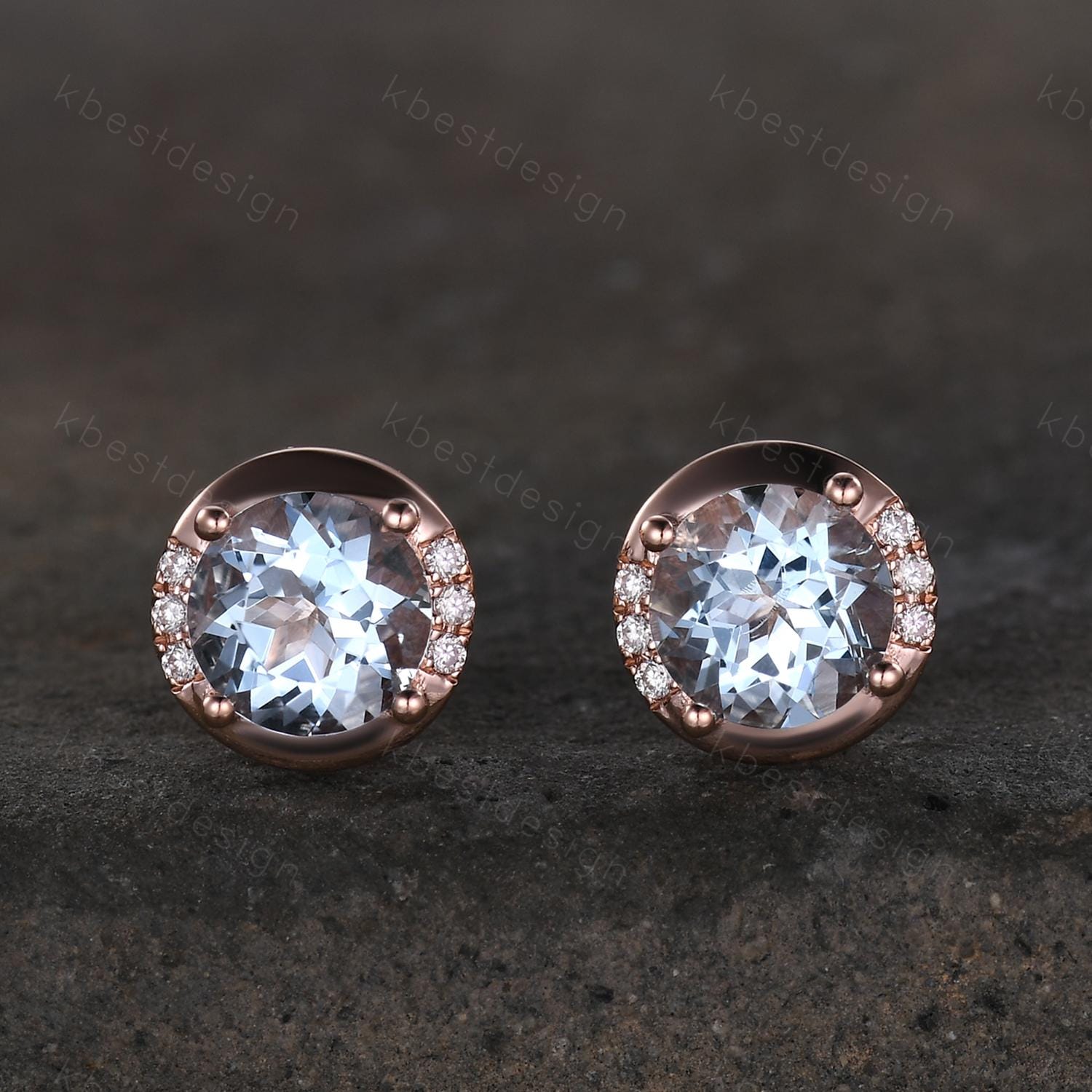 Round Aquamarine Earrings, Aquamarine Birthstone Stud Earrings, Rose Gold Earrings, Genuine Aquamarine Earrings, March Birthstone Earrings