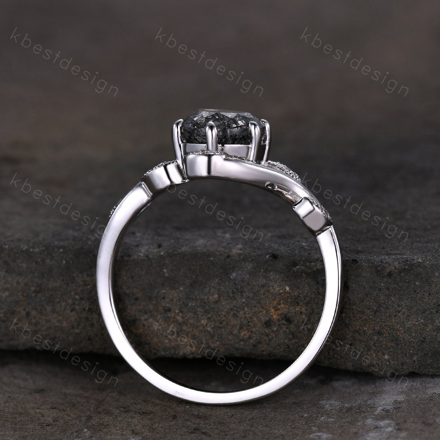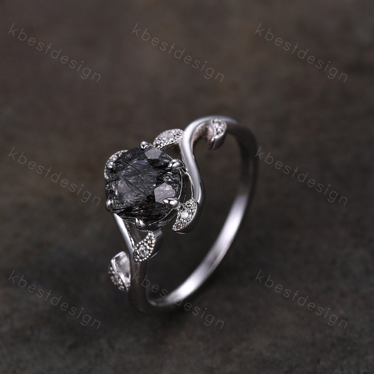 Round cut black rutilated quartz engagement ring vintage unique black gemstone ring art deco leaf style moissanite ring anniversary gift.
