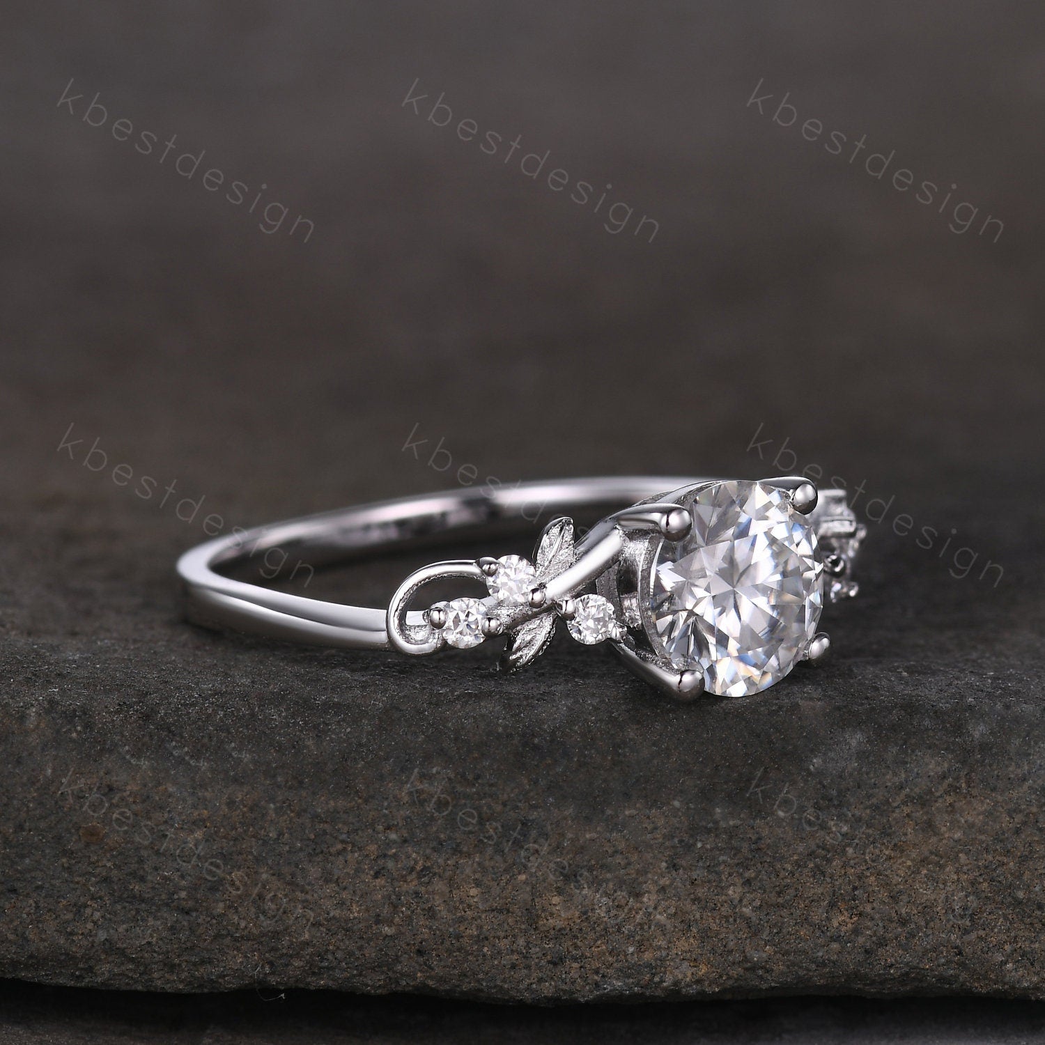Round cut moissanite engagement ring 14K White gold ring Art deco leaf design wedding ring nature inspired ring bridal promise ring for her