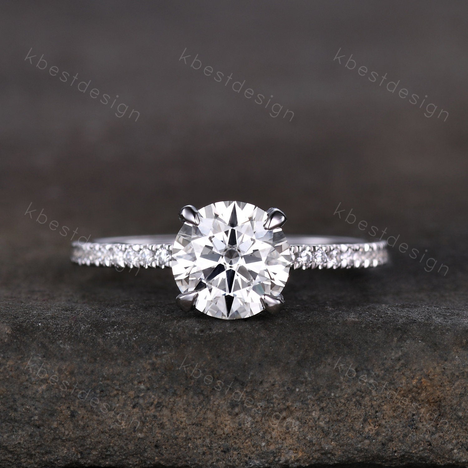 Round cut moissanite ring vintage moissanite engagement ring white gold unique hidden halo engagement ring promise wedding ring for women