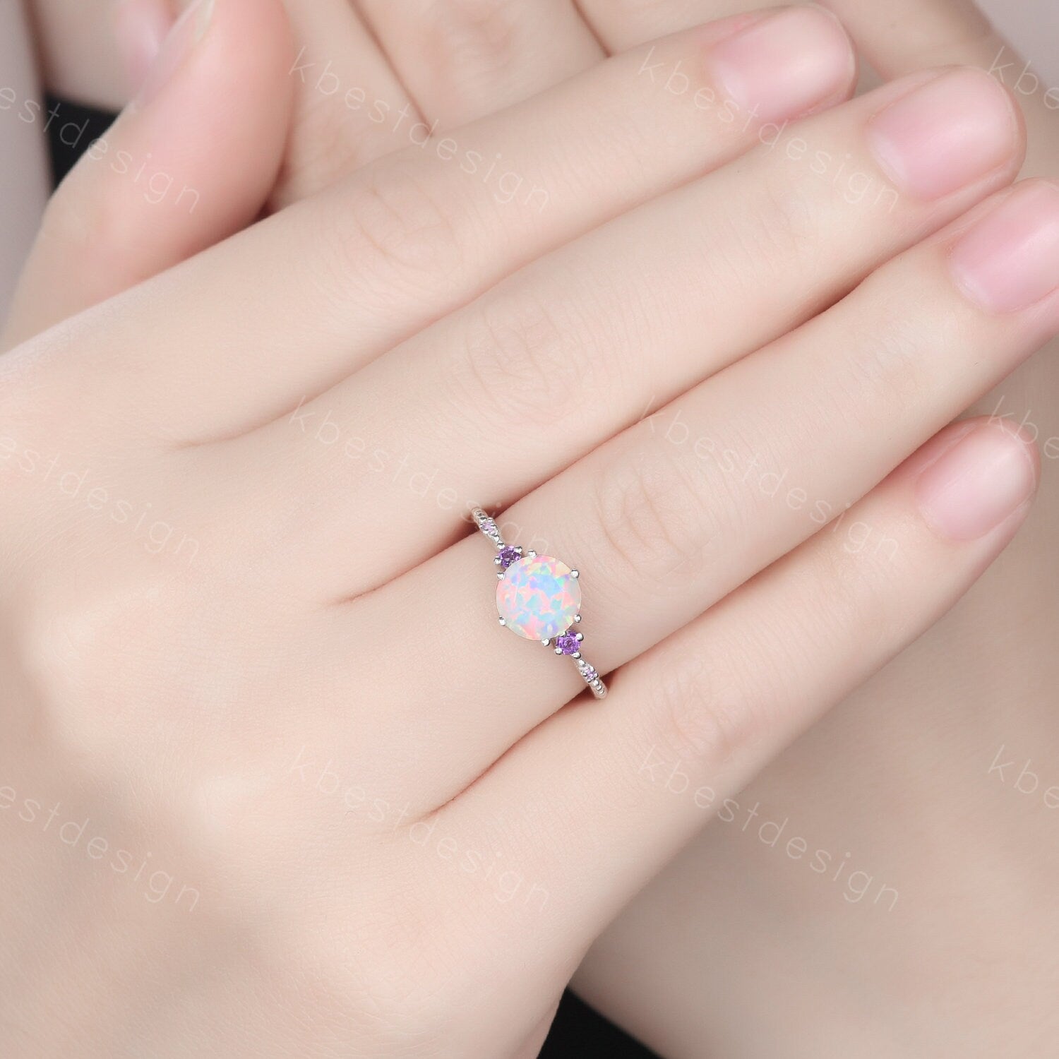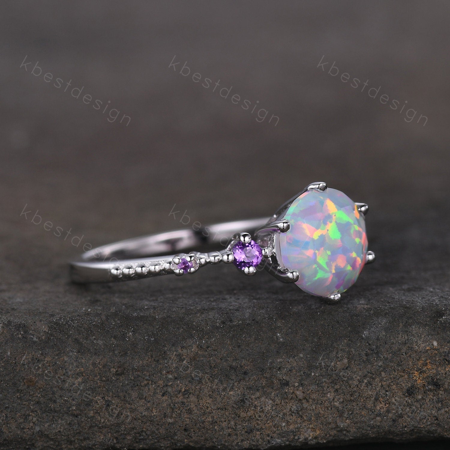 Round cut opal ring vintage white Opal engagement ring white gold Unique amethyst ring for women October birthstone ring anniversary ring