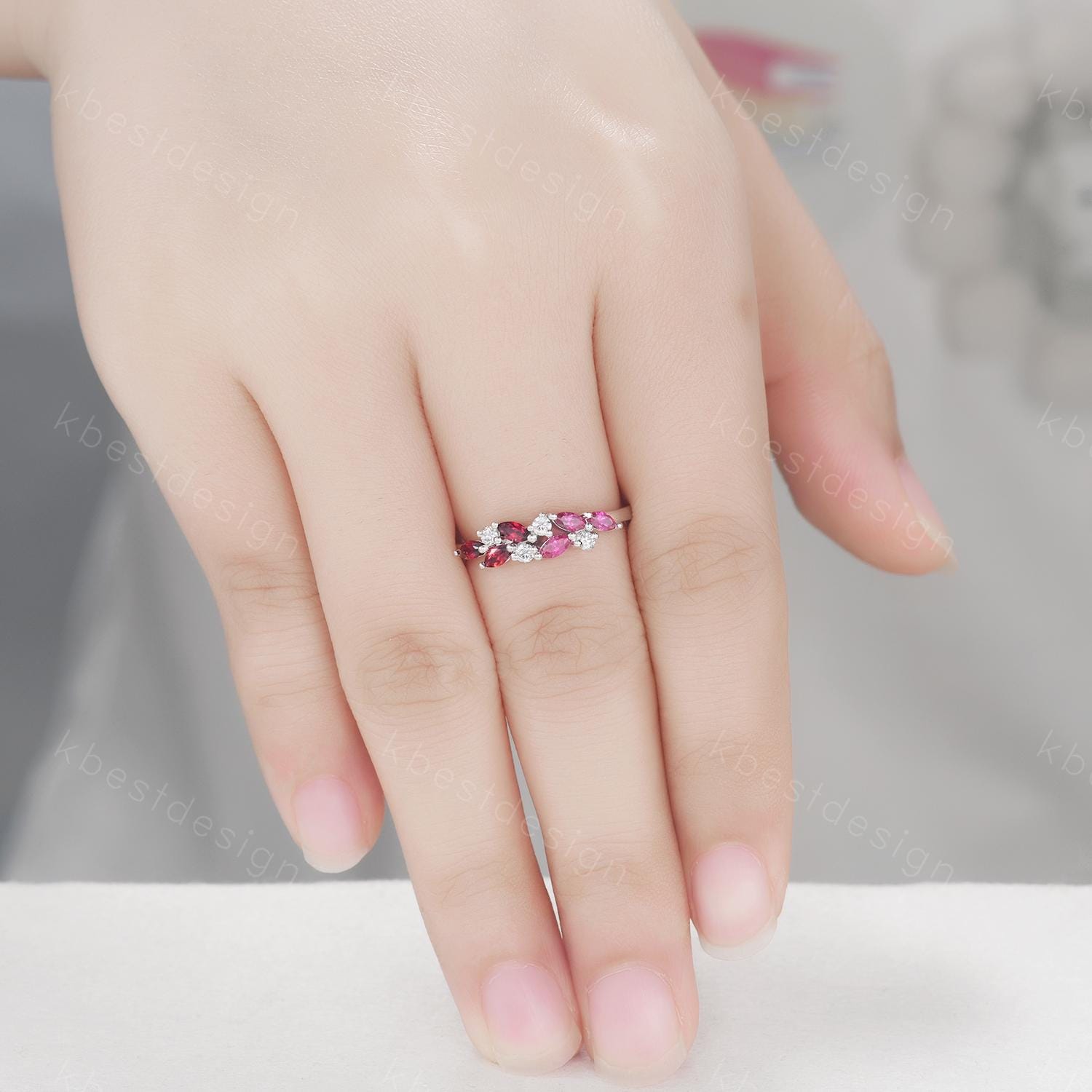 Ruby Garnet cluster wedding band Unique marquise cut ruby wedding band Vintage Moissanite ring family gemstone ring Anniversary gift for her