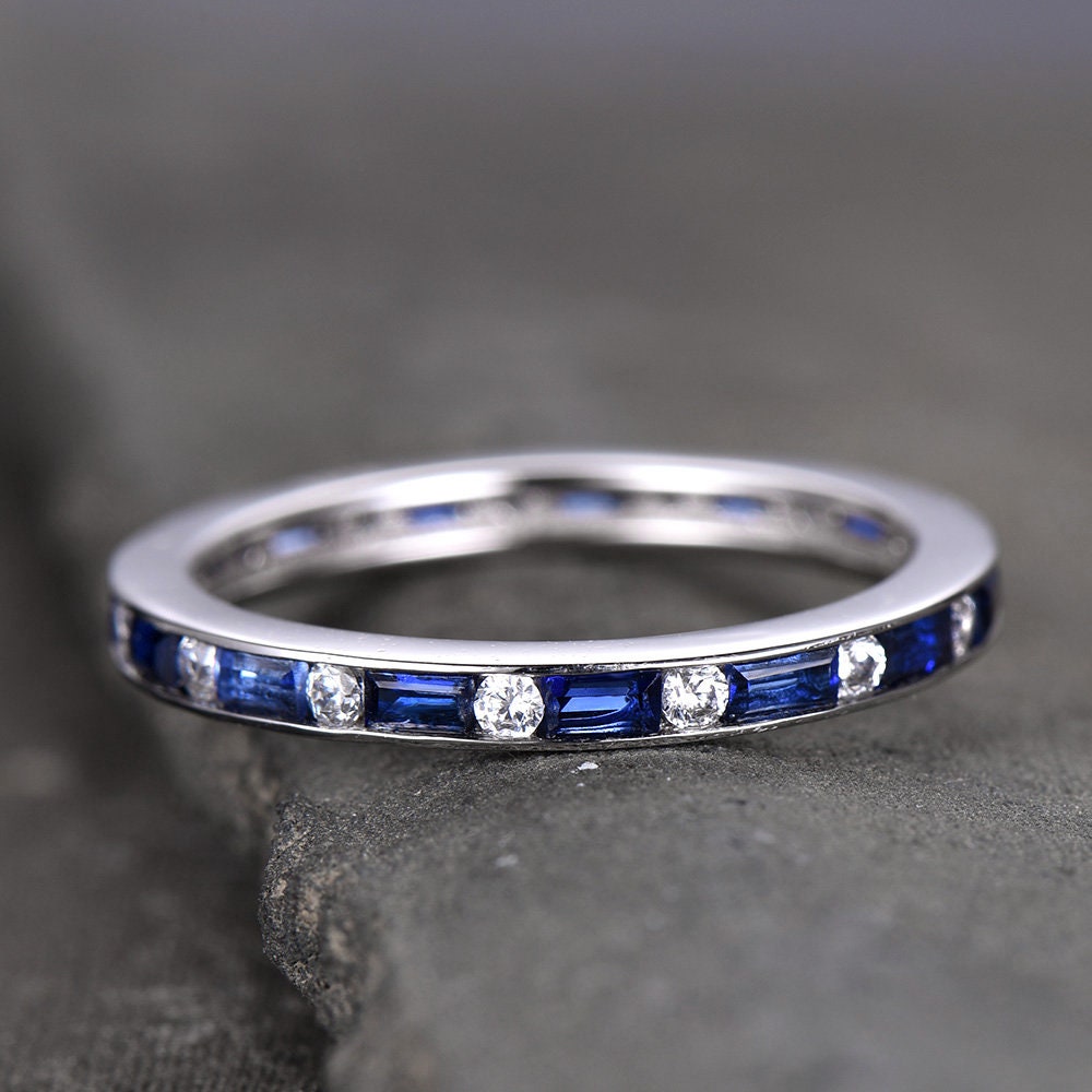 Sapphire Ring Baguette Cut Blue Sapphire And Diamond Simulant Wedding Band Full Eternity Sterling Silver Anniversary stacking rings