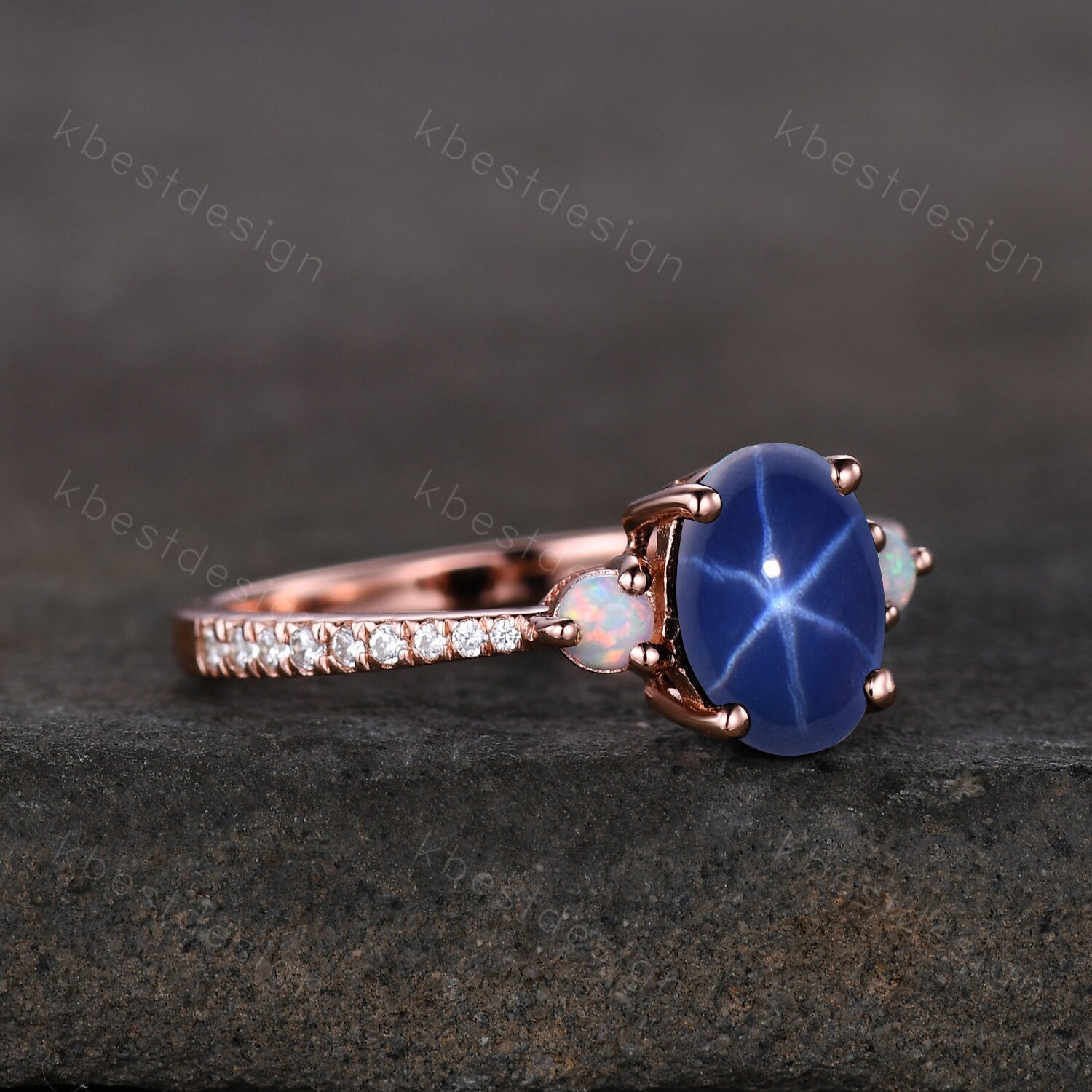This is a Star Sapphire Engagement Ring Oval Cut Galaxy Crystal Engagement Ring Rose Gold Opal Three stone Ring Unique Promise Ring September Ring. A Modern galaxy stone meets an intricate nature inspired design in this unique star sapphire engagement ring.