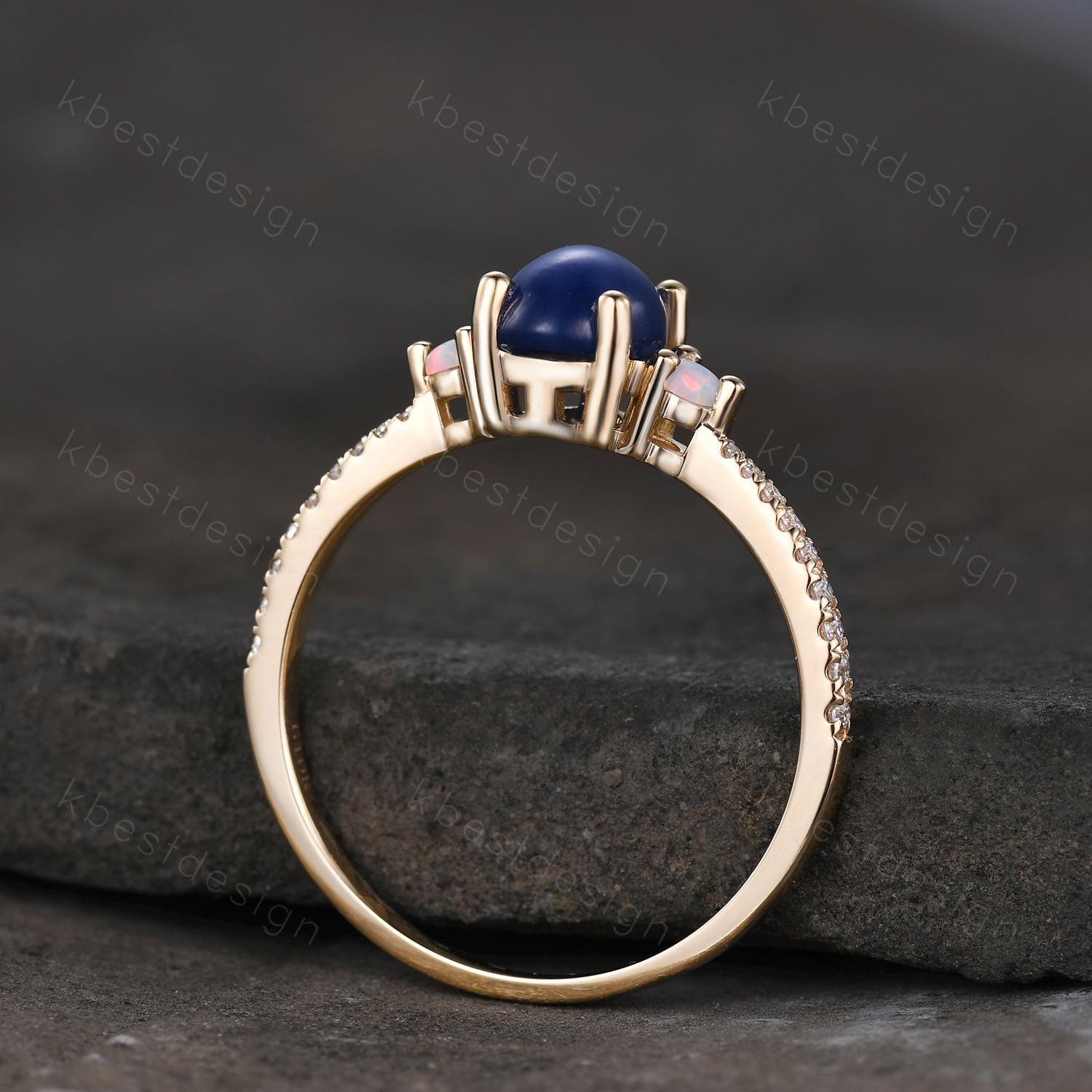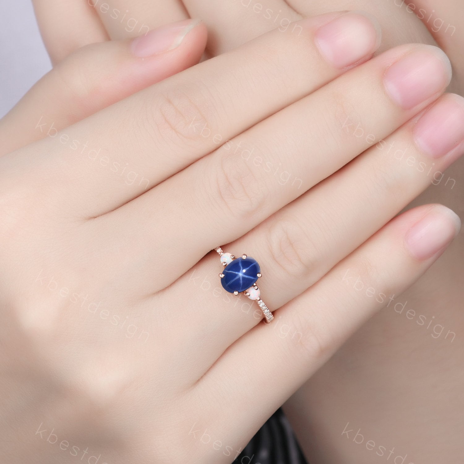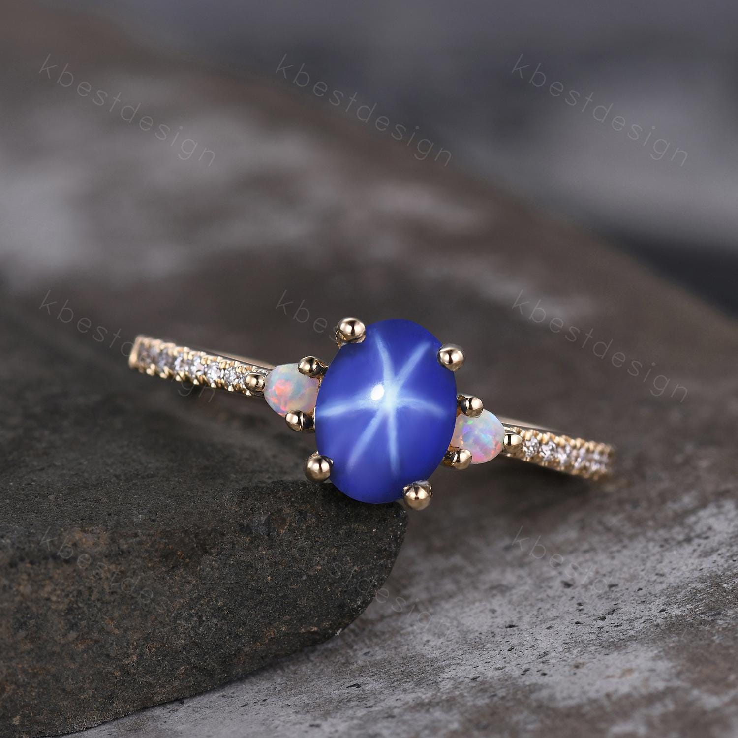 Star Sapphire Engagement Ring Oval Cut Galaxy Crystal Engagement Ring Yellow Gold Opal Three stone Ring Unique Promise Ring September Ring