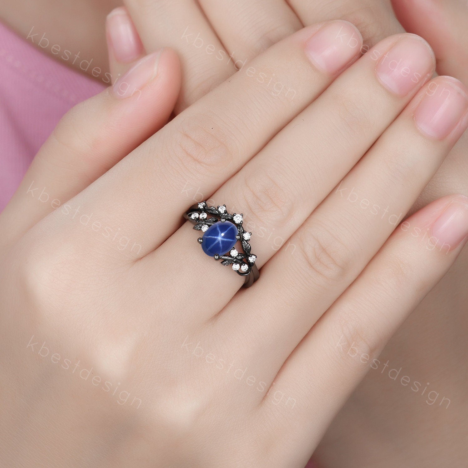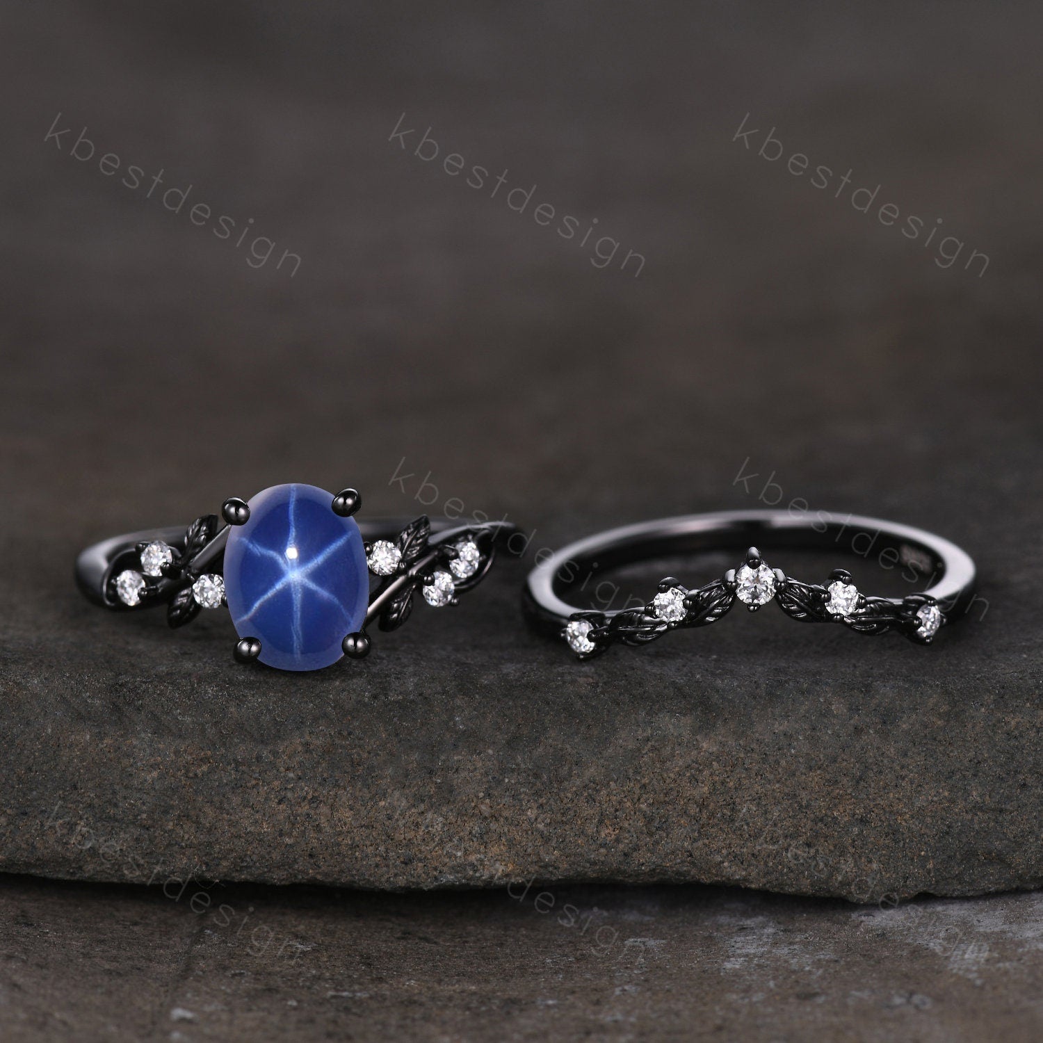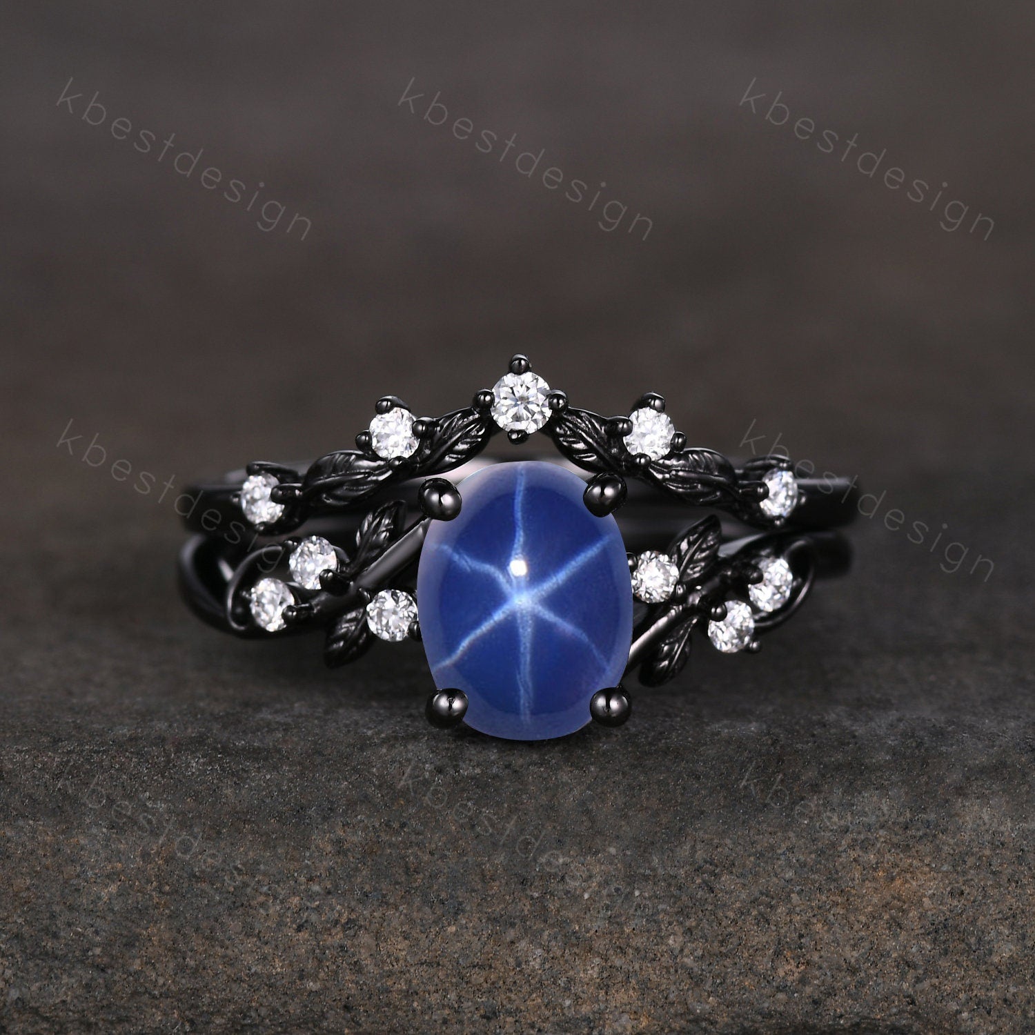 Star Sapphire Engagement Ring Set Oval Cut Galaxy Crystal Engagement Ring Black Gold Leaf Moissanite Ring Unique Promise Ring September Ring