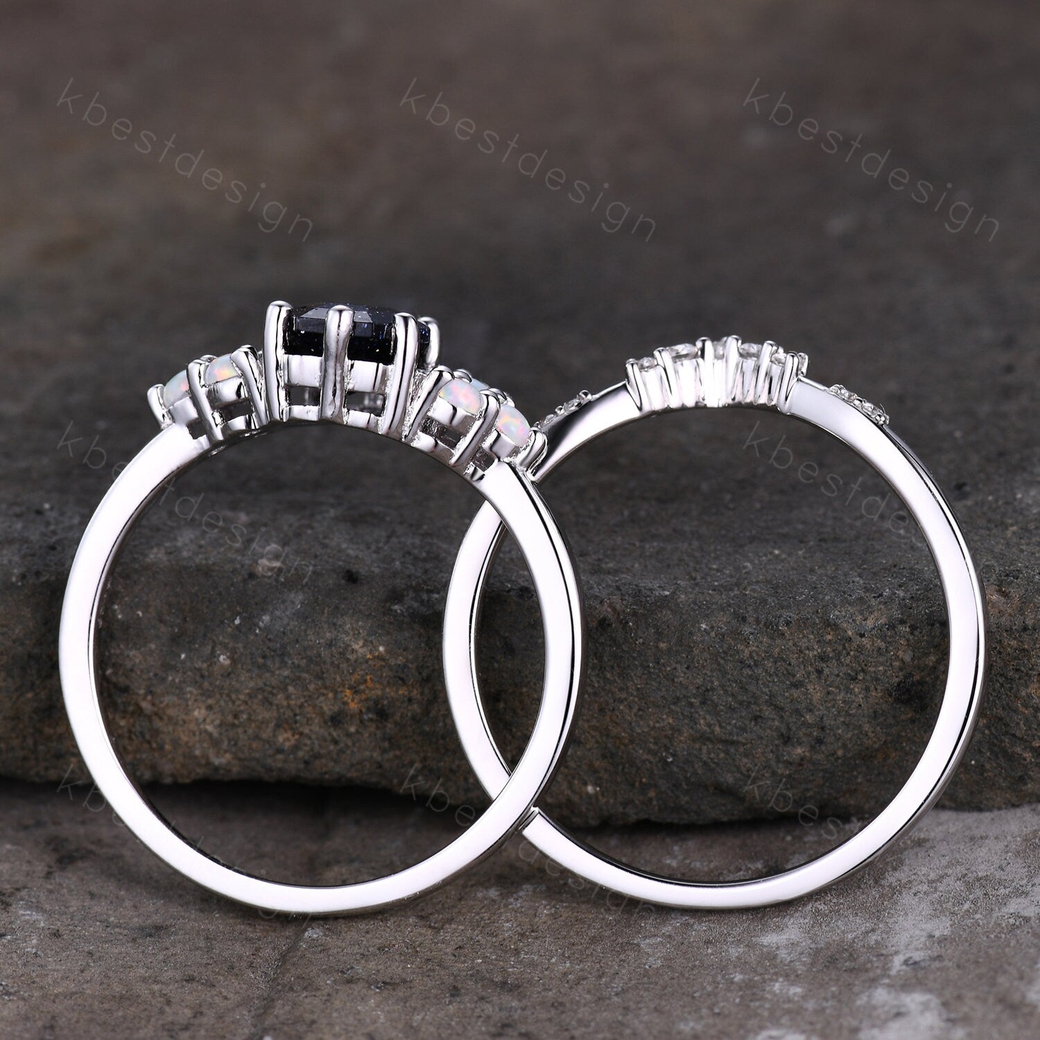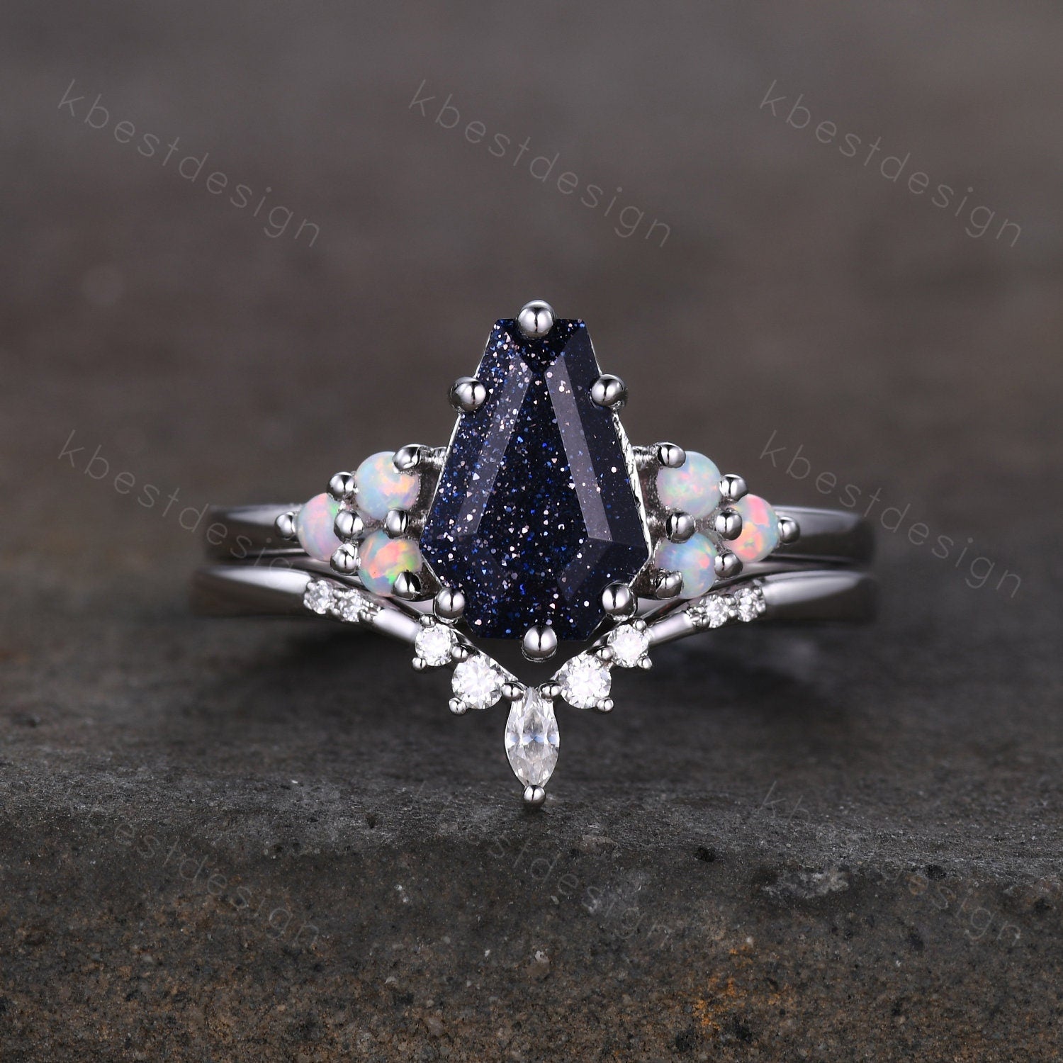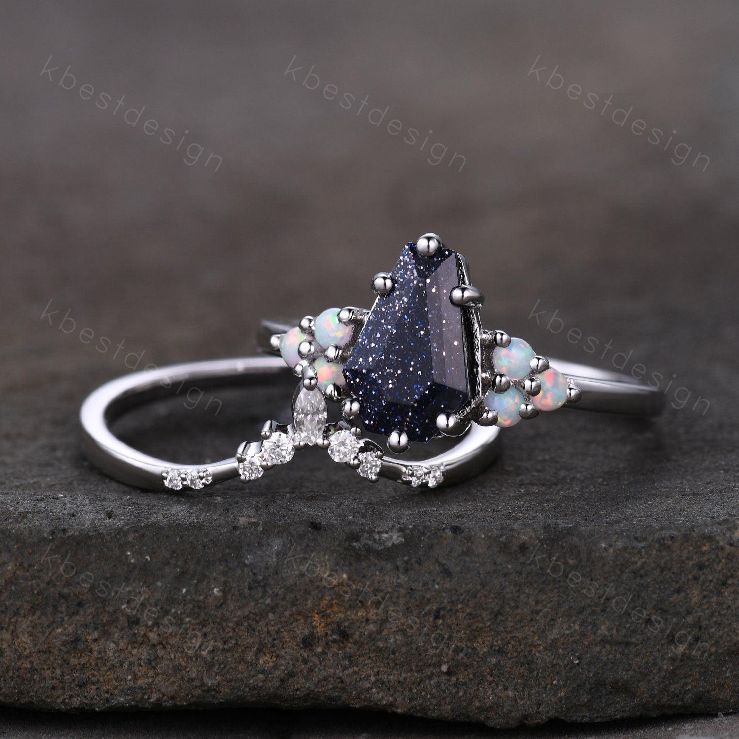 This is a beautiful blue sandstone and opal engagement ring setin sterling silver. Sterling silver galaxy blue sandstone ring Coffin shaped ring Vintage opal Cluster engagement ring Dainty curved moissanite wedding band set