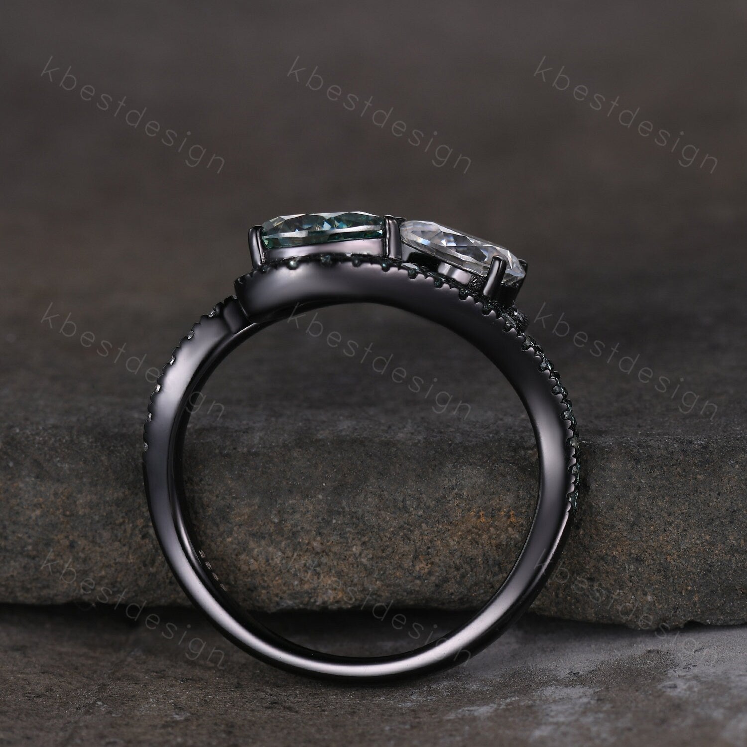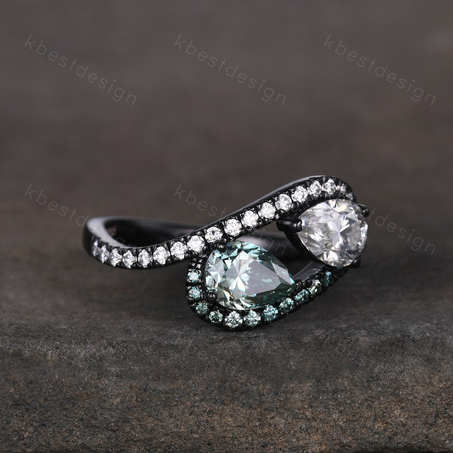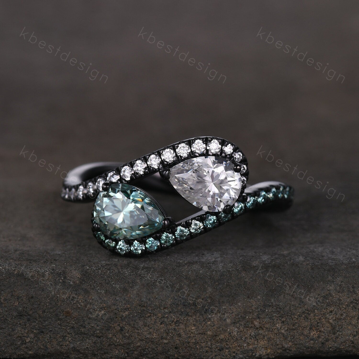 Toi et Moi Ring, Pear Green Moissanite Engagement Ring, Infinity Black Gold Ring, Double Moissanite Ring, Two Stone Ring, Promise Ring.