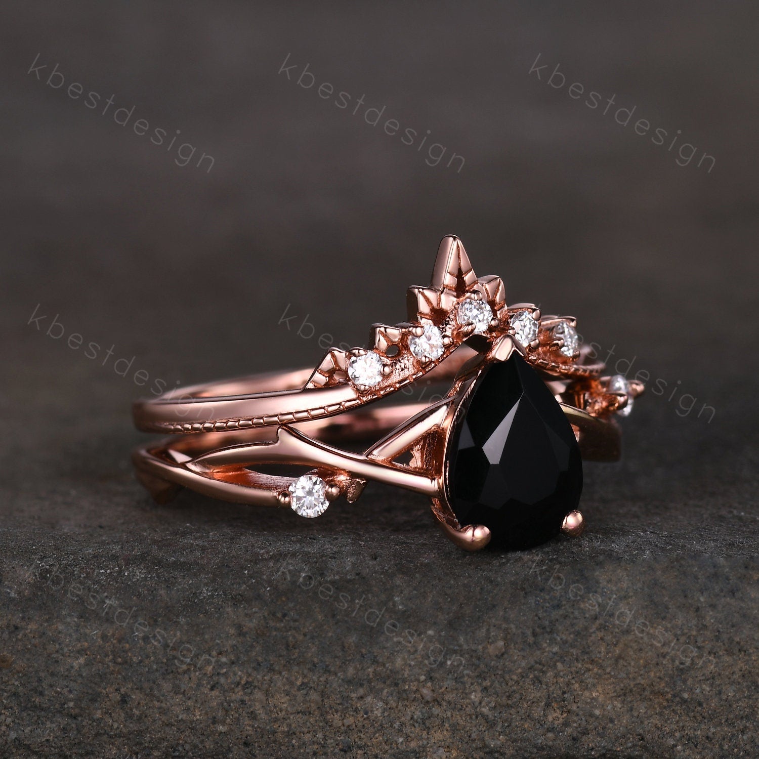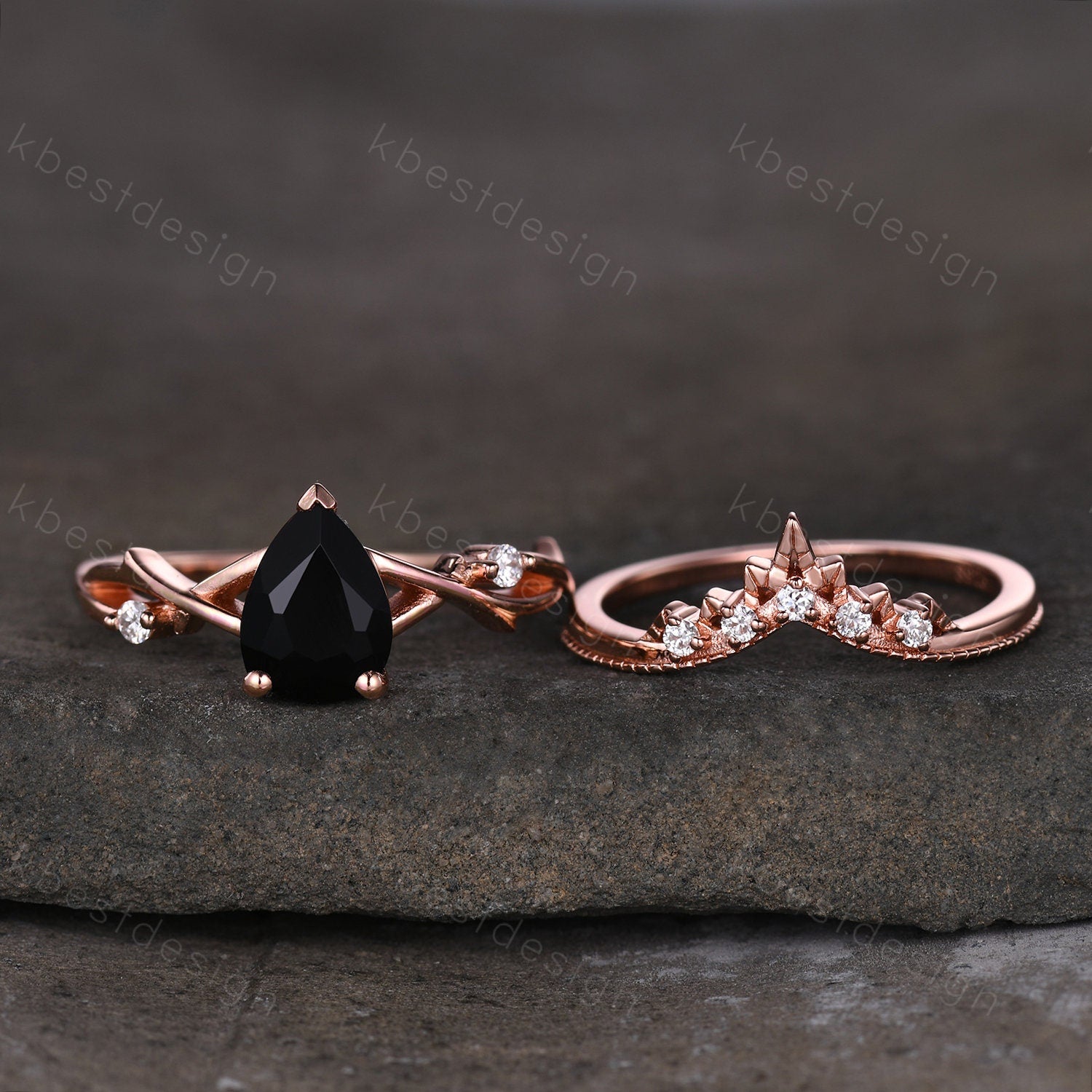 Twig black onyx engagement ring set rose gold ring art deco curved stacking band pear shaped bridal set unique moissanite wedding ring set