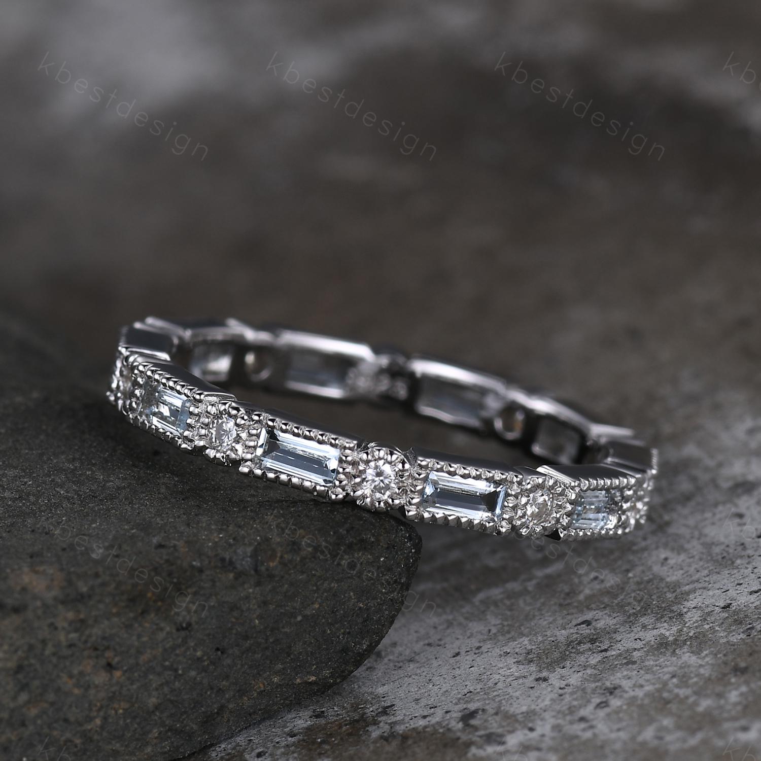 Unique Aquamarine Wedding Band, Baguette Aquamarine Wedding Band, March Birthstone Ring, Art deco Wedding Ring, Anniversary Ring Gift