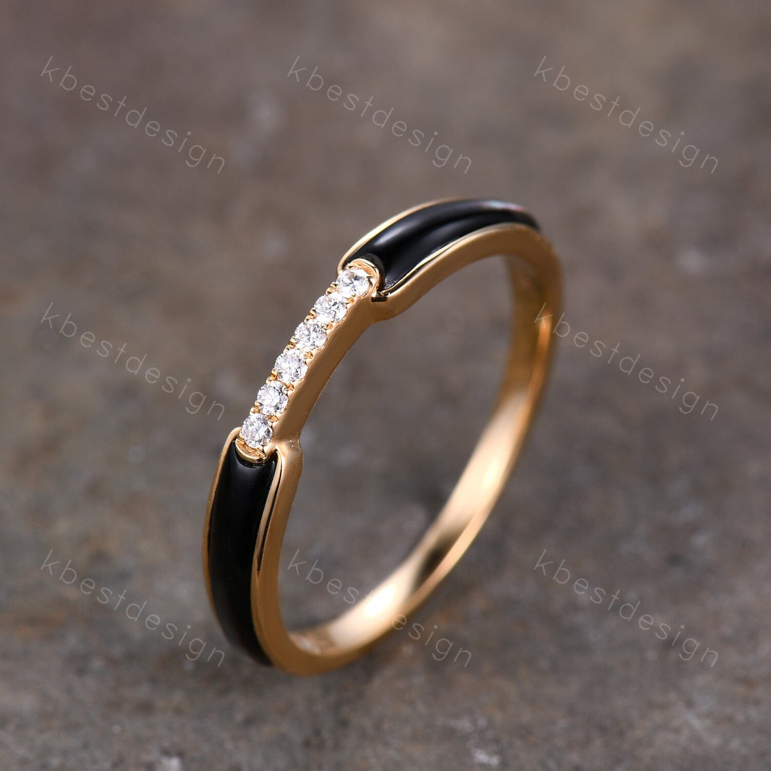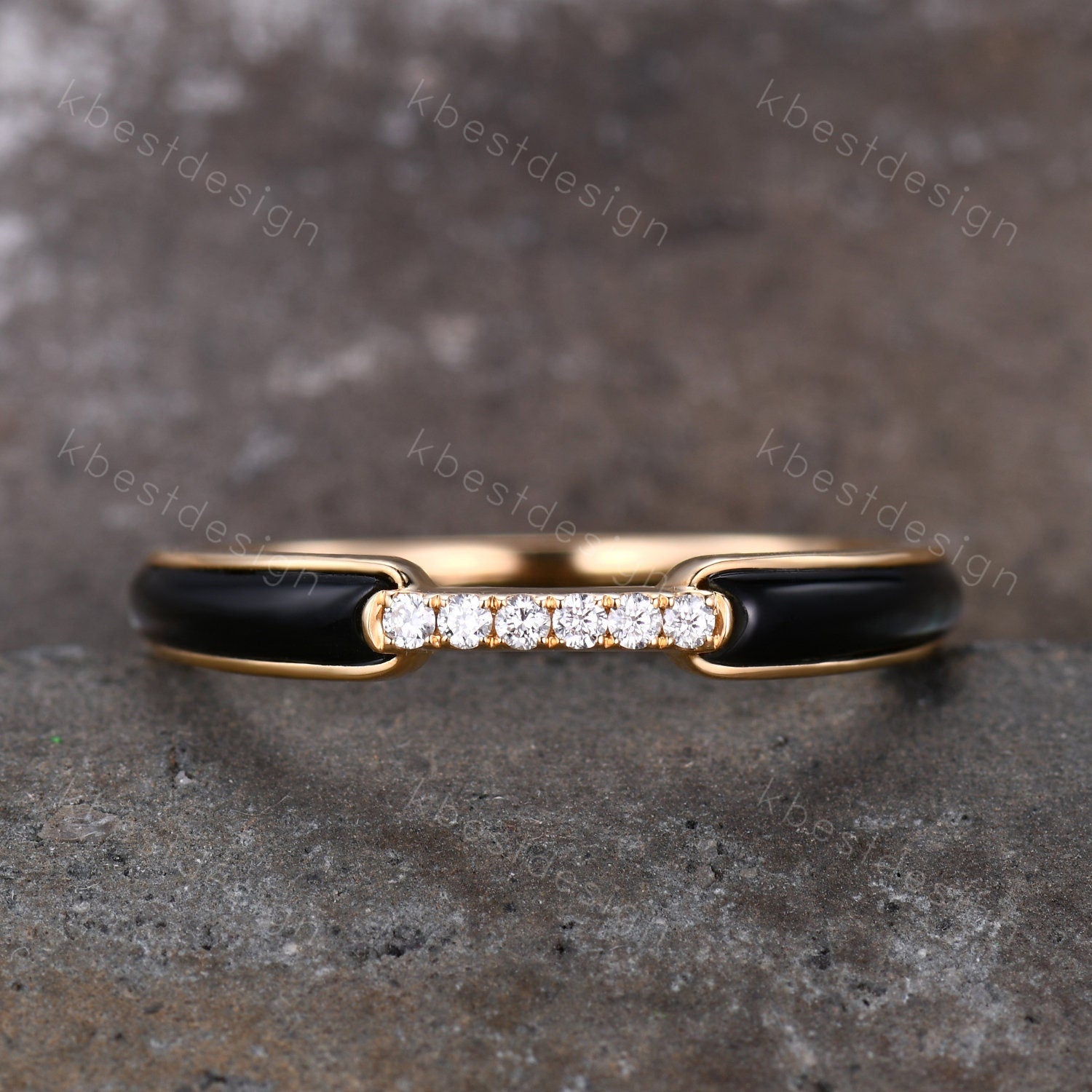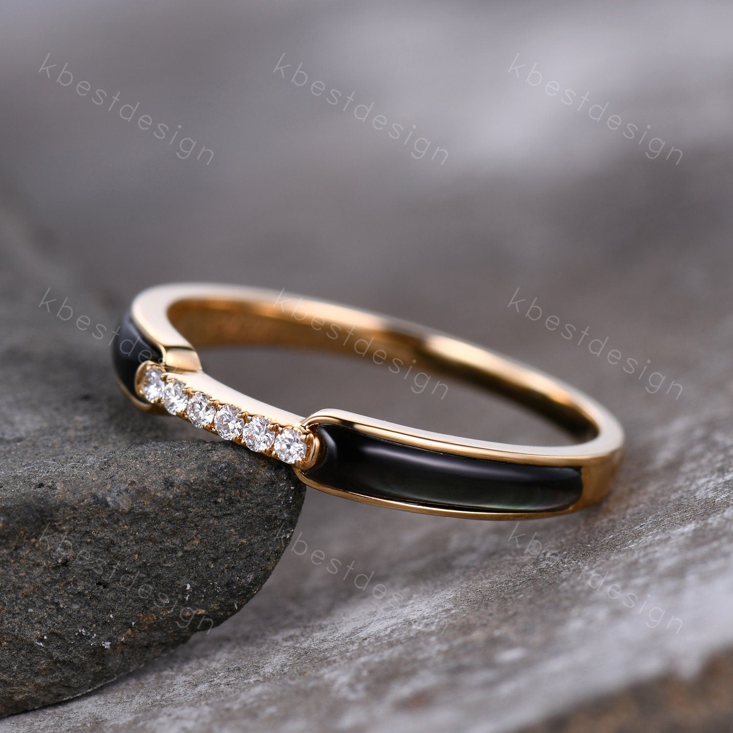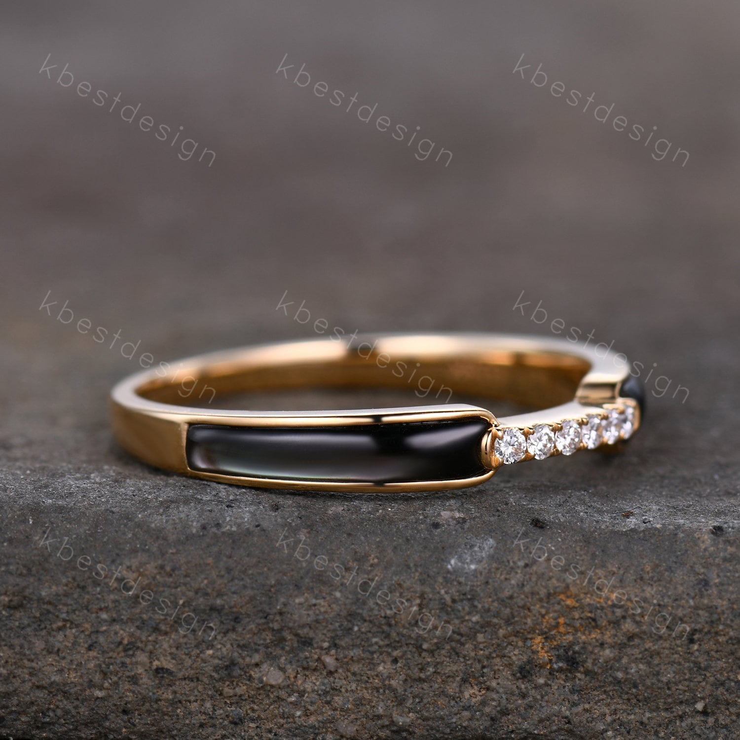 Unique Black Onyx Wedding Band Solid 14k Yellow Gold Rings Moissanite Wedding Band Half Eternity Band Vintage Bridal Anniversary Ring