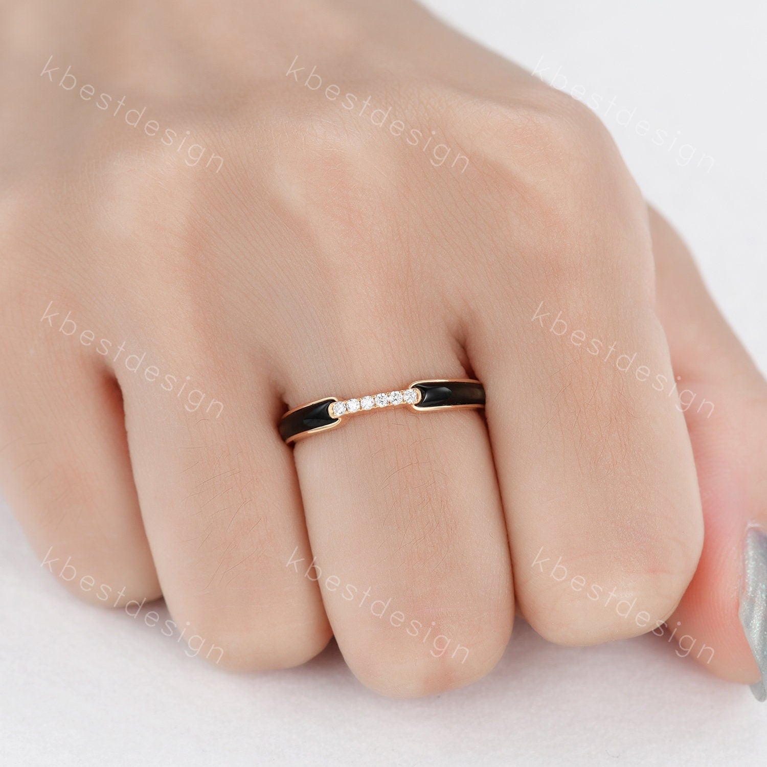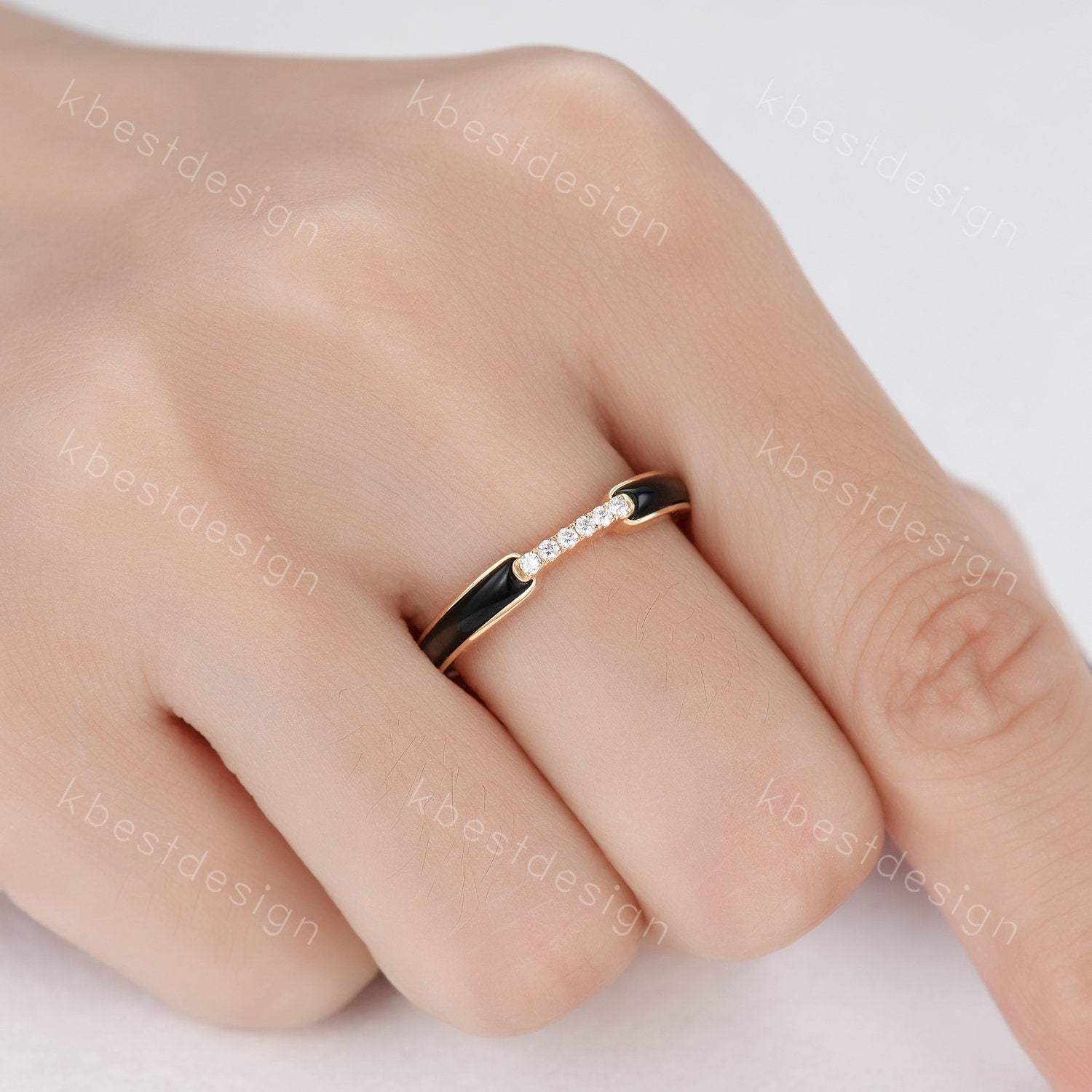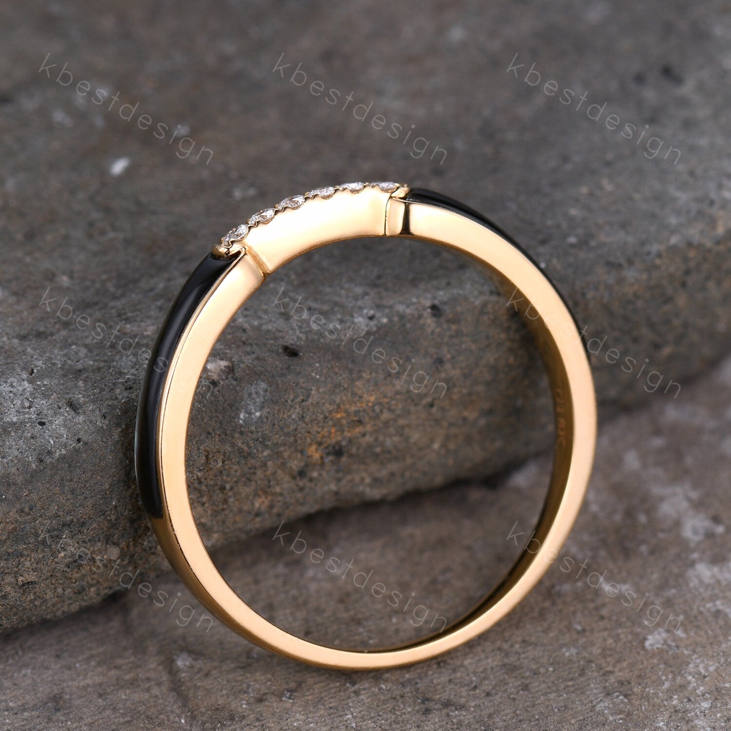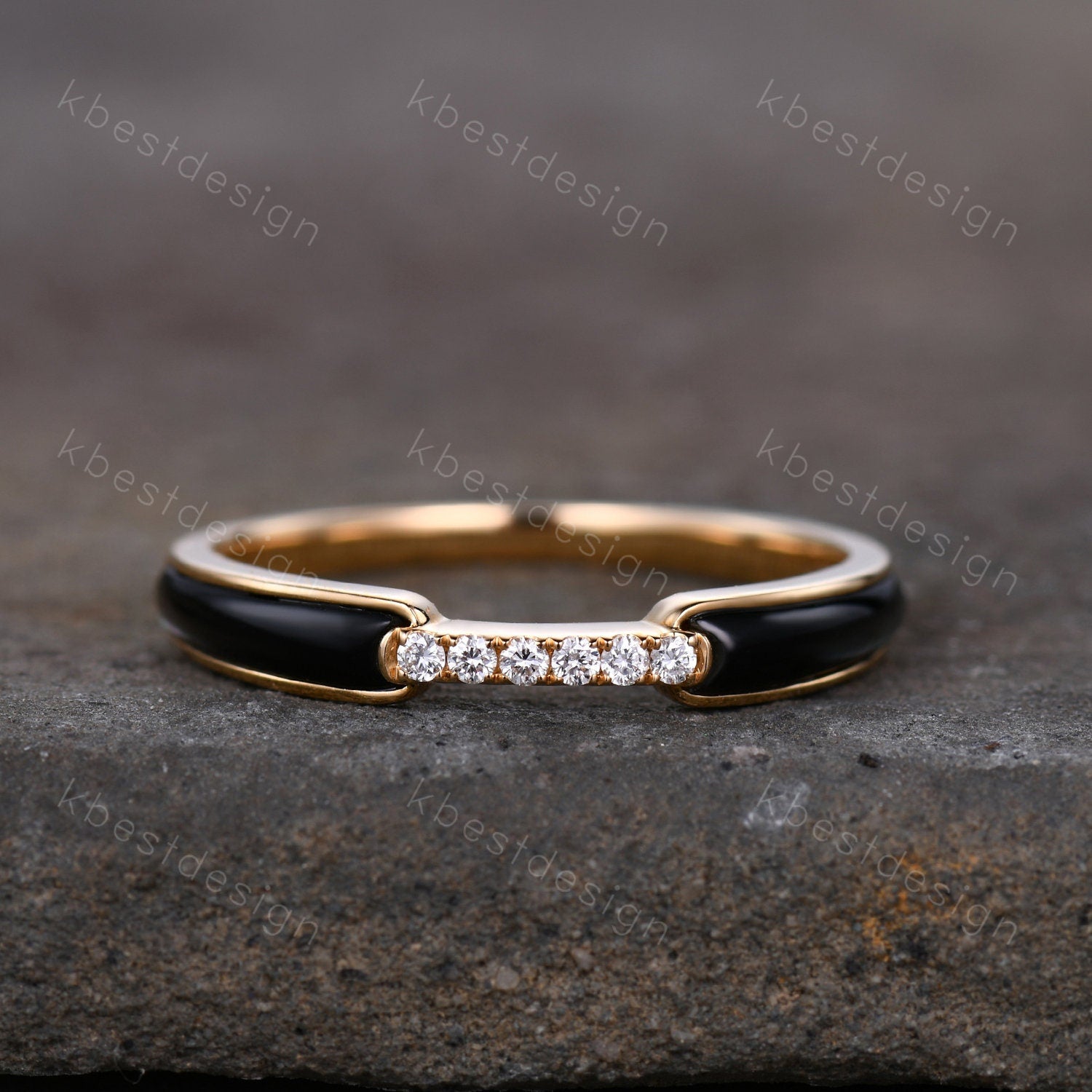 Unique Black Onyx Wedding Band Solid 14k Yellow Gold Rings Moissanite Wedding Band Half Eternity Band Vintage Bridal Anniversary Ring