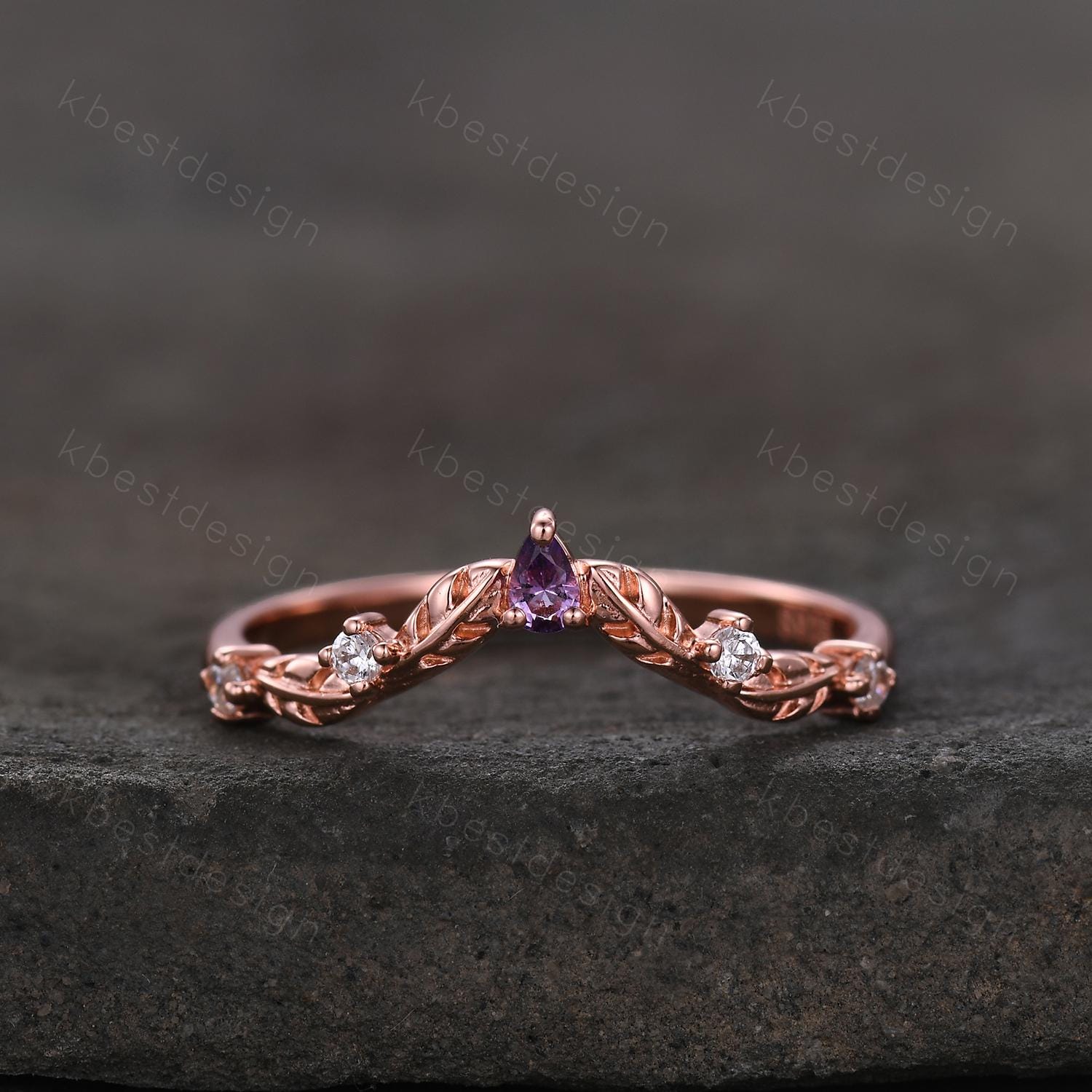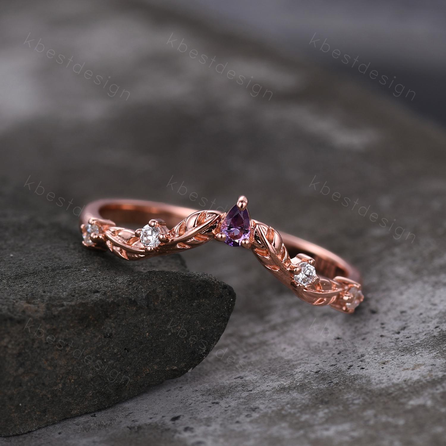 This is a Unique Curved Amethyst Wedding Band Women Rose Gold Band Nature Leaf Style Stacking Moissanite Band Bridal Anniversary Ring.