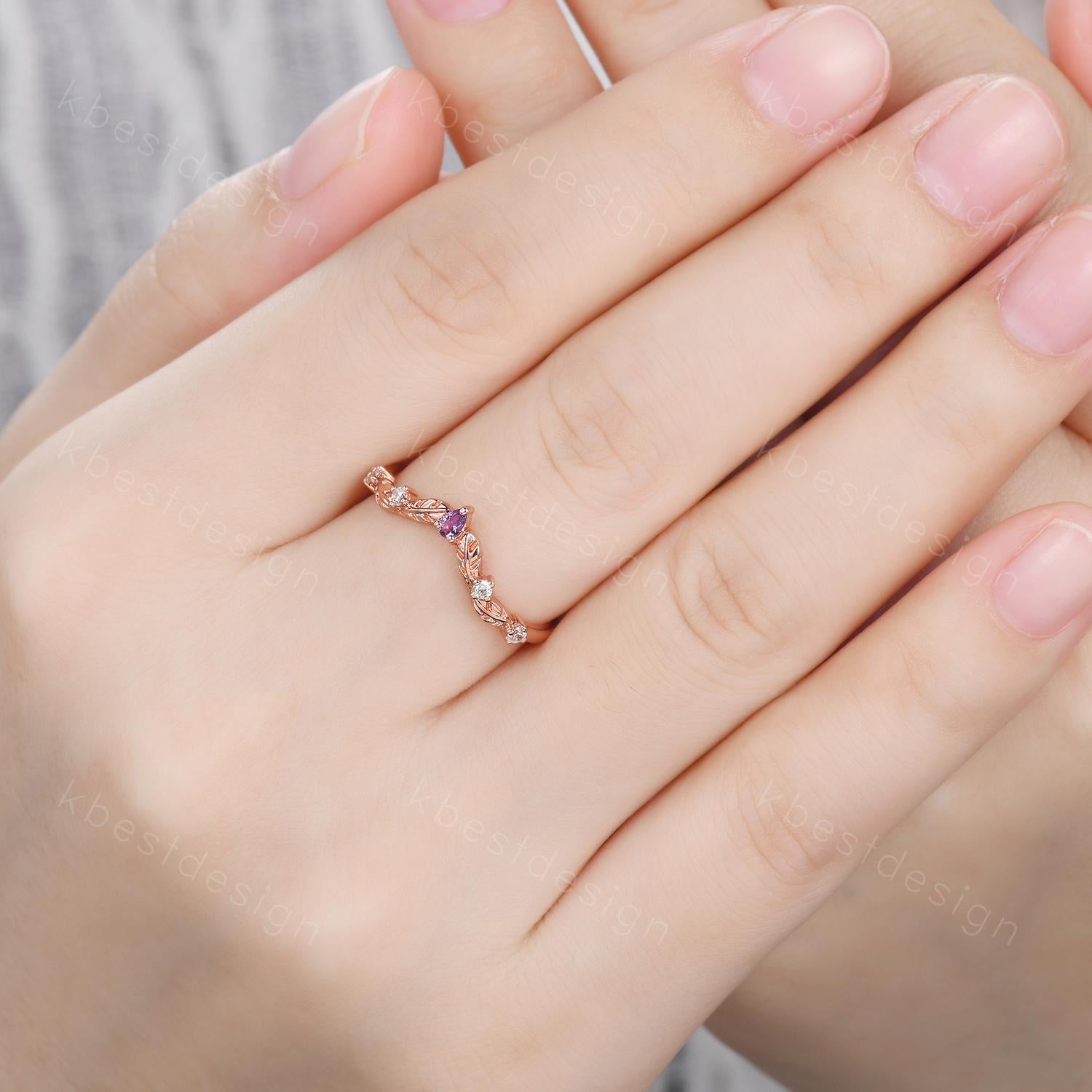 Unique Curved Amethyst Wedding Band Women Rose Gold Band Nature Leaf Style Stacking Moissanite Band Bridal Anniversary Ring