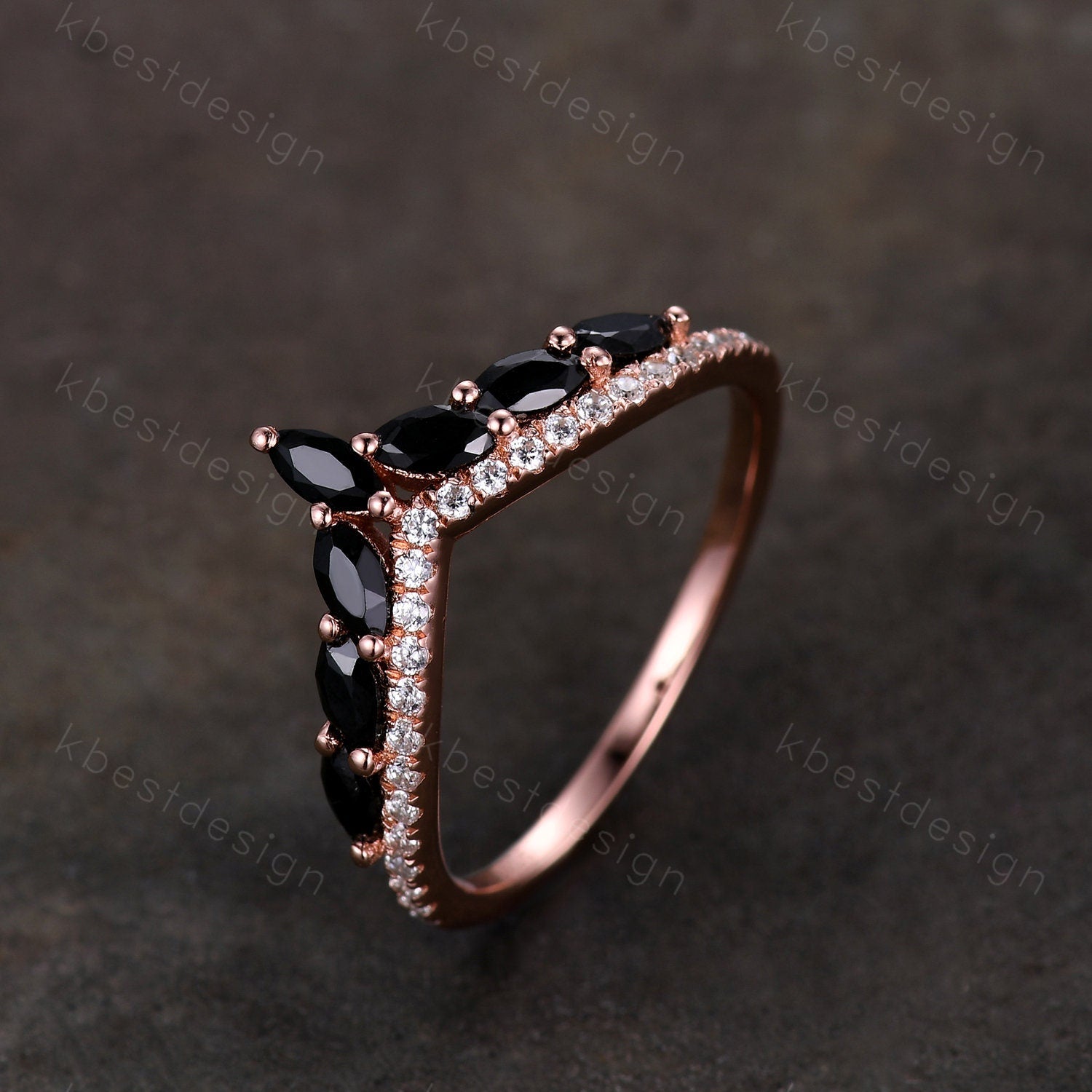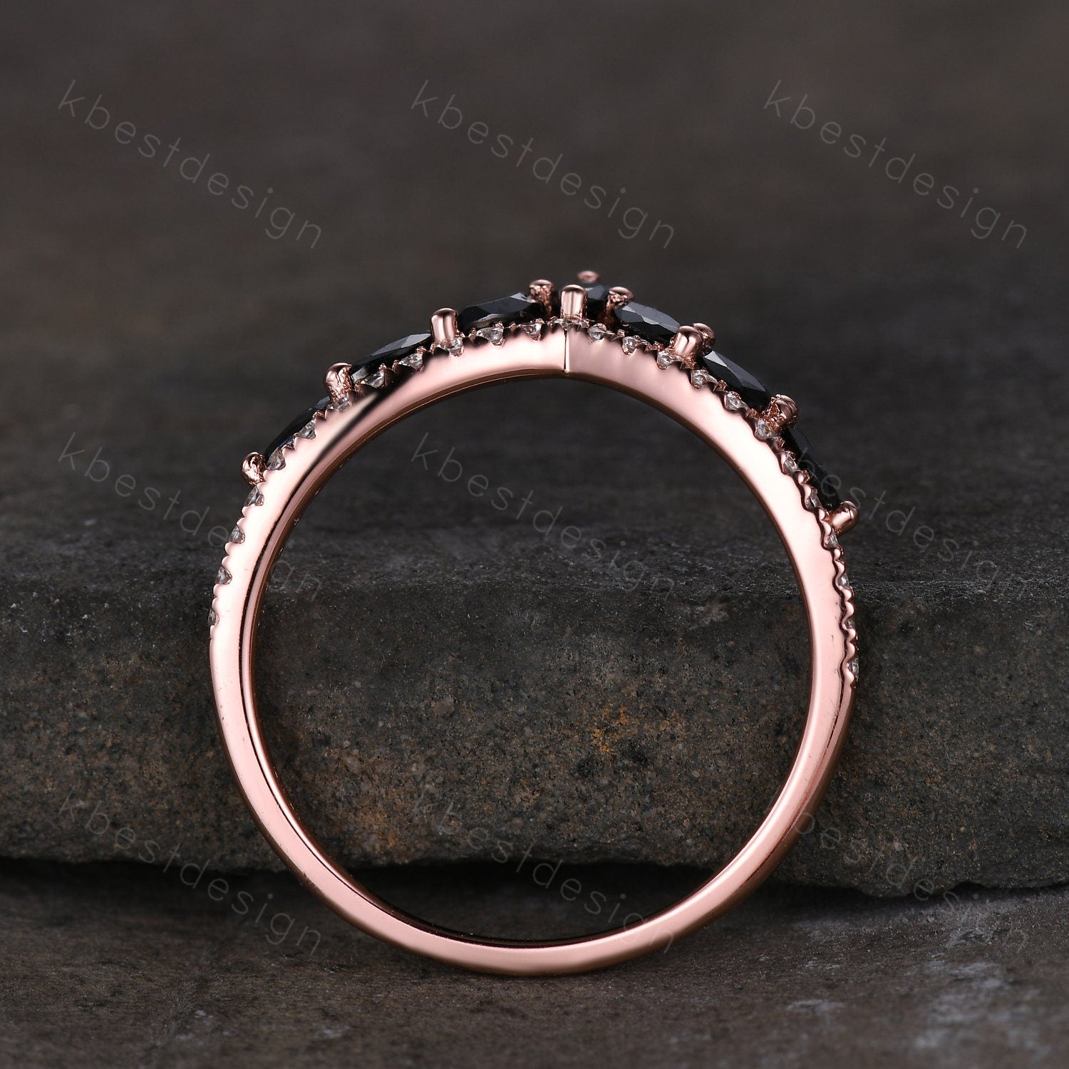 Unique Curved Black Onyx Wedding Band Vintage Marquise cut Black Onyx Cluster Ring Women Rose Gold Moissanite Stacking Bridal Wedding Ring