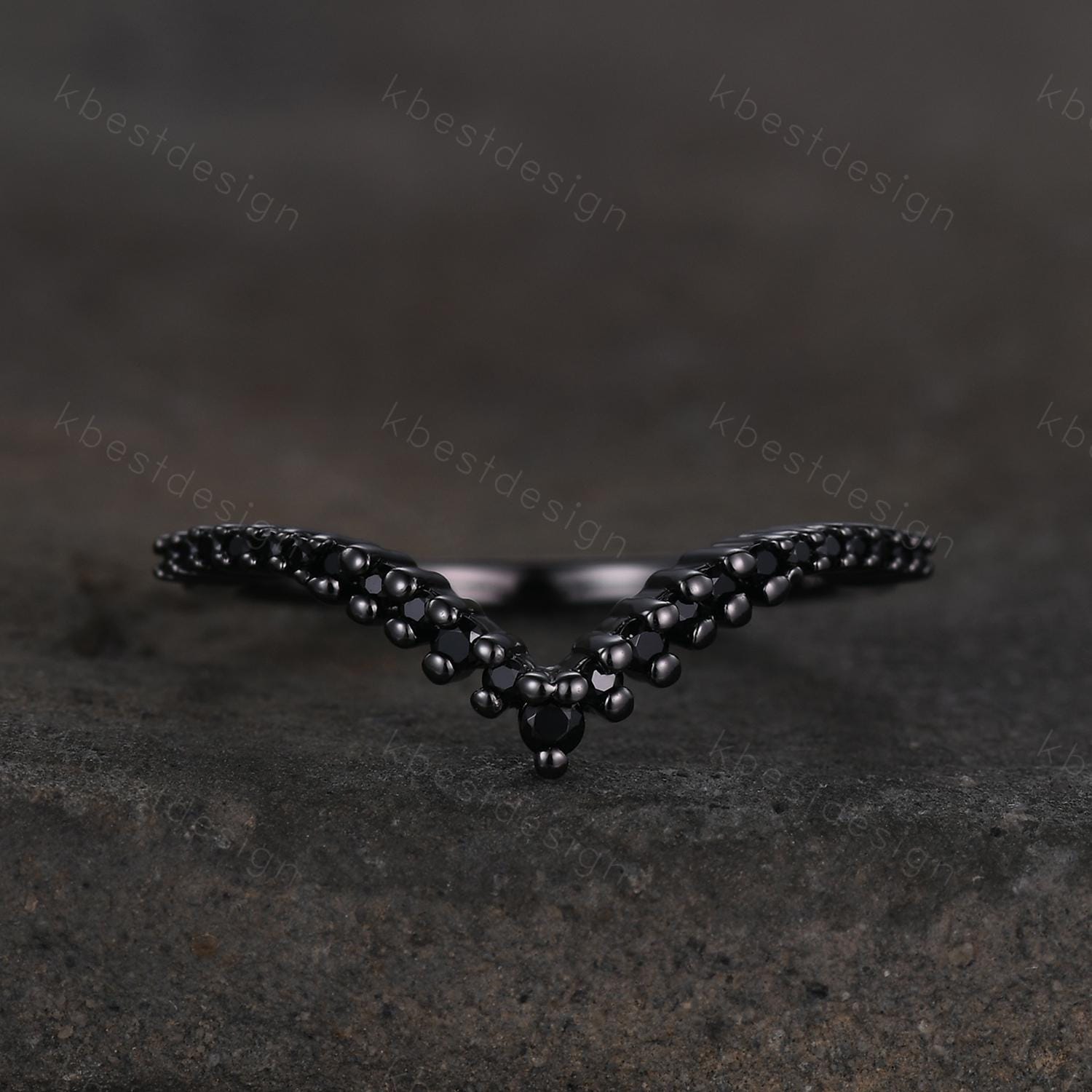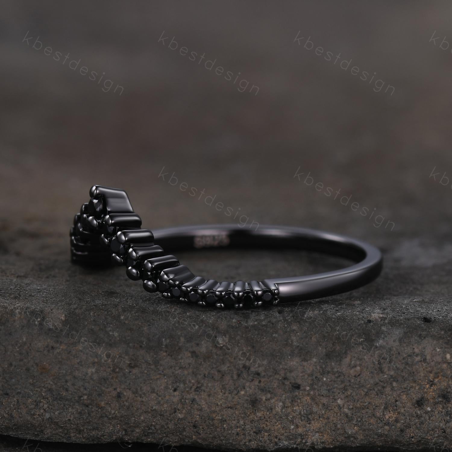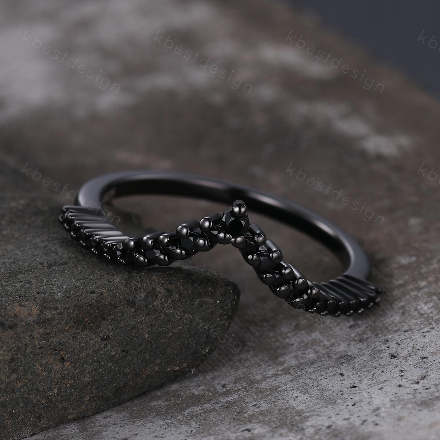 Unique curved black spinel wedding band dainty black gold band for women half eternity stacking matching band bridal anniversary band gift