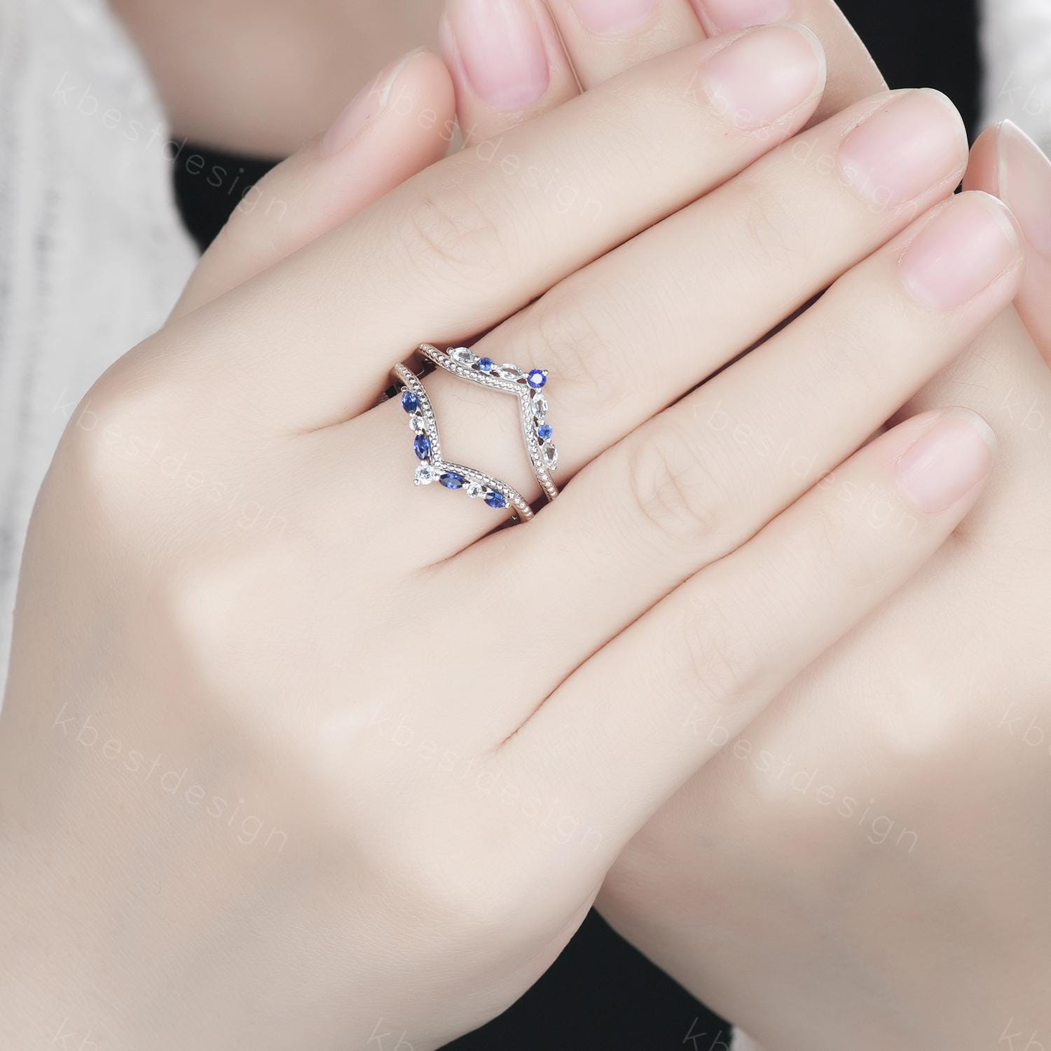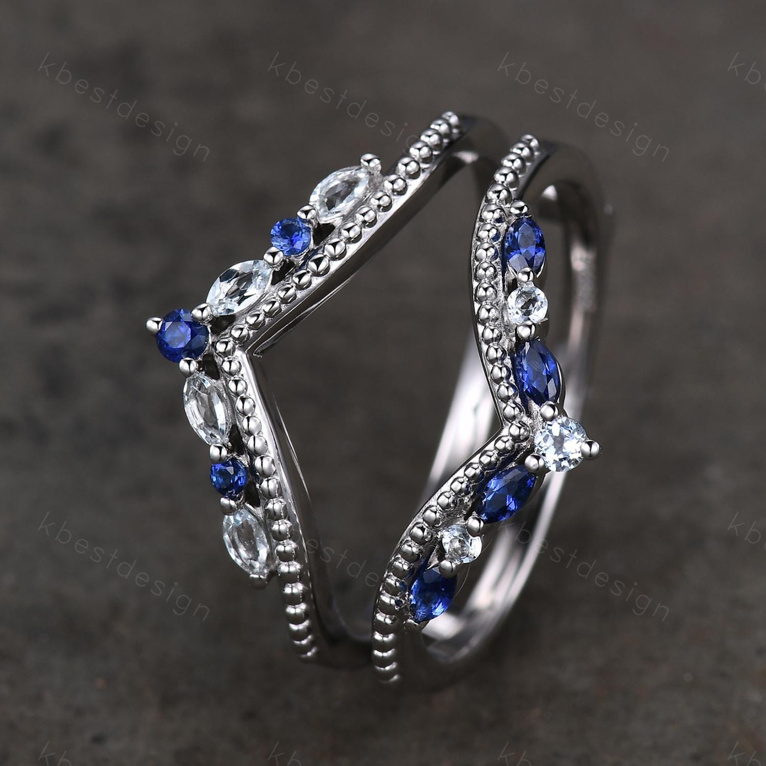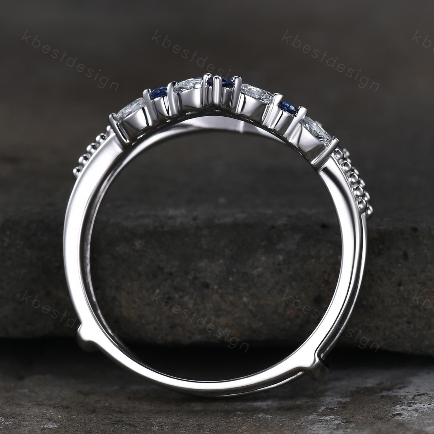 Unique curved Blue Sapphire wedding band art deco double curved aquamarine stacking band vintage marquise enhancer bridal promise ring