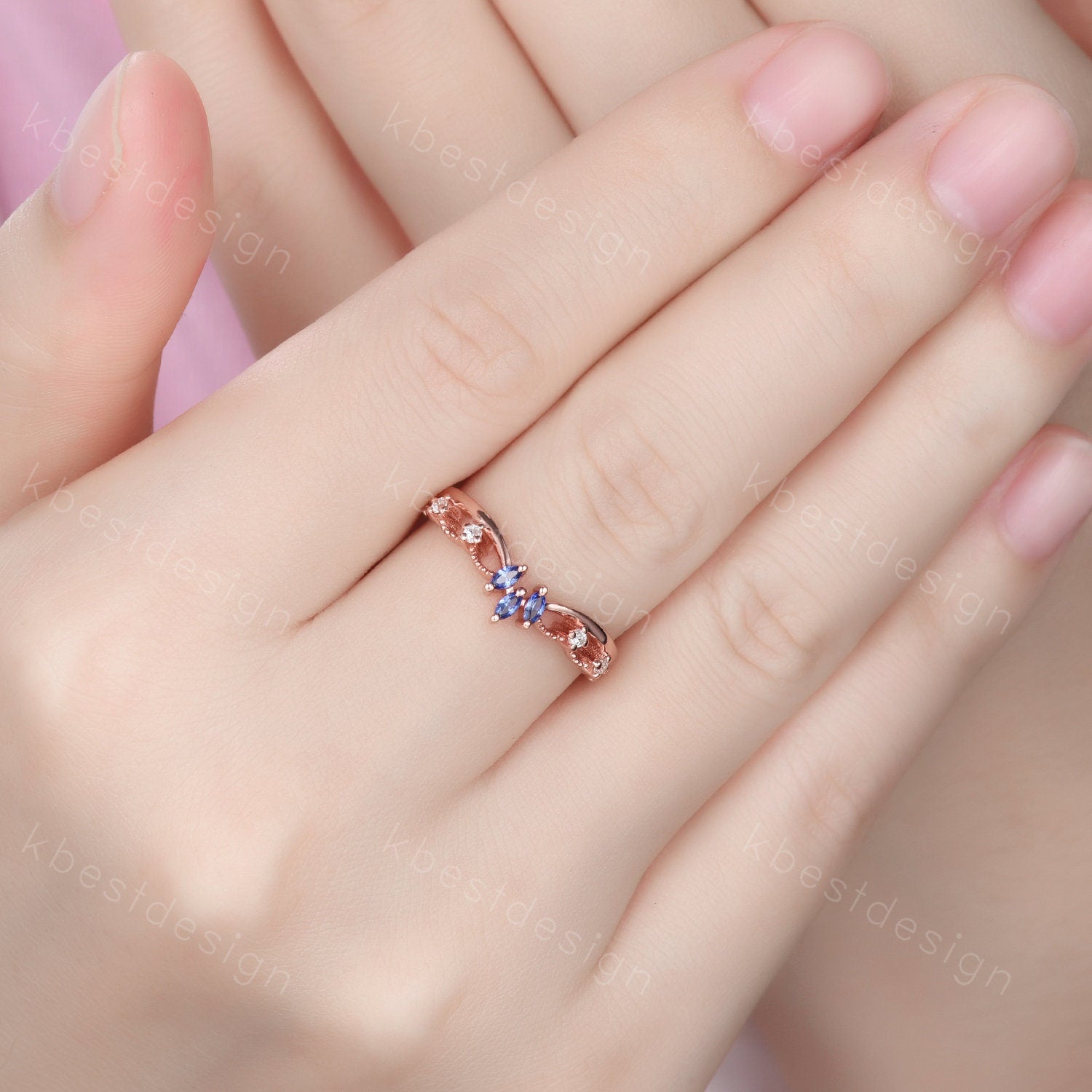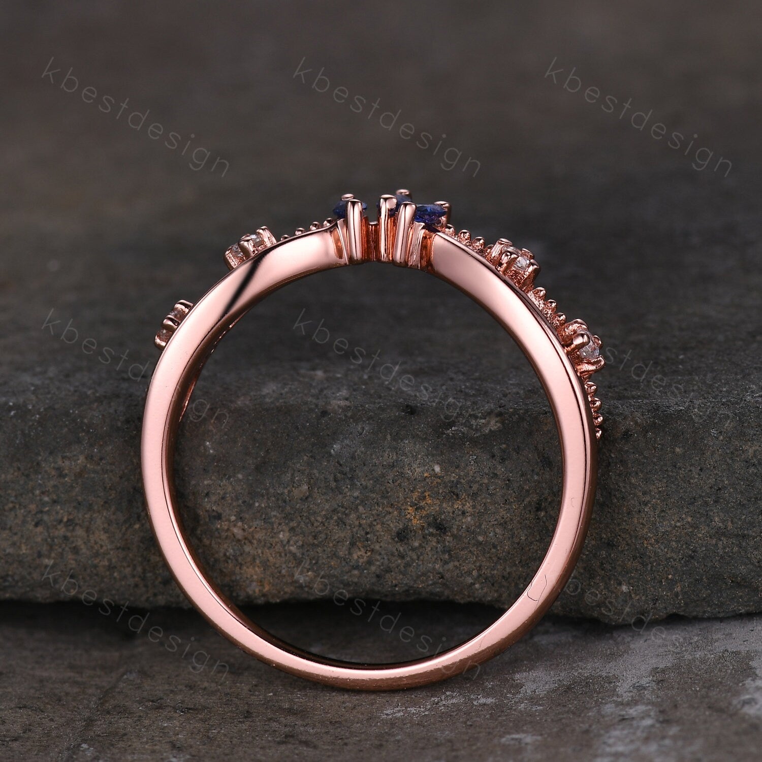 Unique curved blue sapphire wedding band art deco rose gold rings for women marquise cut blue sapphire ring antique moissanite stacking band
