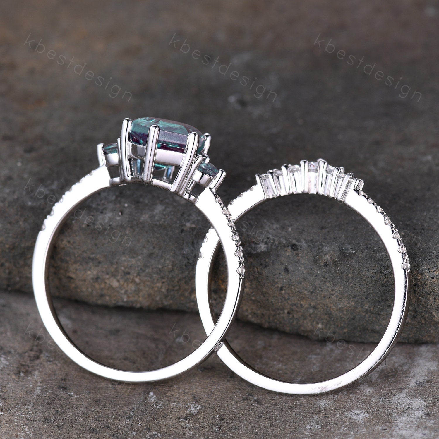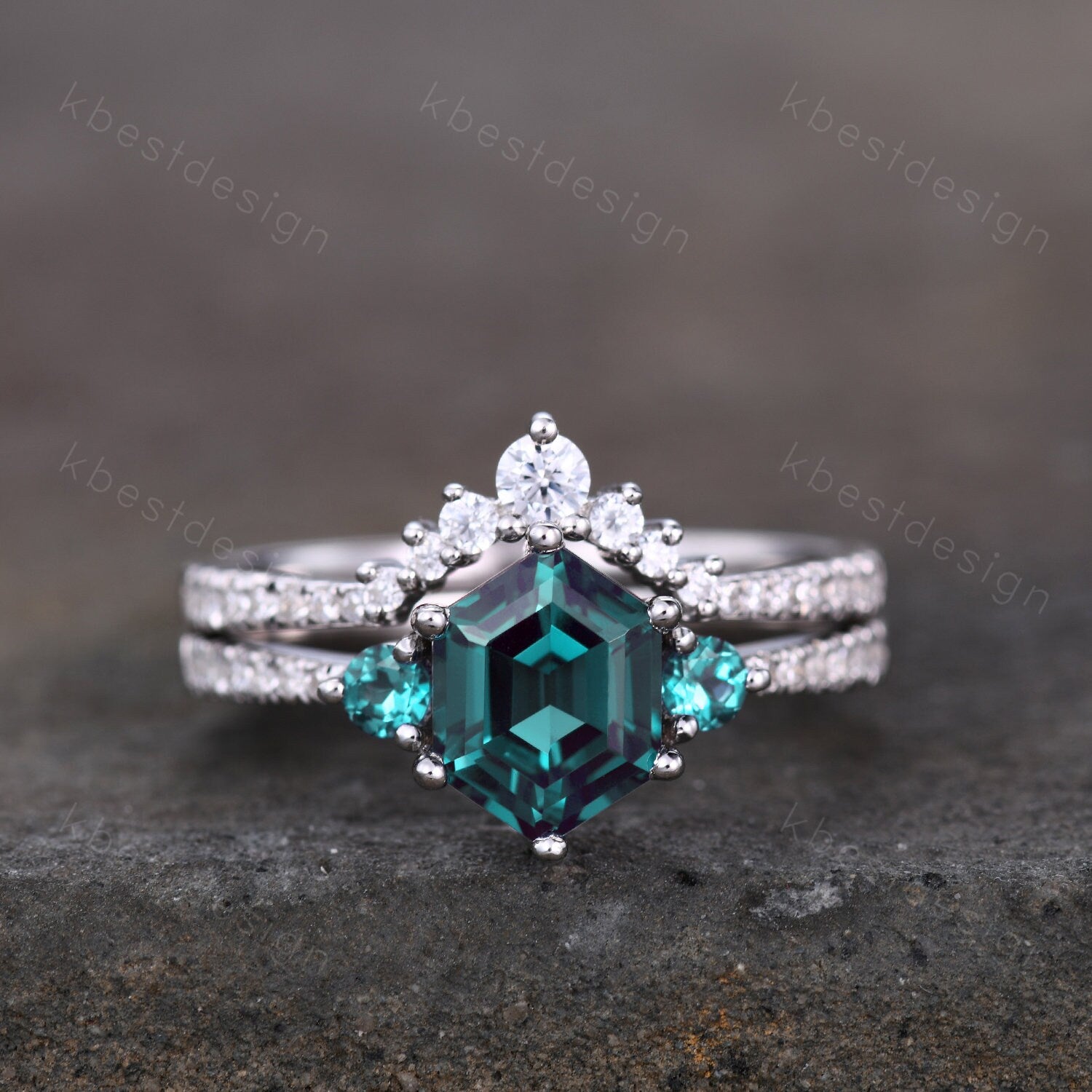 Unique Hexagon Cut Alexandrite Engagement Ring Set Women White Gold Rings Vintage Three Stone Bridal Wedding Set Promise Anniversary Gift