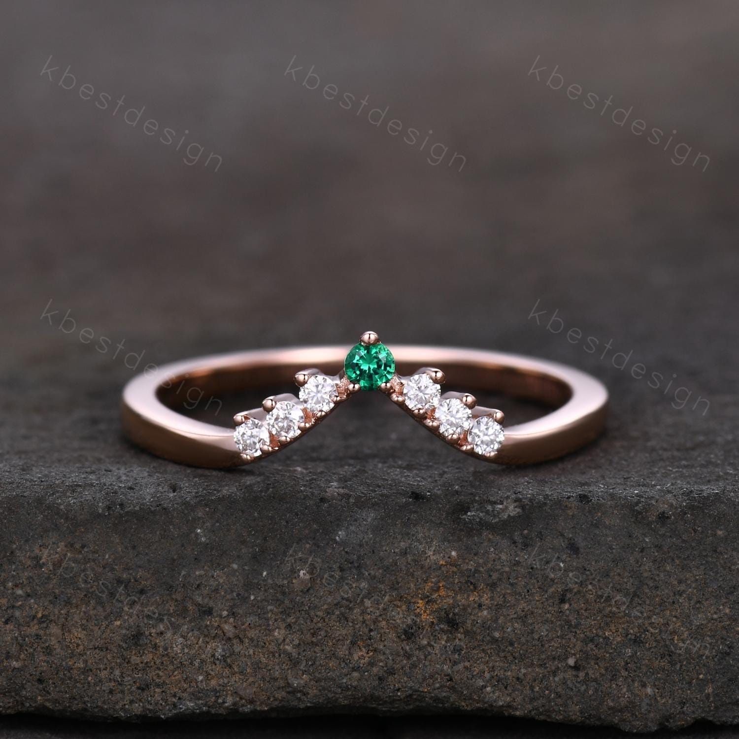 This is a Unique moissanite emerald wedding band dainty rose gold band for women curved stacking matching band bridal anniversary band gift .