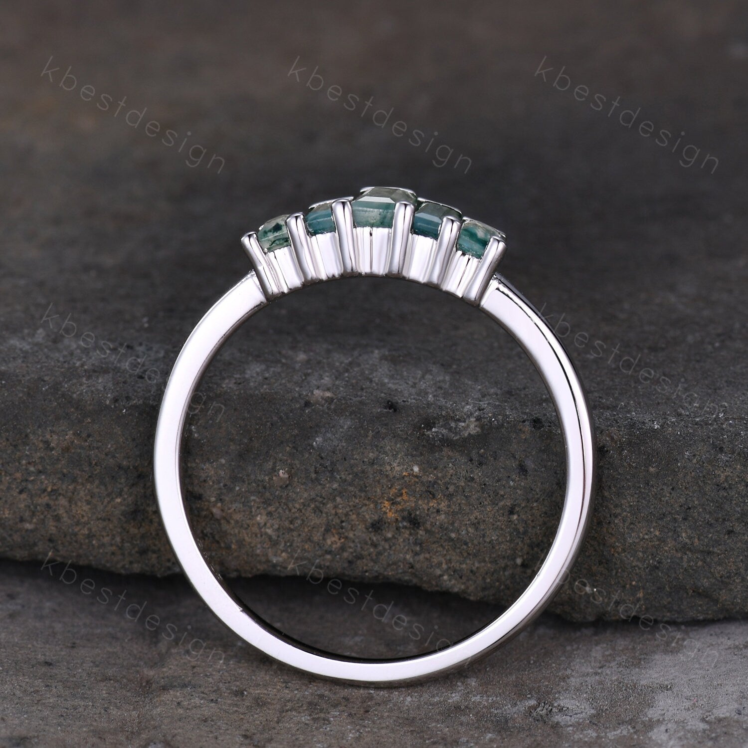 Unique Moss Agate Wedding Ring Sterling Silver Baguette cut Ring Green Moss agate Cluster ring Five Stone Ring Art Deco Stacking Band