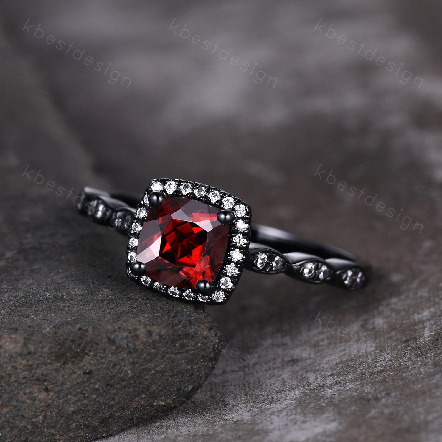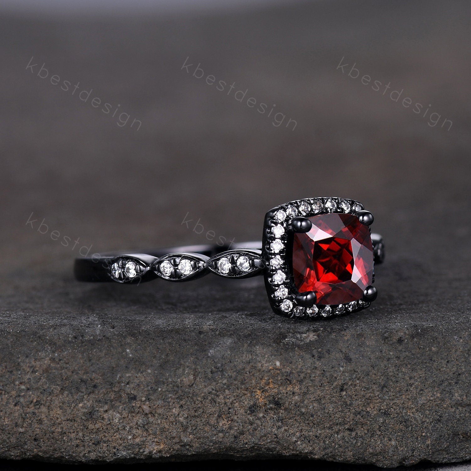 Unique red garnet ring vintage cushion cut garnet engagement ring 14k black gold ring January birthstone ring moissanite anniversary ring