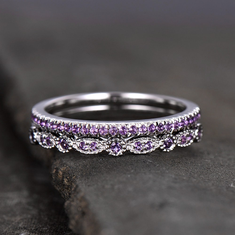 Unique Sterling Silver Ring Amethyst Wedding Ring Set Art Deco Wedding Band Half Eternity Matching Band Anniversary Gift February Birthstone