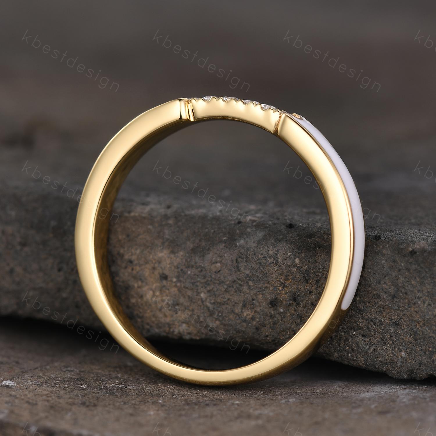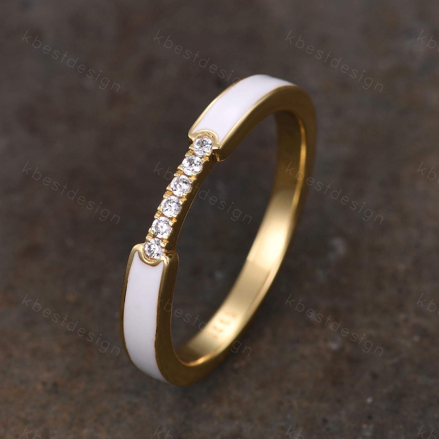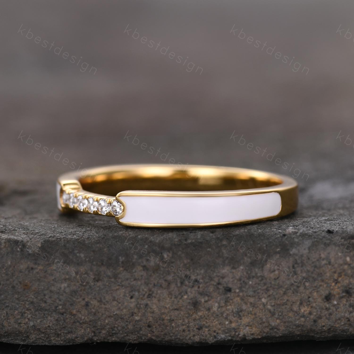 Unique White Enamel Wedding Band Solid 14k Yellow Gold Rings Moissanite Wedding Band Half Eternity Band Vintage Bridal Anniversary Ring